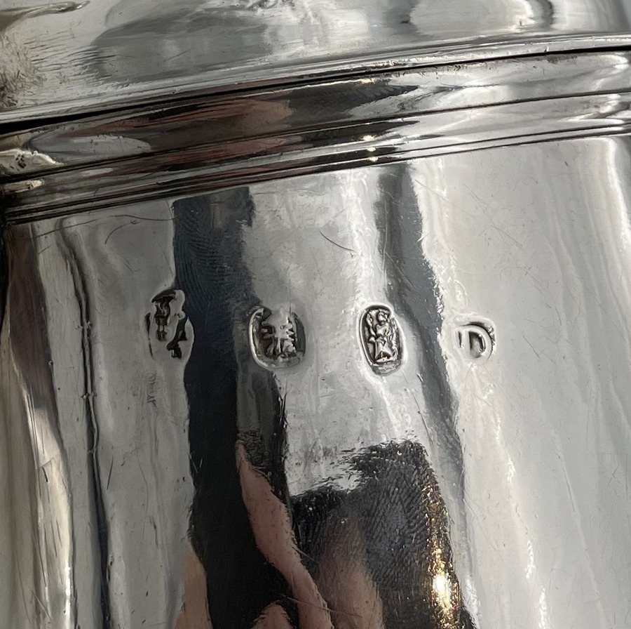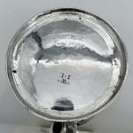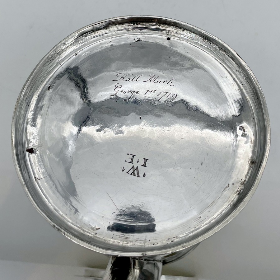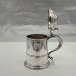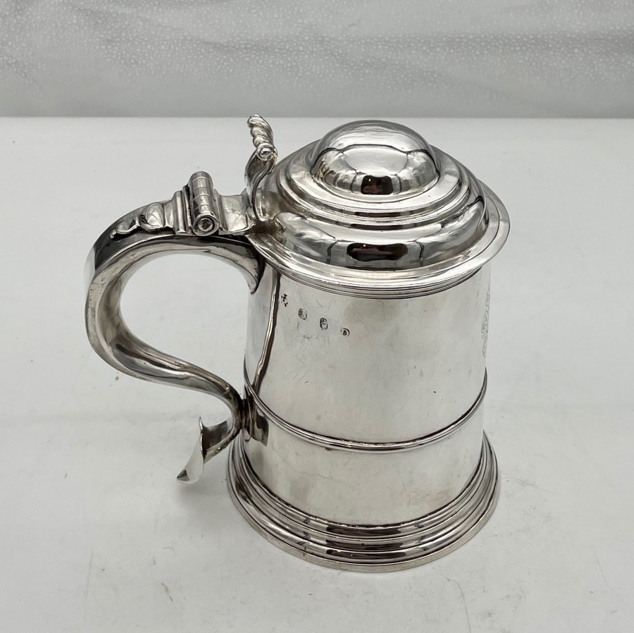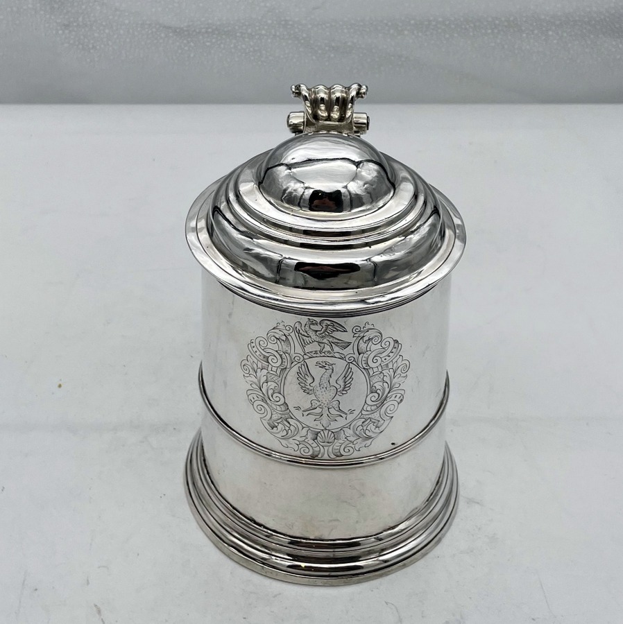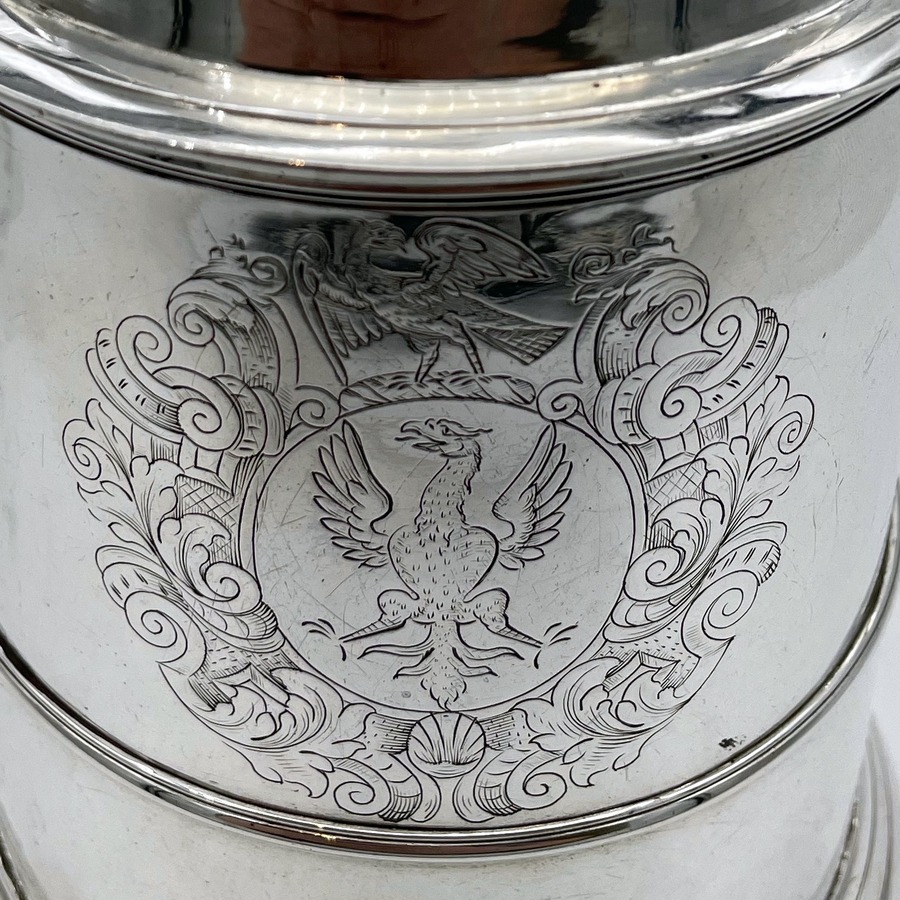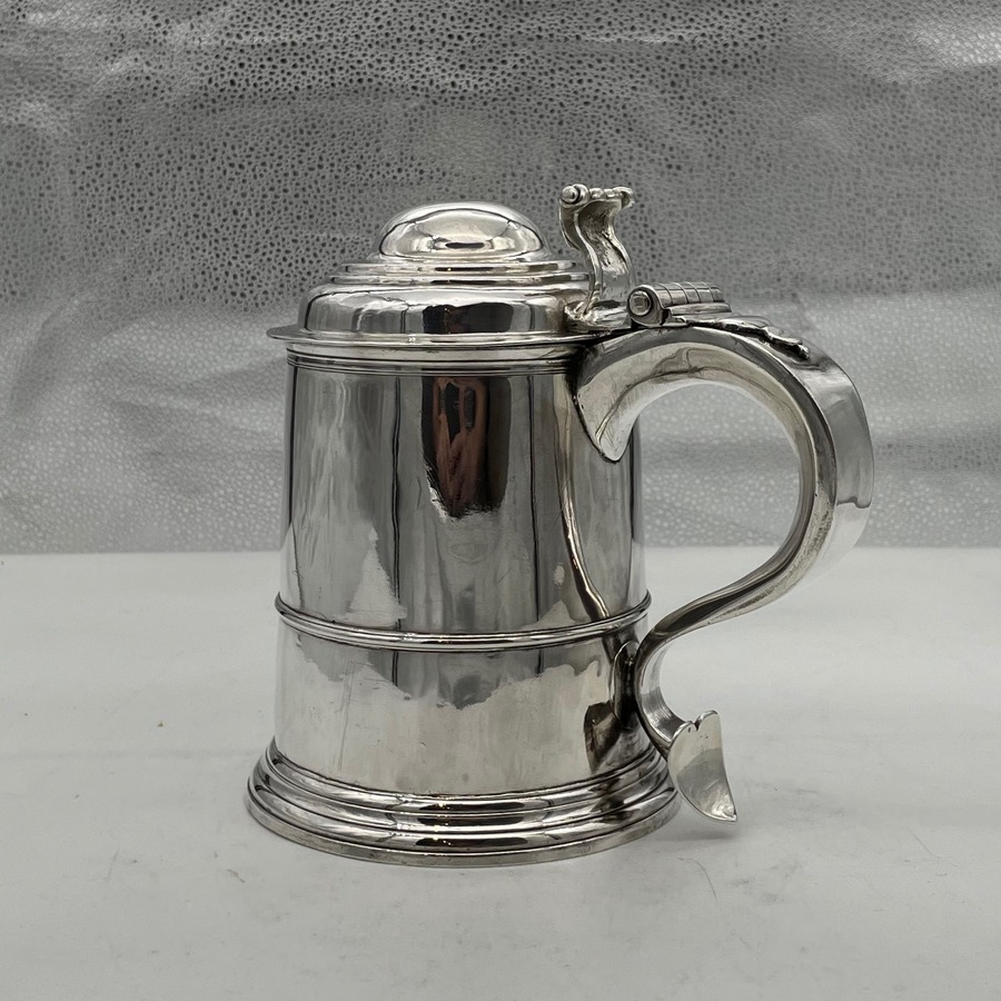 A rare and highly collectable Anne Tanqueray made Britannia silver quart tankard designed with an elegant slight tapering body which has a central girdle above which sits a truly impressive hand engraved contemporary armorial which is purposely positioned to be the central focal point of decoration and importance of the tankard. Â The hinged lid is domed and there is a stylish foliate volute type thumbpiece.