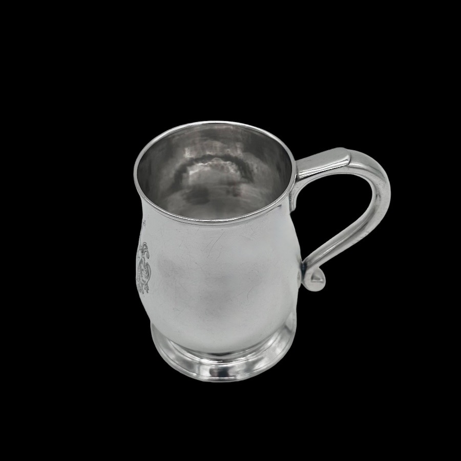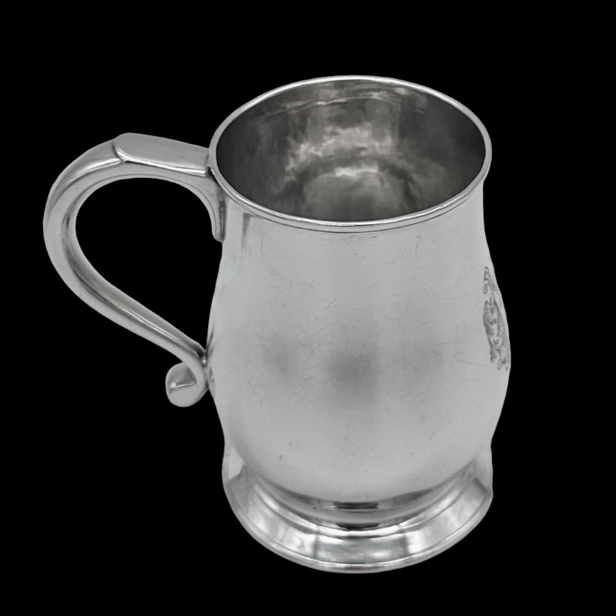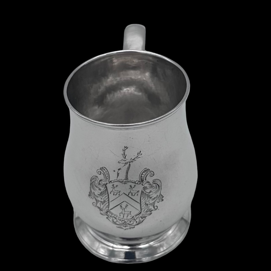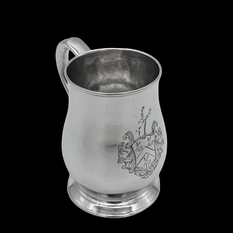 Fine George II sterling silver mug shaped with a beautifully proportioned baluster body which has an elegant original hand engraved armorial for importance. The handle is scroll formed and is capped with a incorporated thumbpiece.