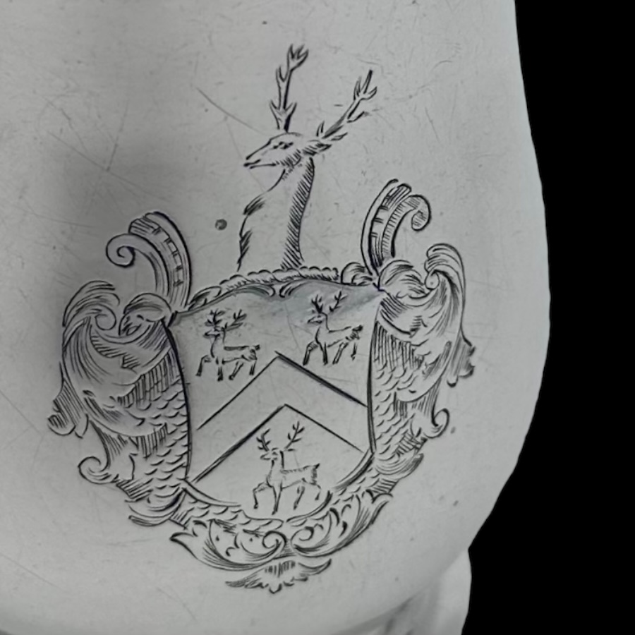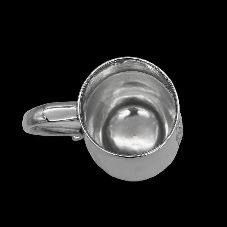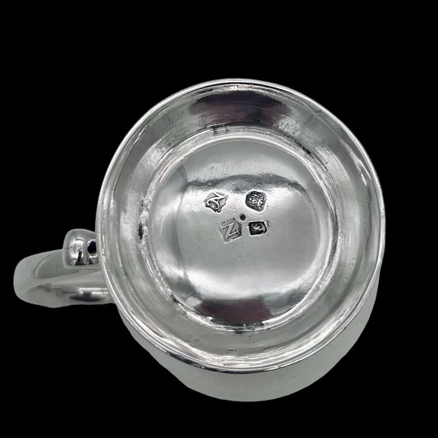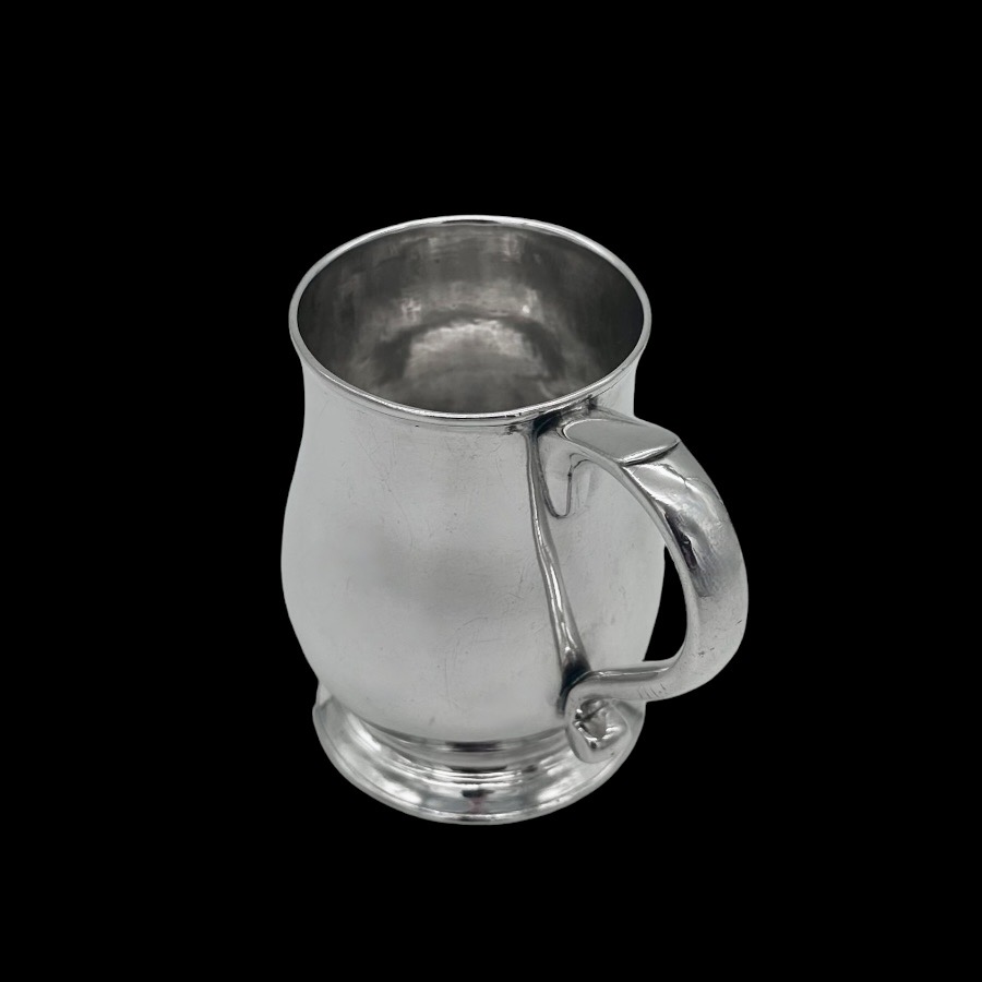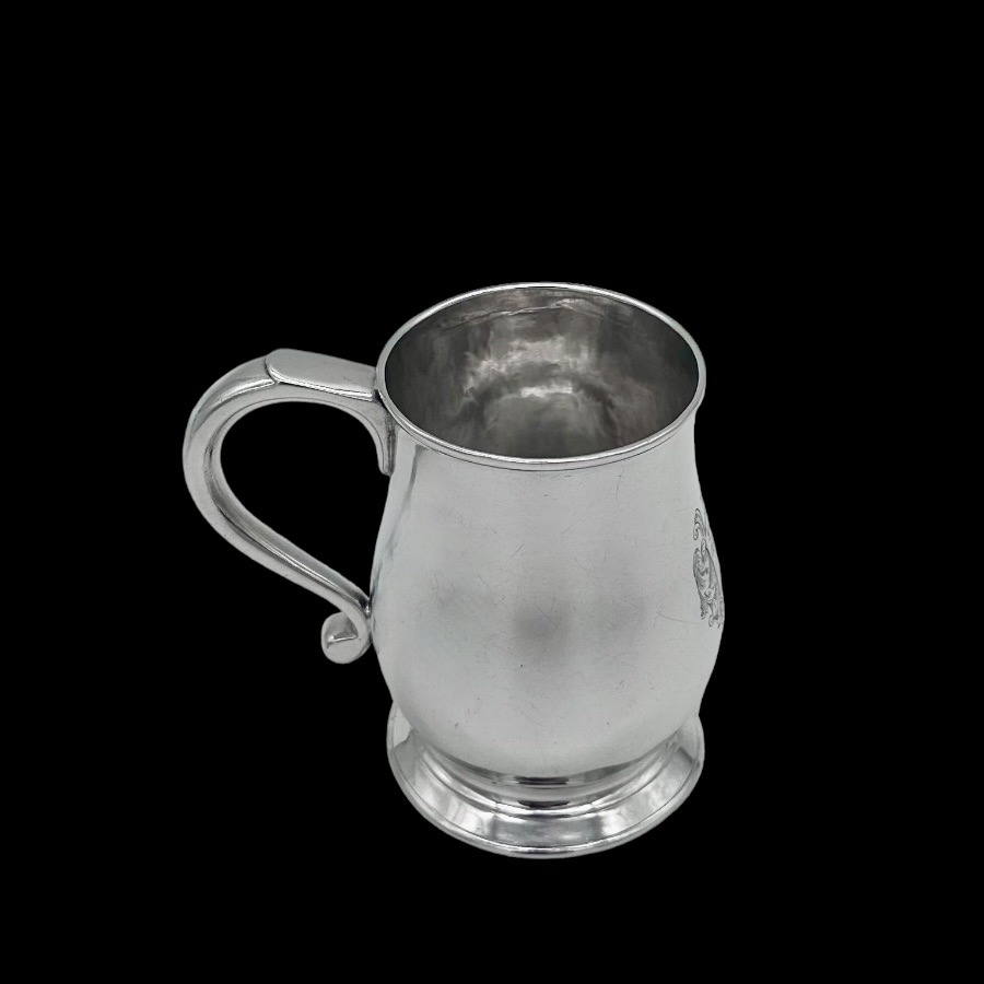 Fine George II sterling silver mug shaped with a beautifully proportioned baluster body which has an elegant original hand engraved armorial for importance. The handle is scroll formed and is capped with a incorporated thumbpiece.