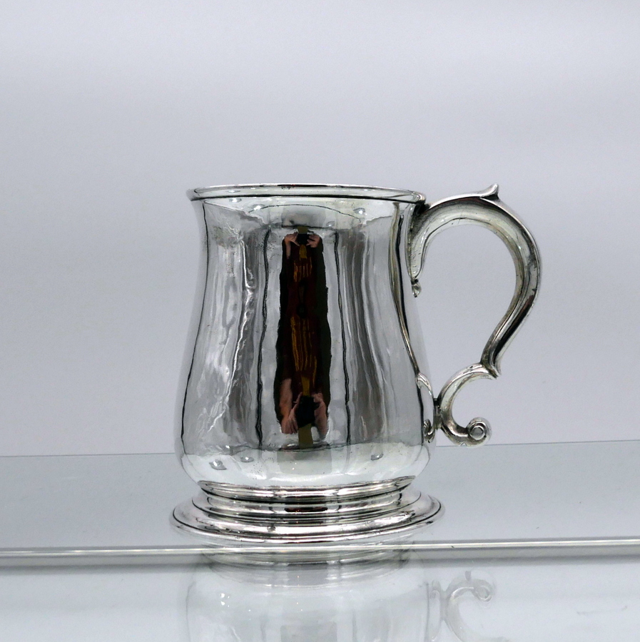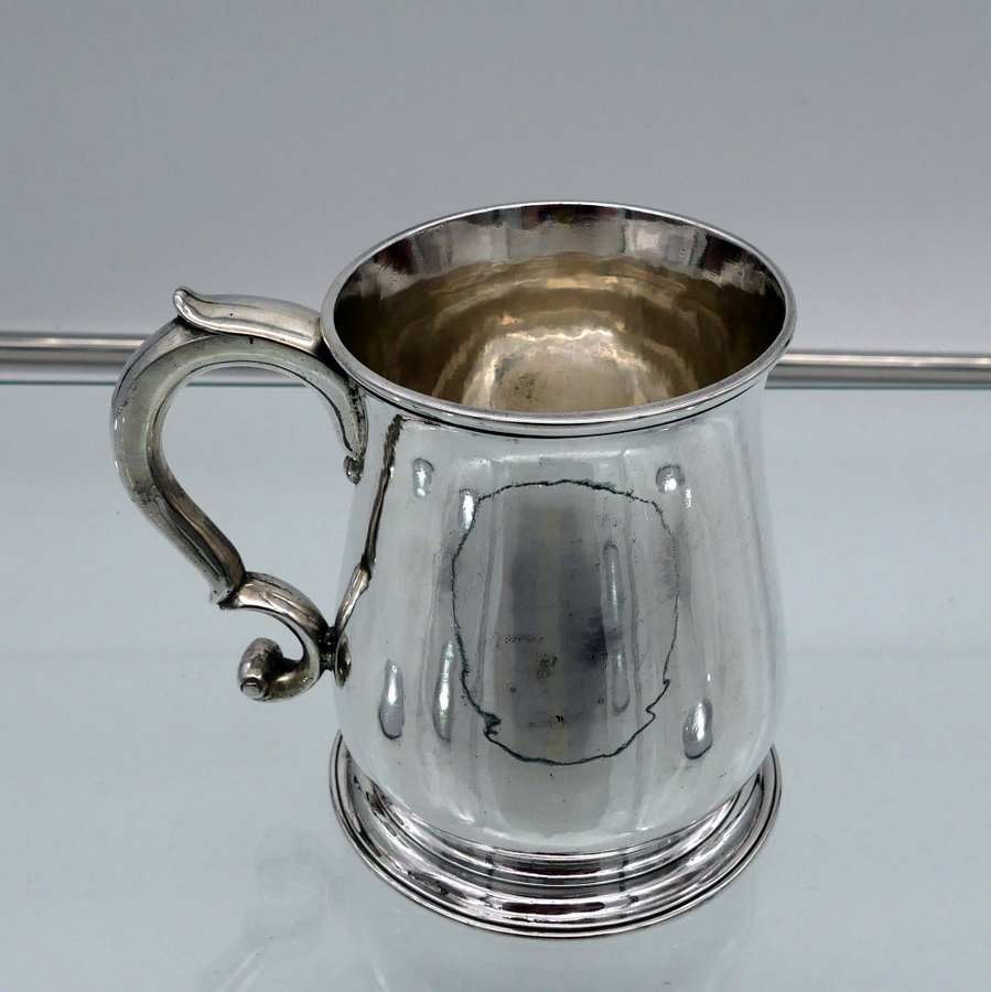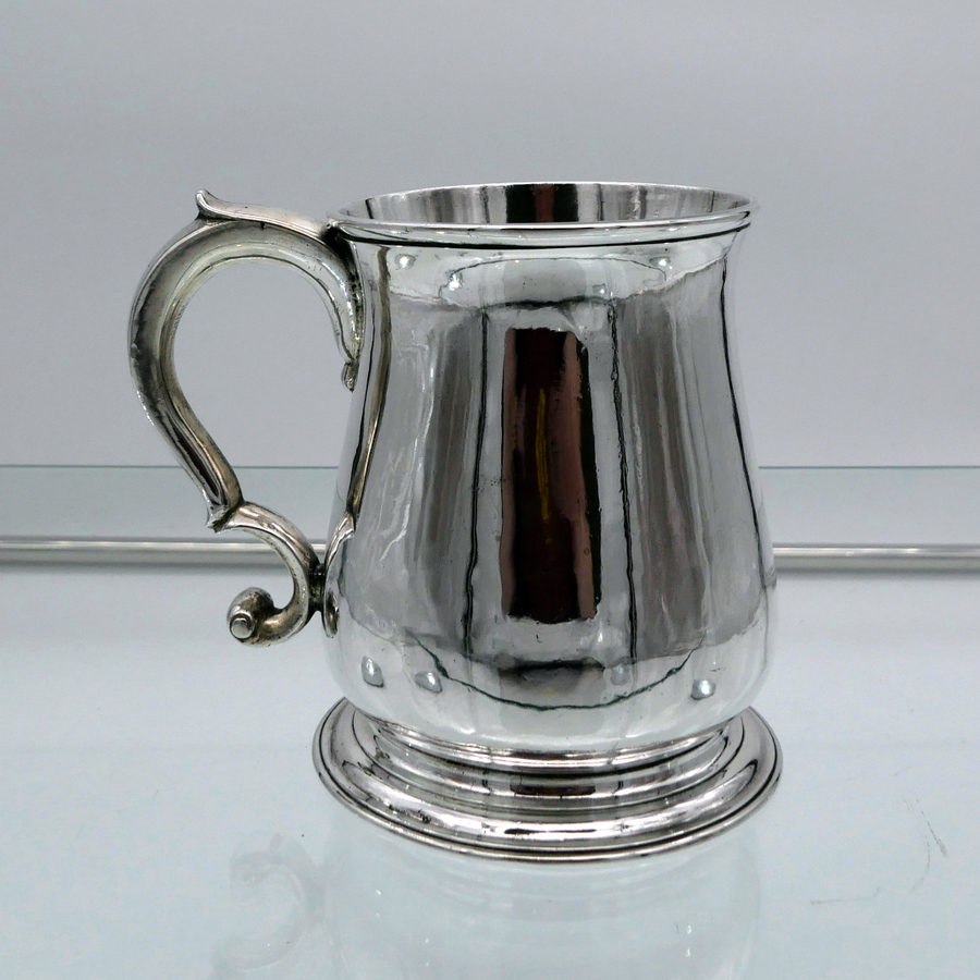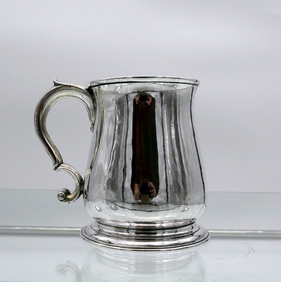A gorgeous early George II plain formed silver baluster shaped pint mug with applied cast formed double scroll handle which is mounted with a traditional tongue style thumbpiece. Â The underside has stylish contemporary hand engraved initials for importance.