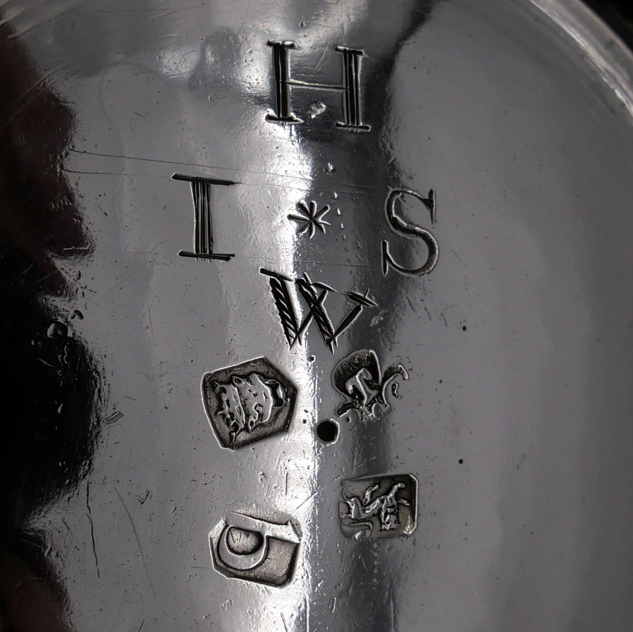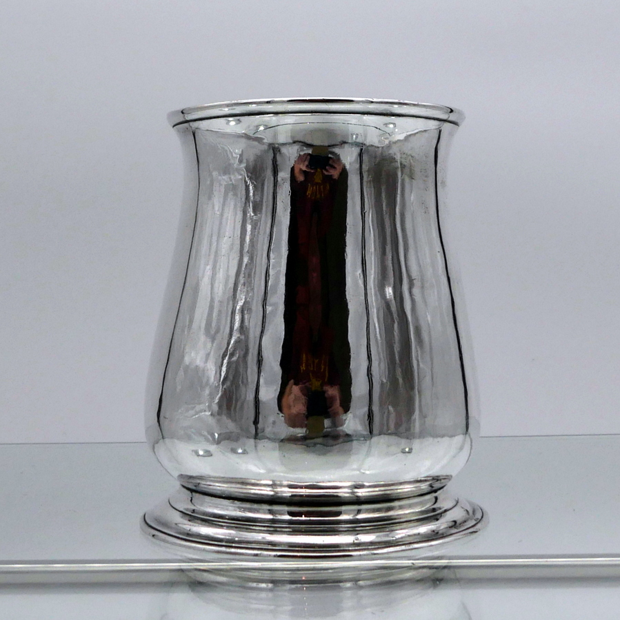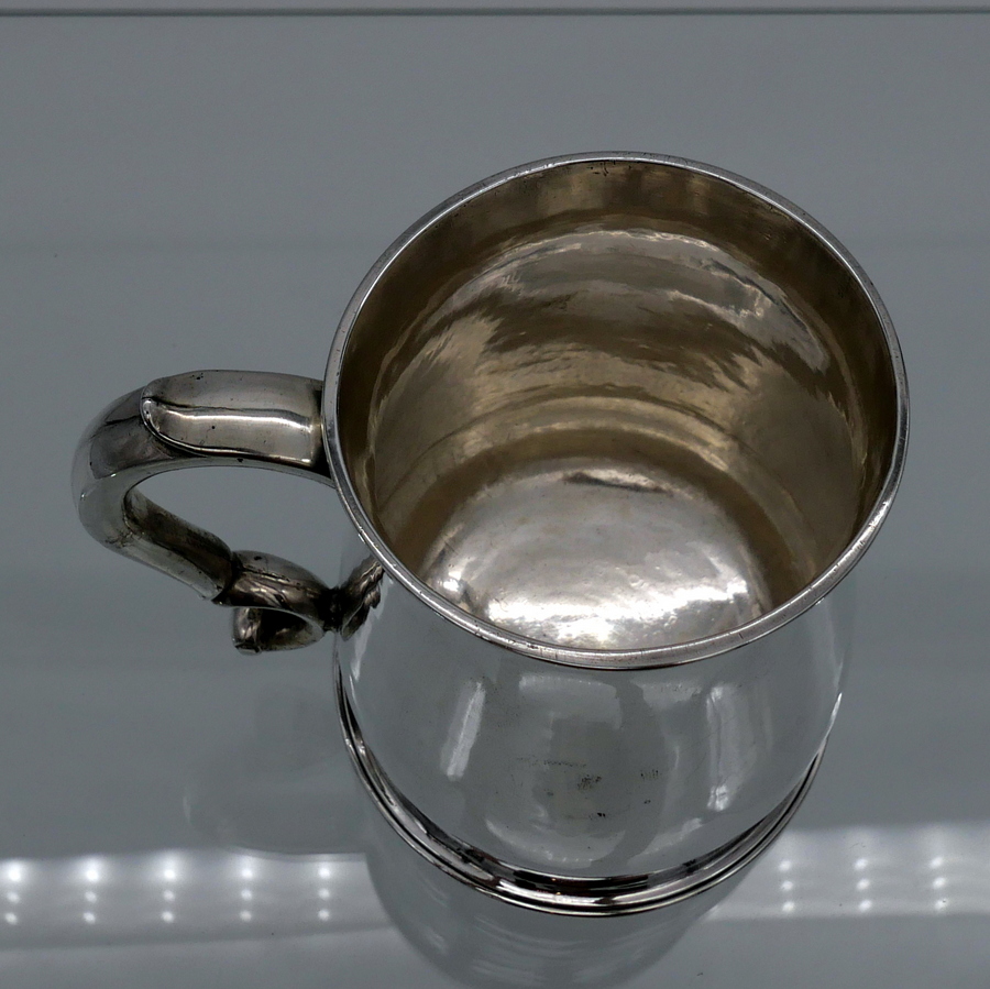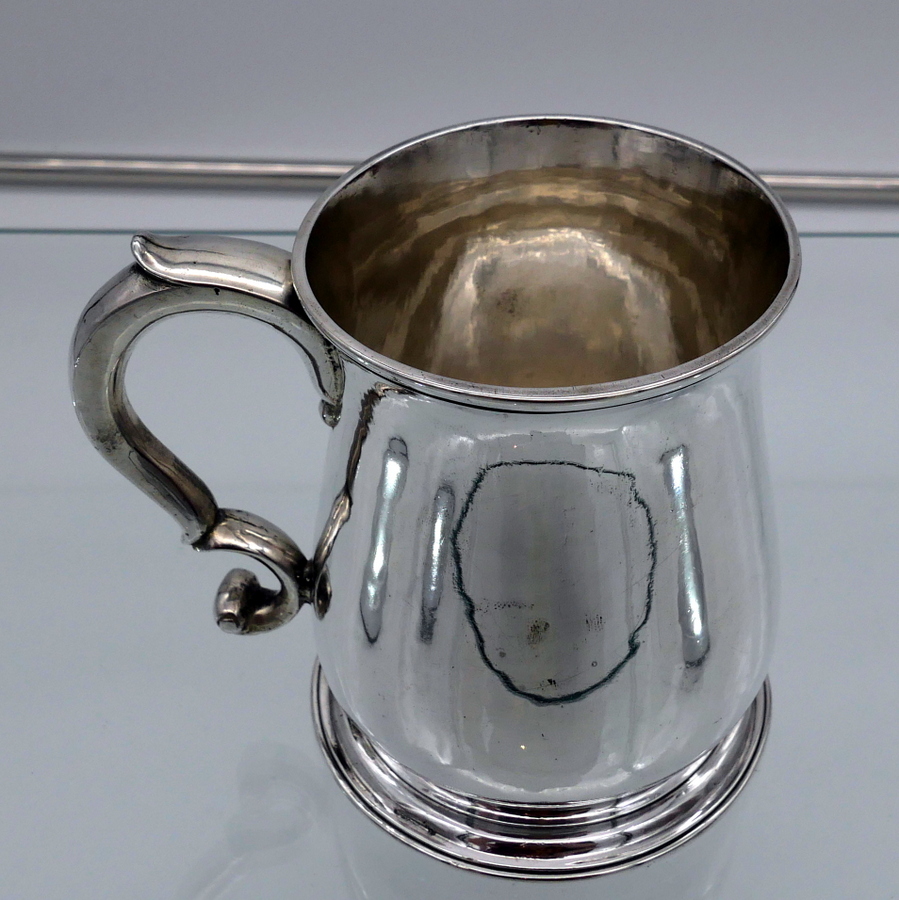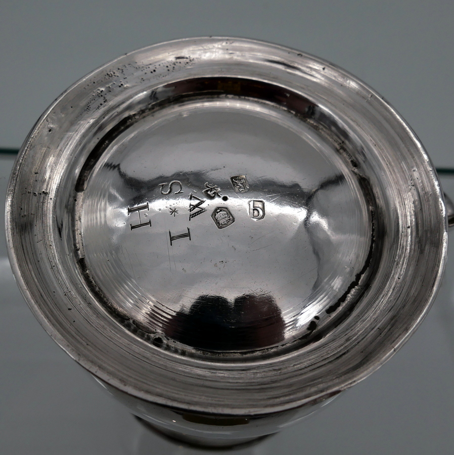 A gorgeous early George II plain formed silver baluster shaped pint mug with applied cast formed double scroll handle which is mounted with a traditional tongue style thumbpiece. Â The underside has stylish contemporary hand engraved initials for importance.