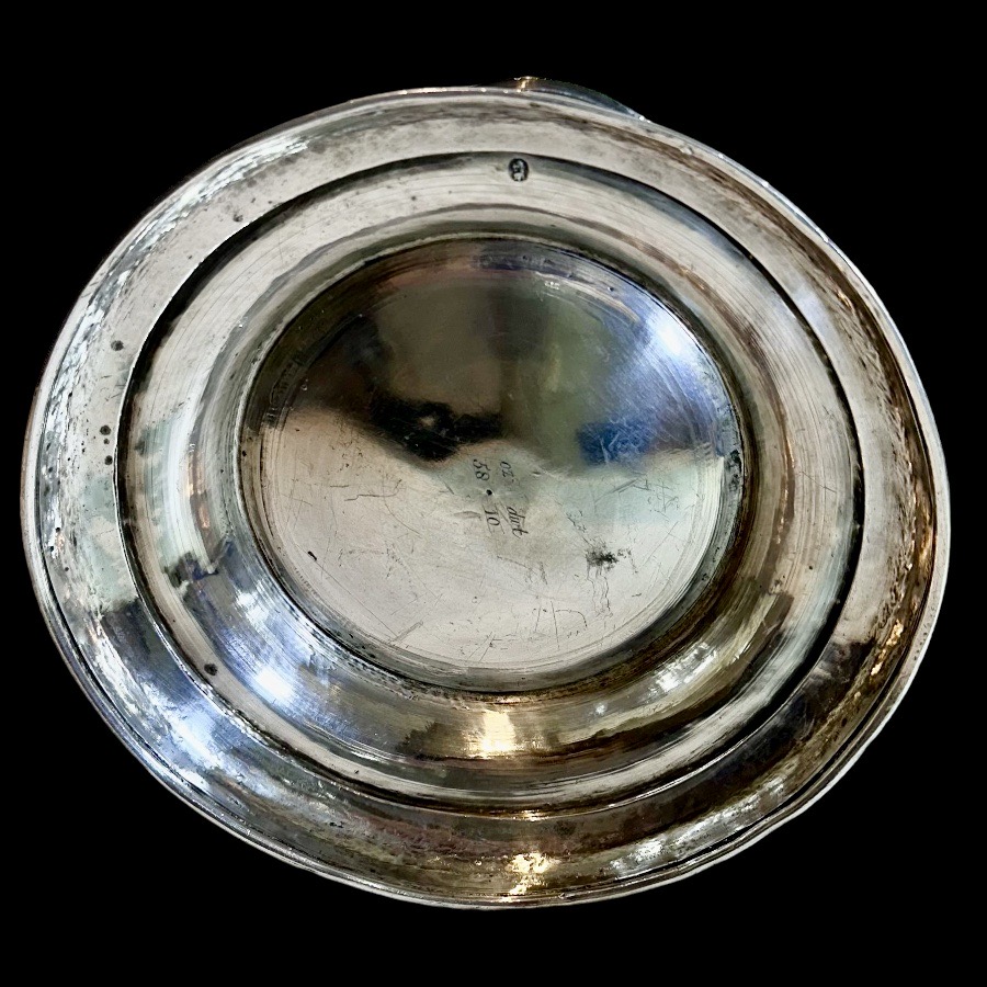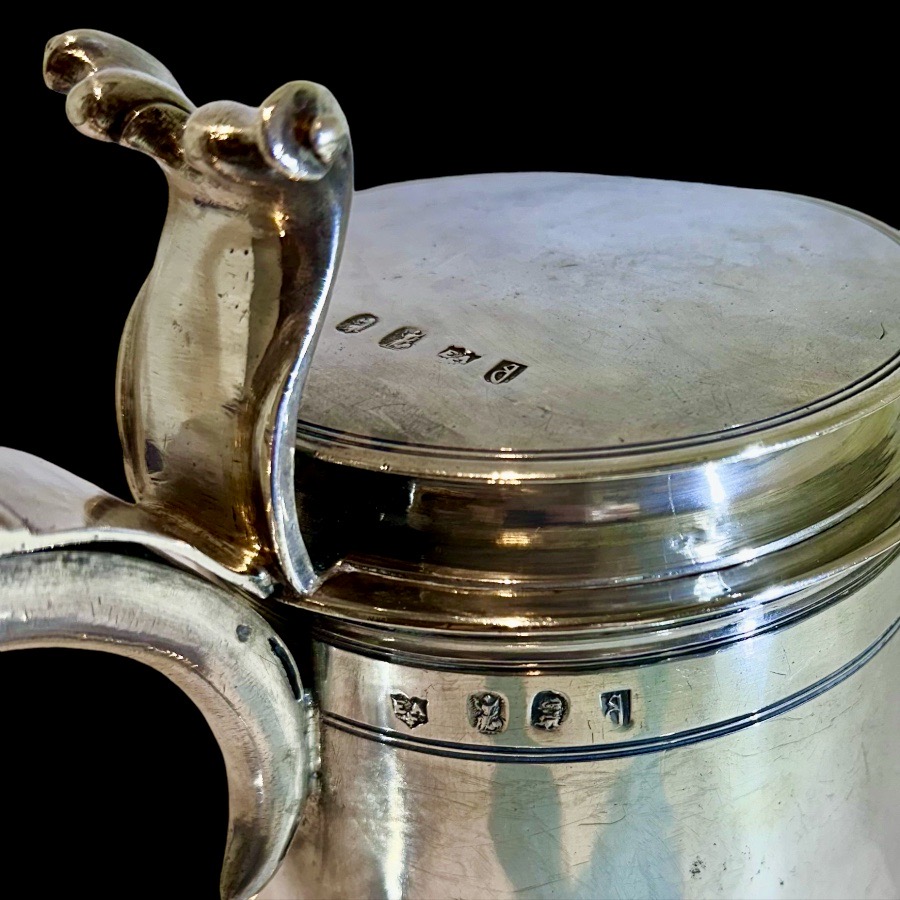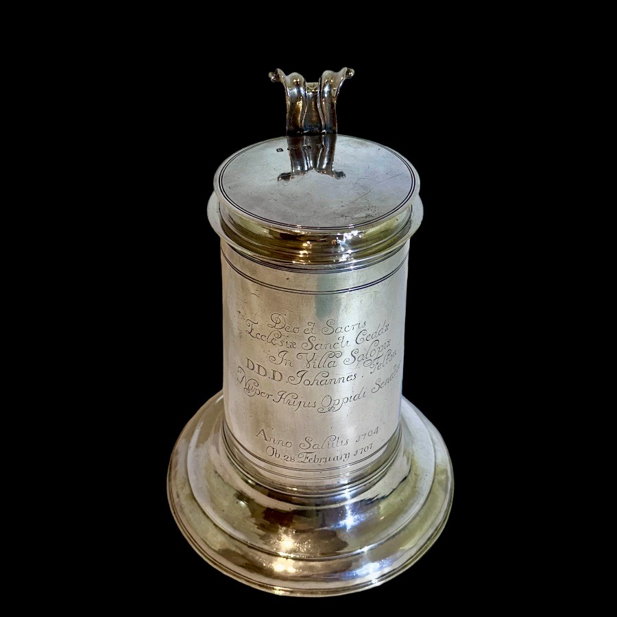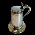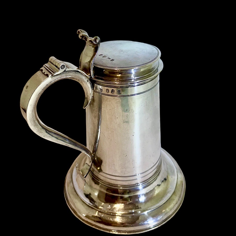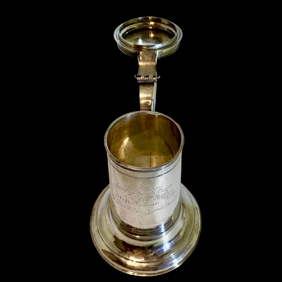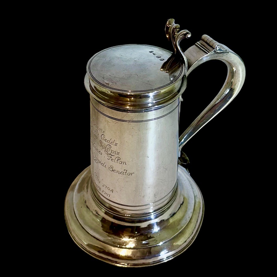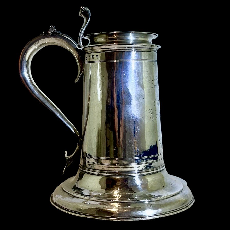 Incredibly rare large silver early 18th century flagon designed with a strikingly beautiful large skirt foot and wonderful shaped patent style hinged lid. The centre front has a wonderful original inscription which encaptures the uniqueness and history of this delightful piece of craftsmanship.