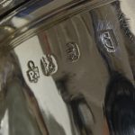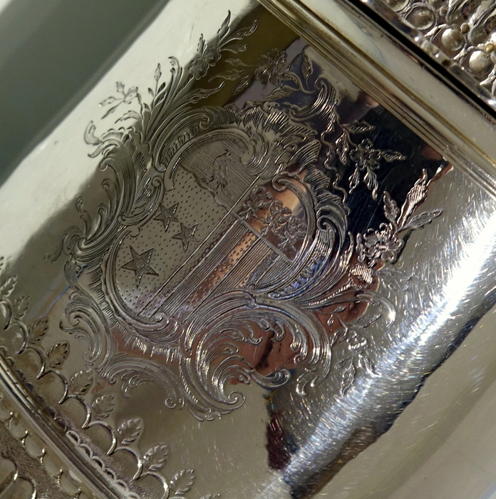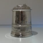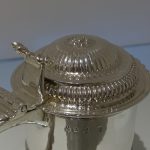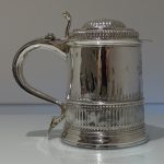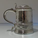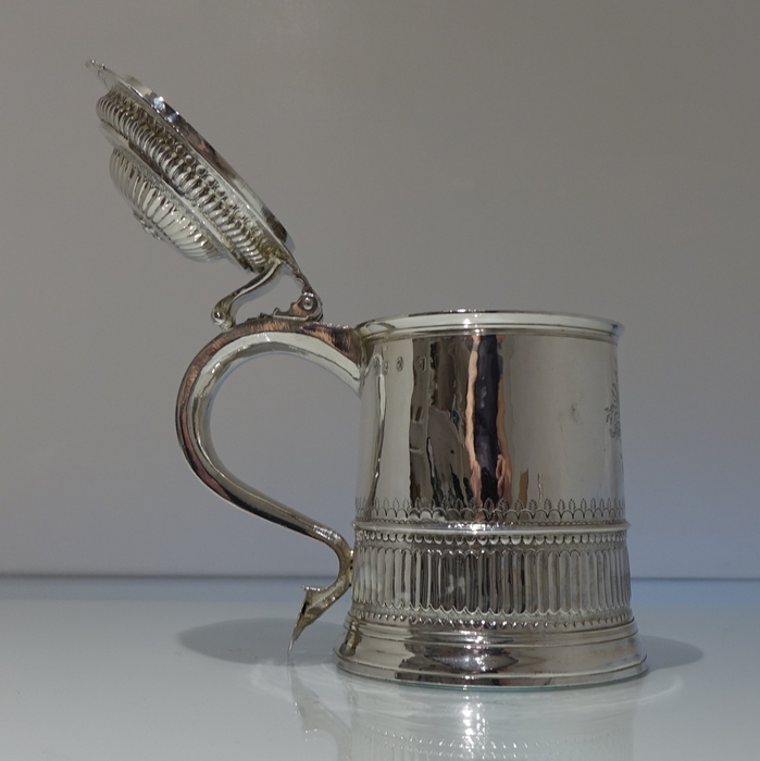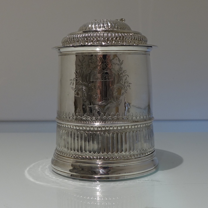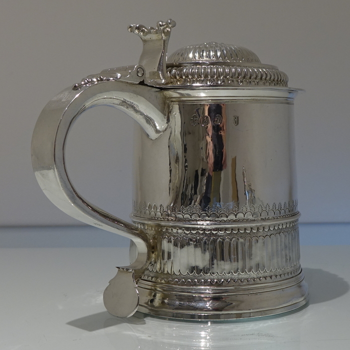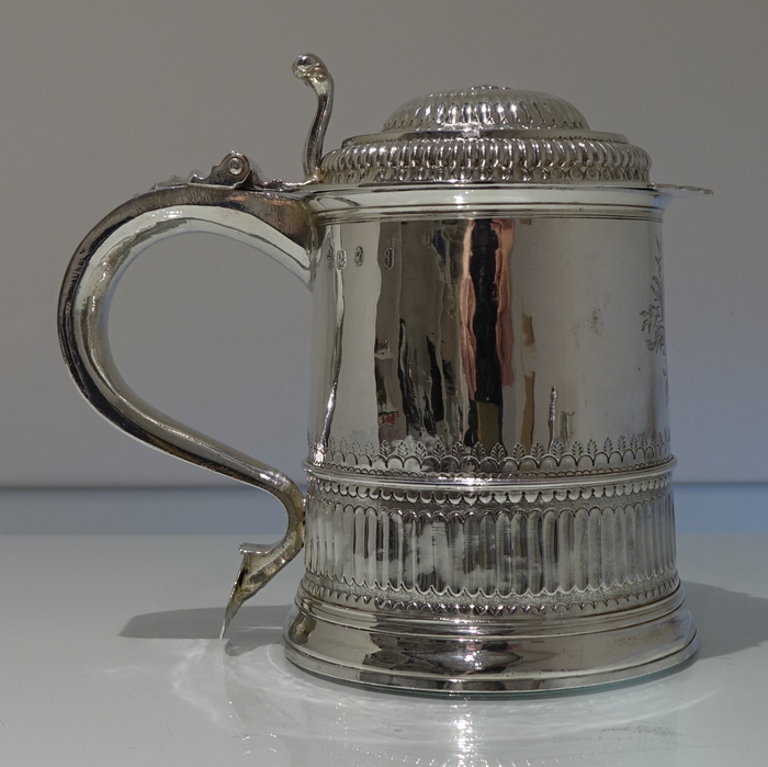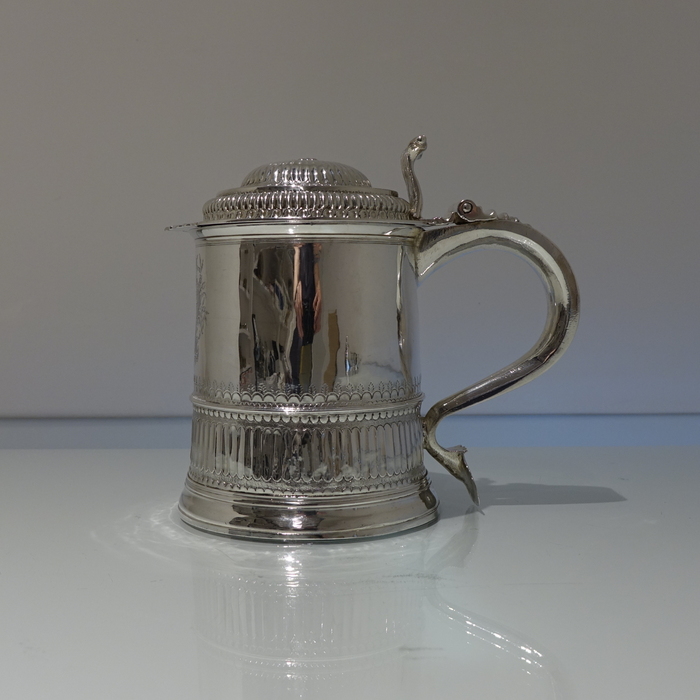 A very rare large cylindrical tankard and cover with scroll handle.  The lower section of the body has fluting set on a matt background for contrast.  The centre front has an elegant contemporary armorial (Martial arms of Robert Wigget of Giest/Guist Norfolk c1632 – 1697 and his wife Dorthy Week c1654 – 1697. They were parents of Rice Wiggett of Guestwick high Sheriff of Norfolk in 1726) for importance.  The lid is hinged with additional fluting for highlights.