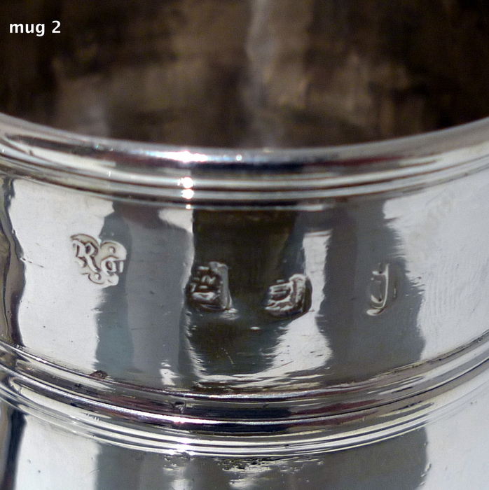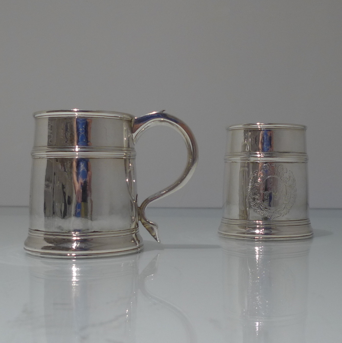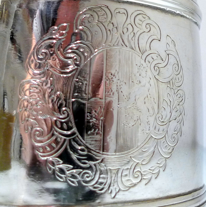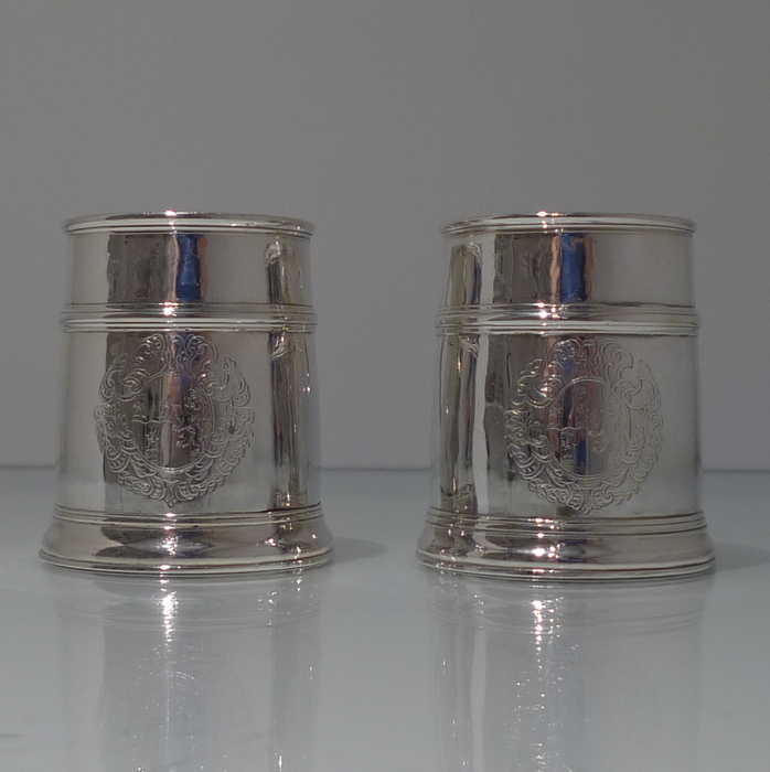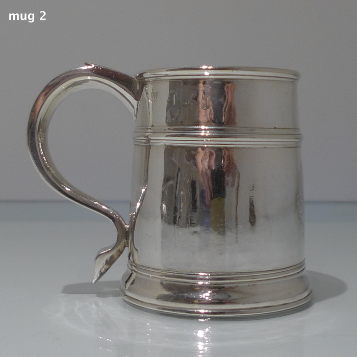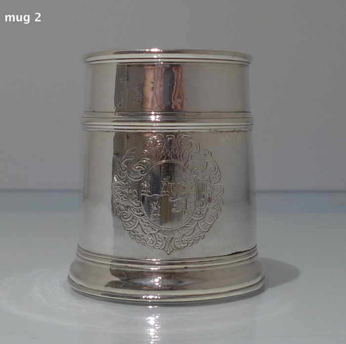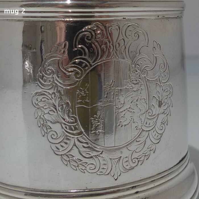 A stunning pair of 18th century pint mugs decorated with elegant strap work bands to their upper bowls for highlights. Â The centre fronts are engraved with elegant looking contemporary armorials. Â The handles are sheet silver which are beautifully crafted in scroll form.