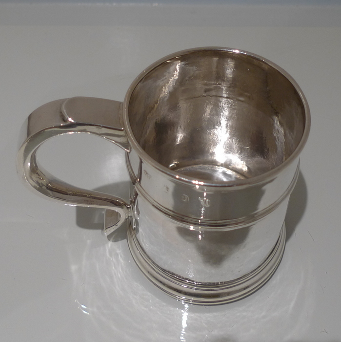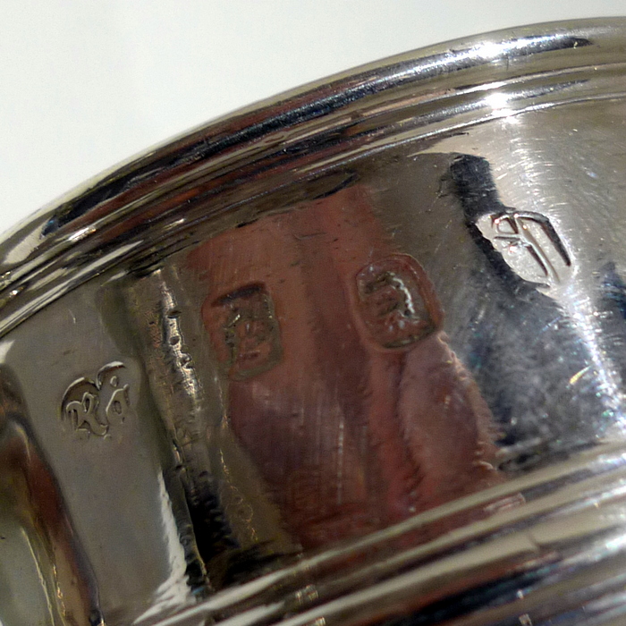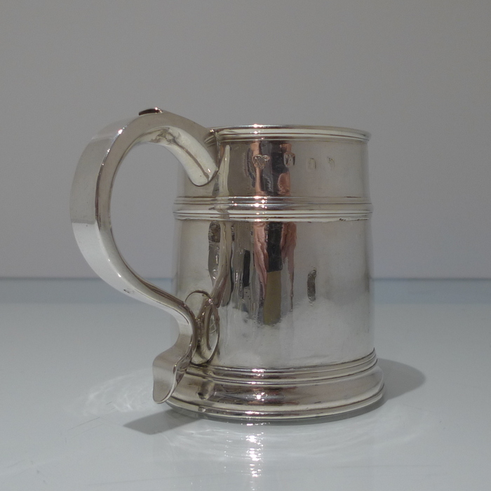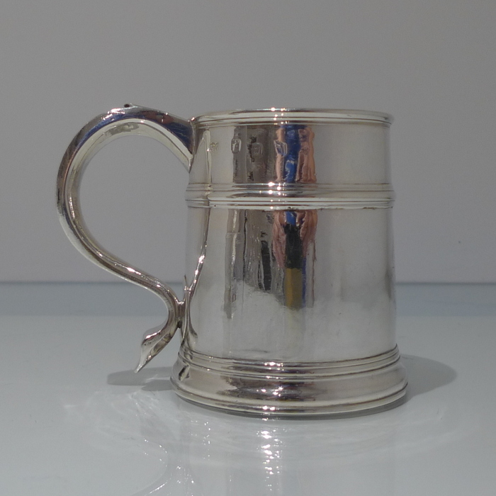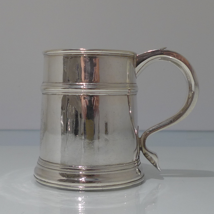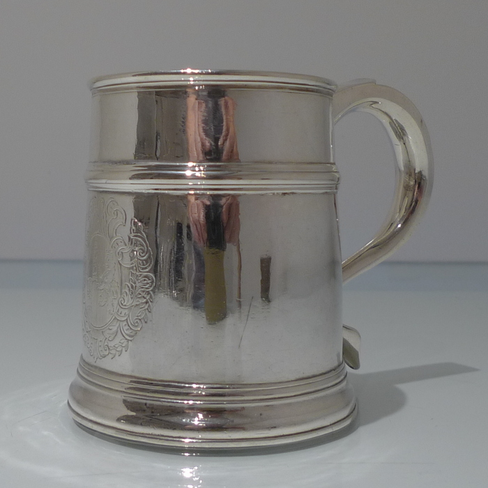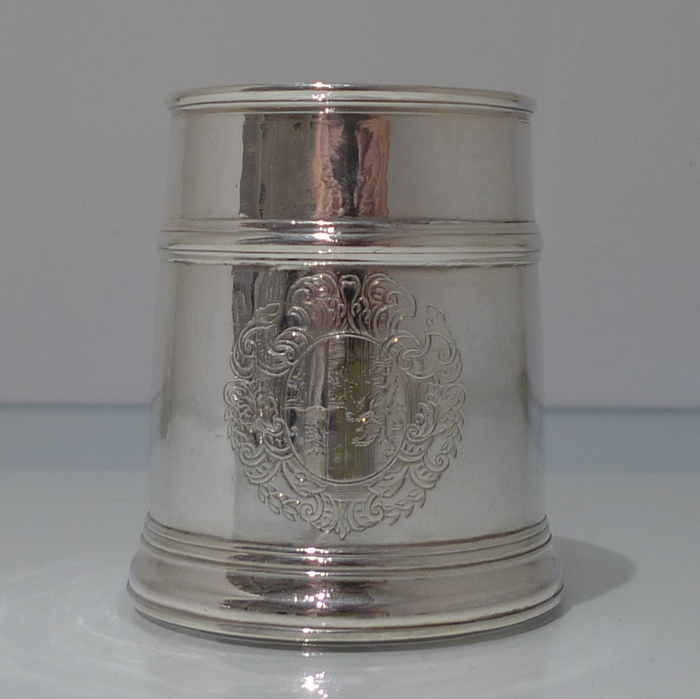 A stunning pair of 18th century pint mugs decorated with elegant strap work bands to their upper bowls for highlights. Â The centre fronts are engraved with elegant looking contemporary armorials. Â The handles are sheet silver which are beautifully crafted in scroll form.