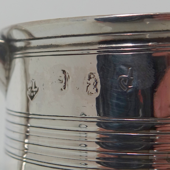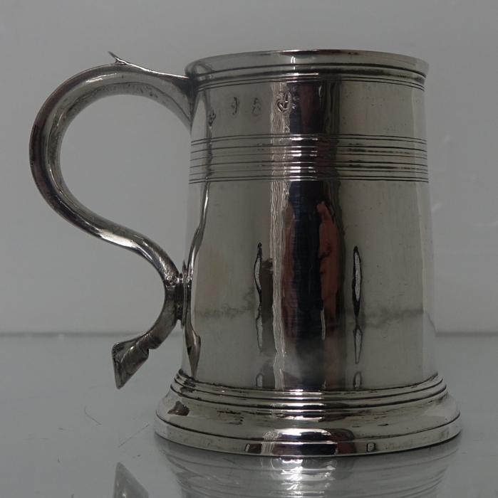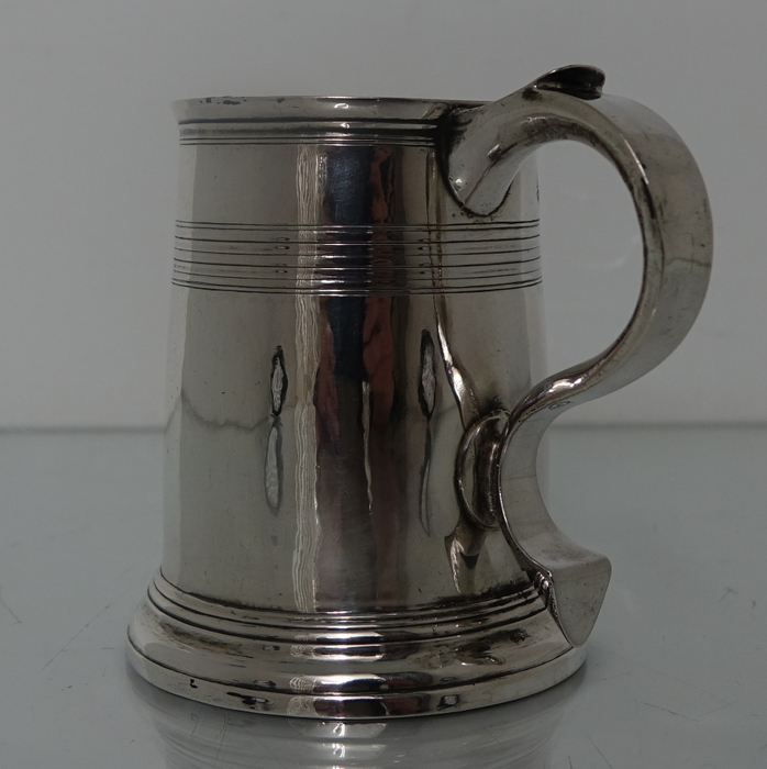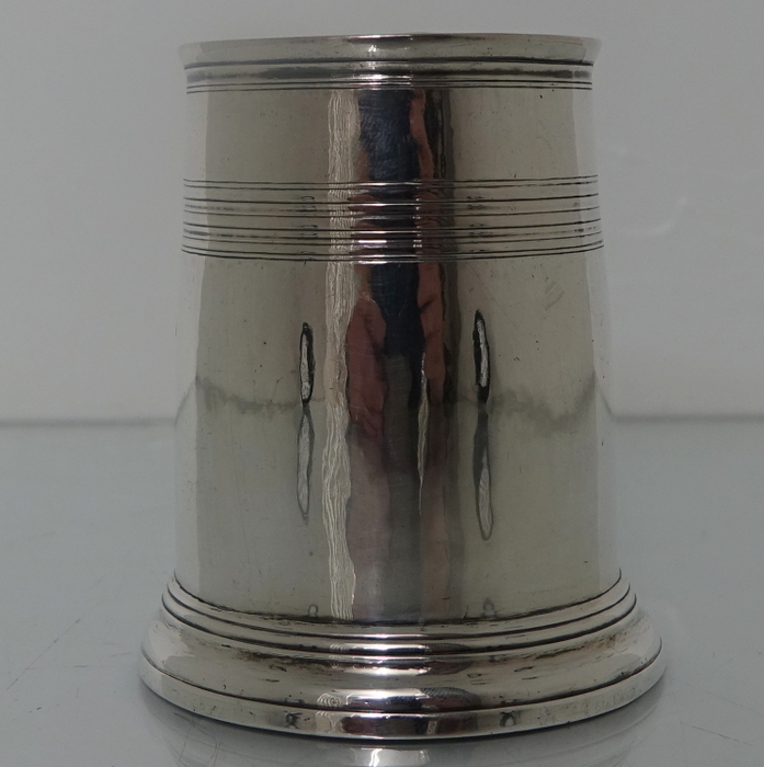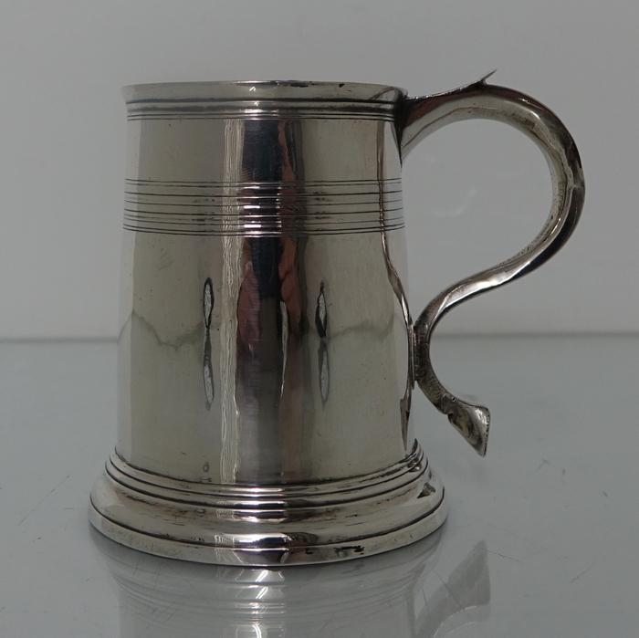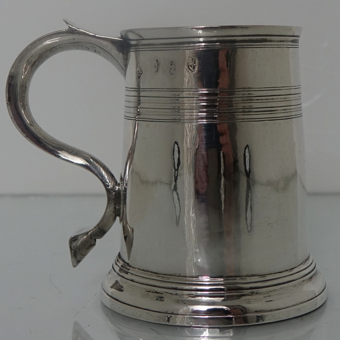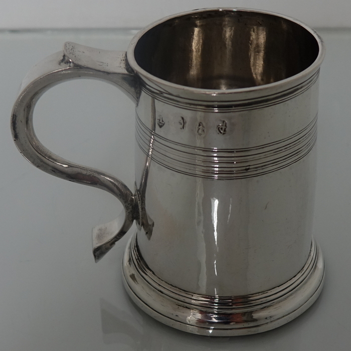A delightful Britannia silver half pint mug, cylindrical in design with elegant upper bands of reeding for highlights.  The foot is flared and the handle is scroll formed and crowned with shaped sheet silver thumb piece.