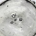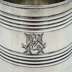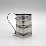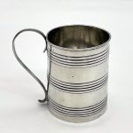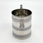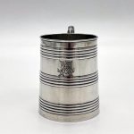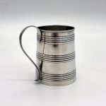 A rare and collectable Georgian silver christening mug designed with tapering walls and elegant turnings which alternate plain form sections for decorative contrast. The centre front has stylish entwined contemporary initials for presentation.