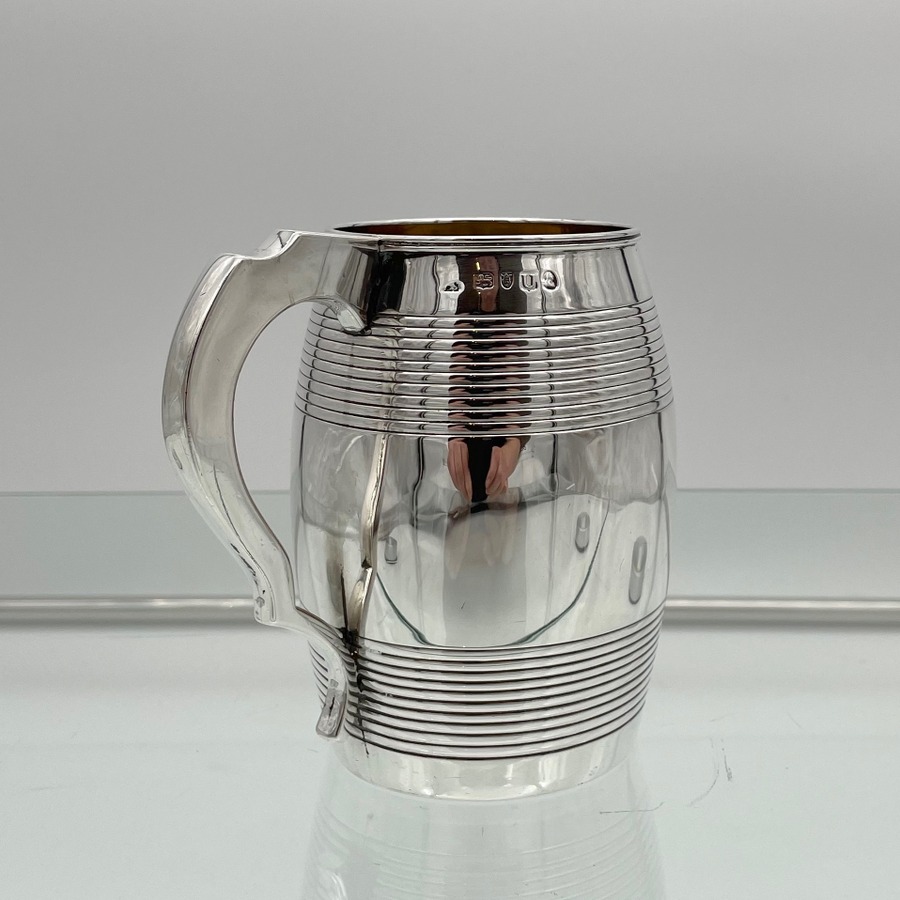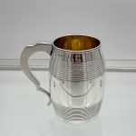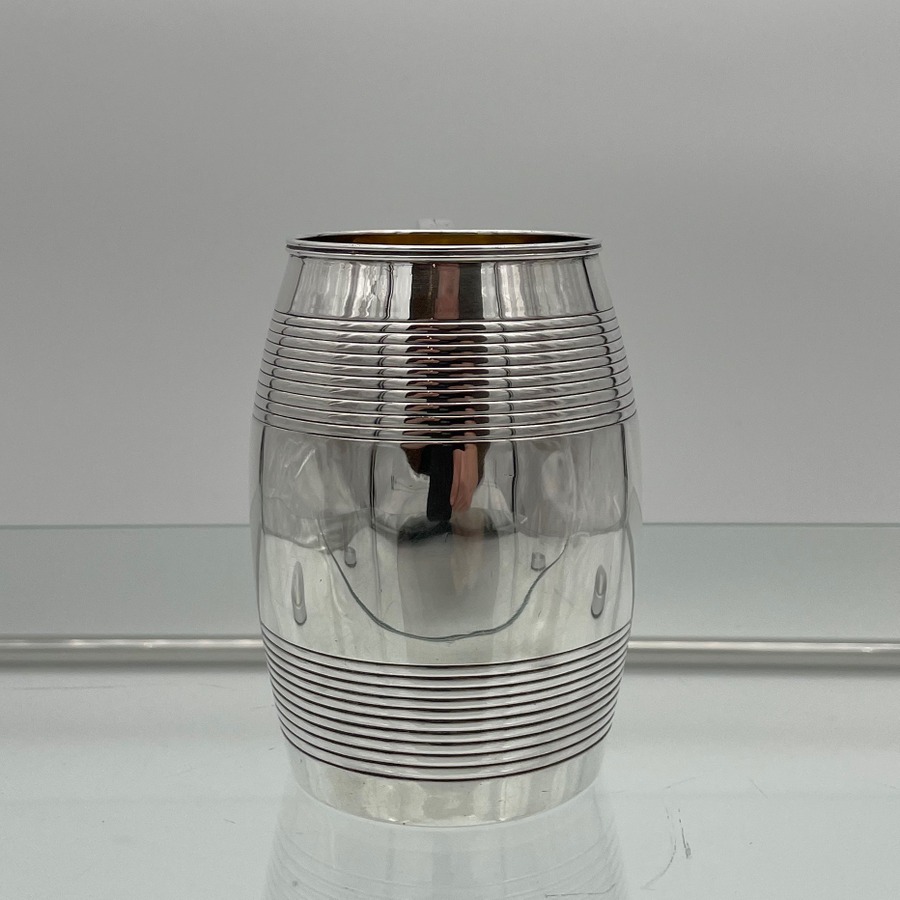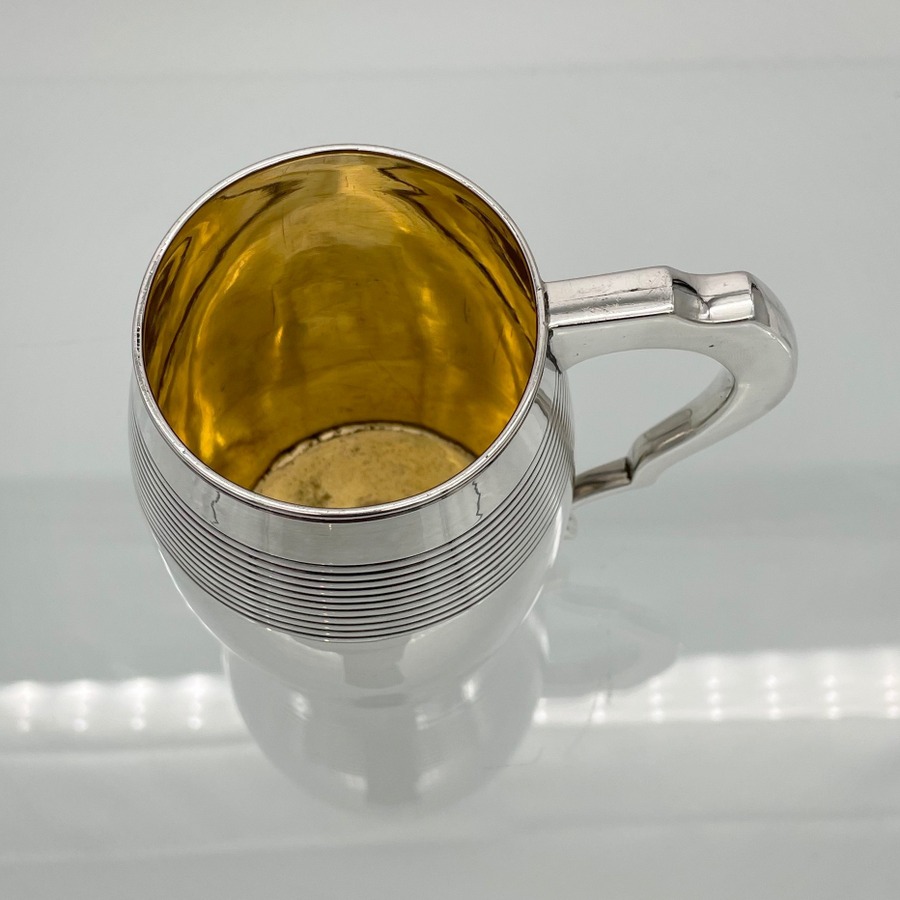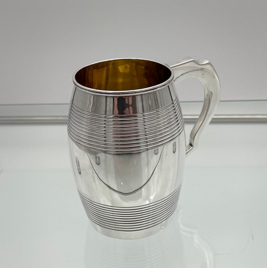 A truly fine Georgian silver barrel shaped pint mug decorated with elegant turnings and a stunningly beautiful interior silver gilt  bowl.