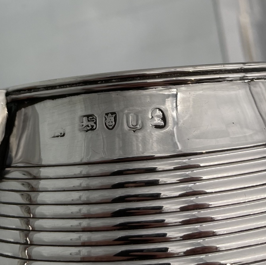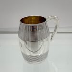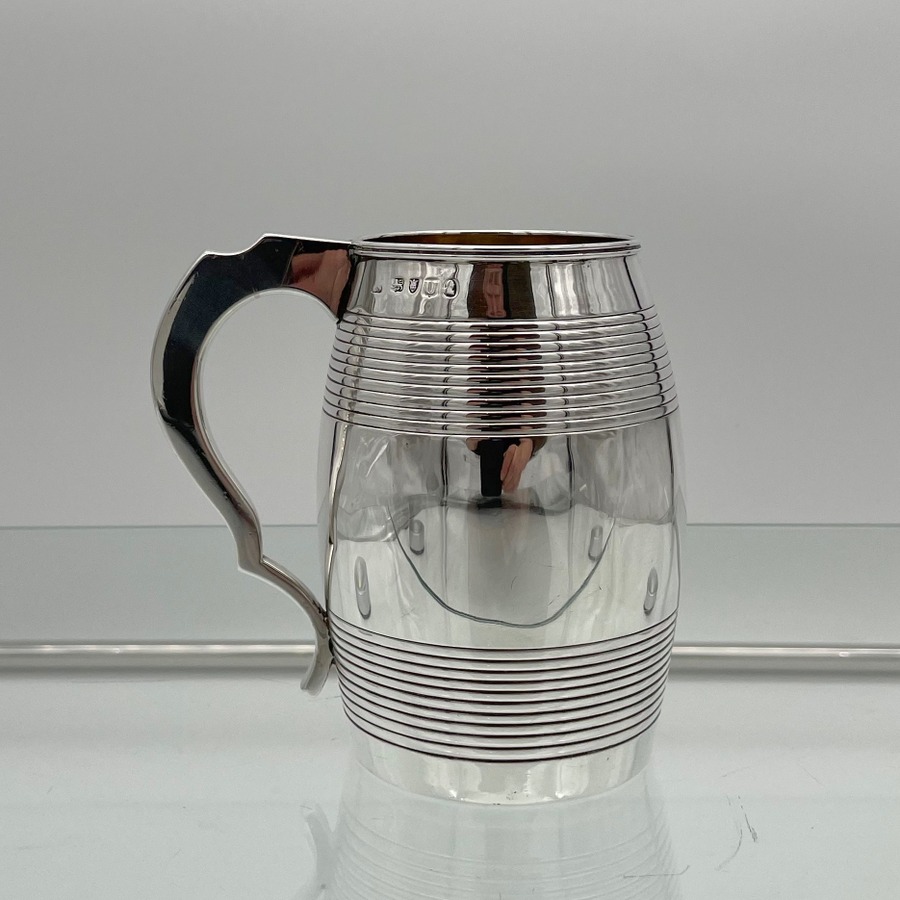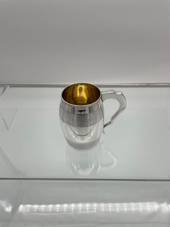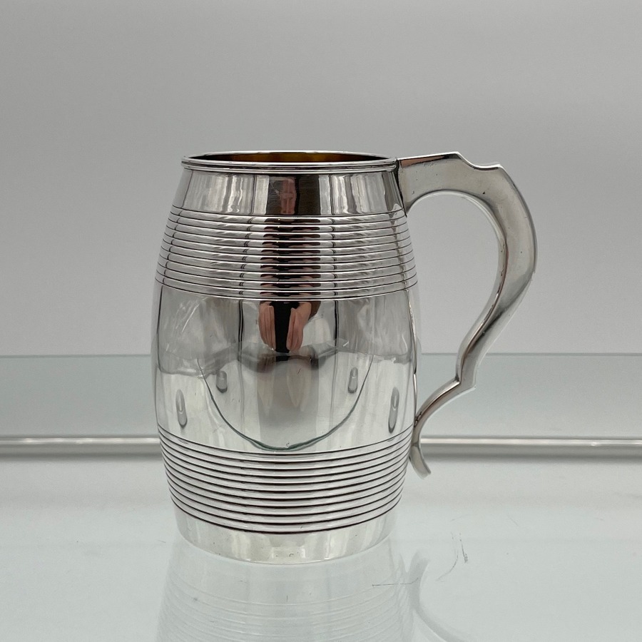 A truly fine Georgian silver barrel shaped pint mug decorated with elegant turnings and a stunningly beautiful interior silver gilt  bowl.