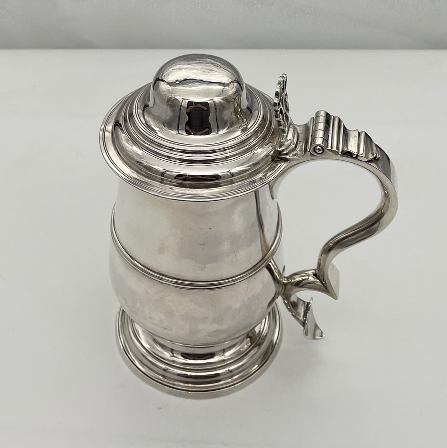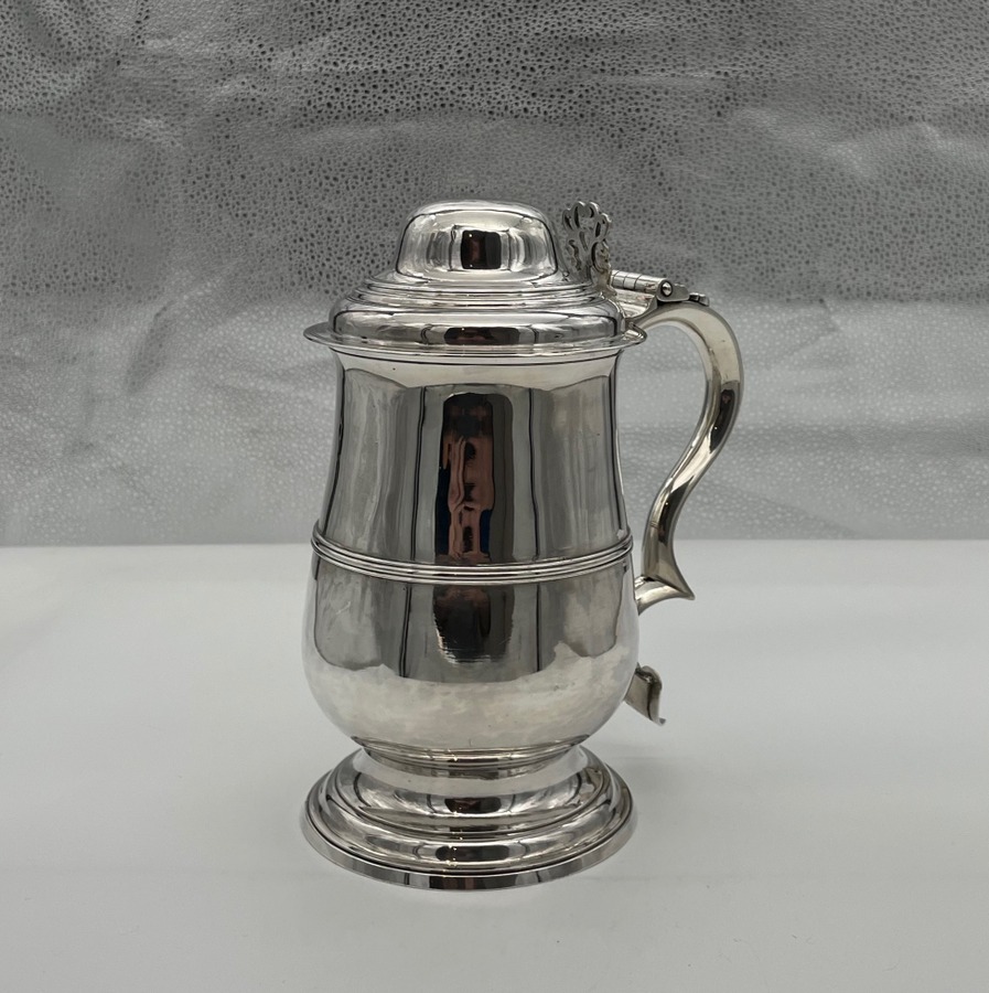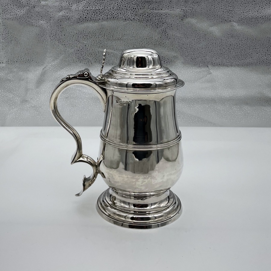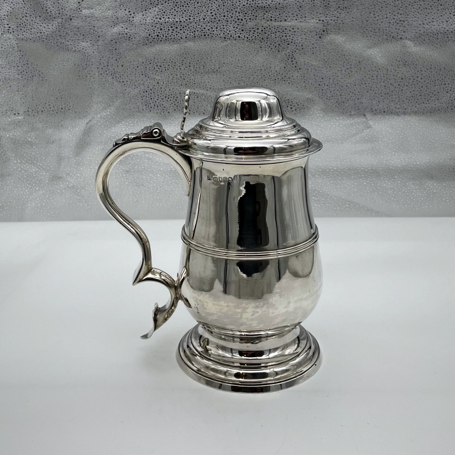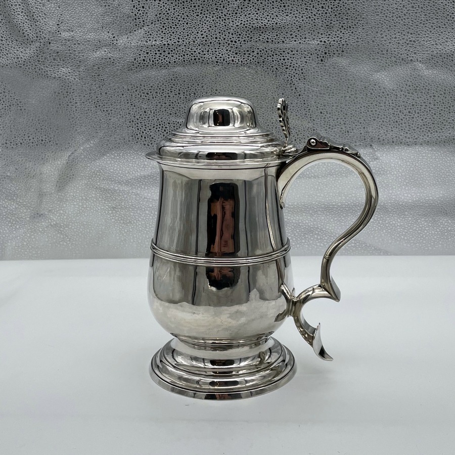A beautiful plain formed Georgian silver baluster tankard and cover decorated with an elegant lower girdle and designed with a stylish domed lid and a cast wire scrolling thumbpiece.
