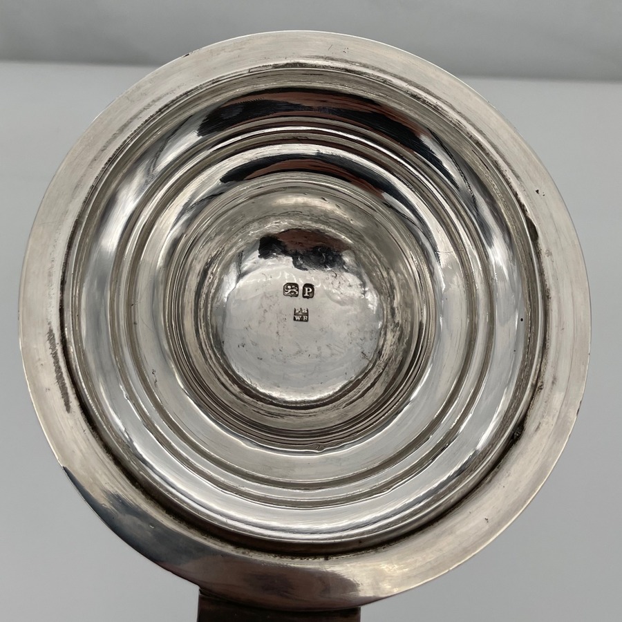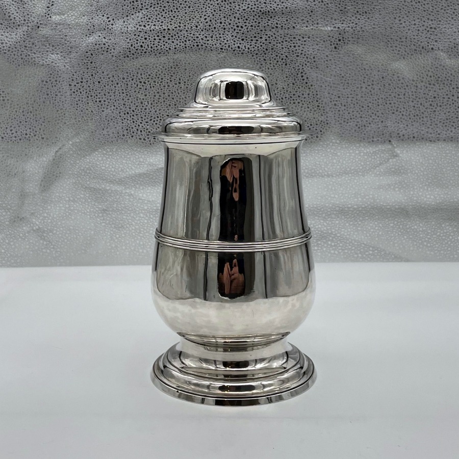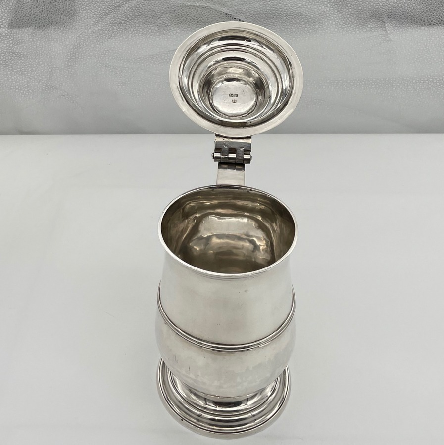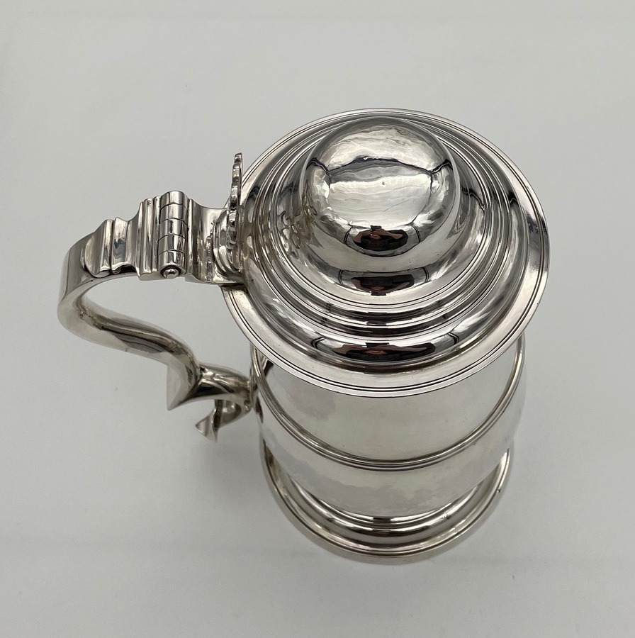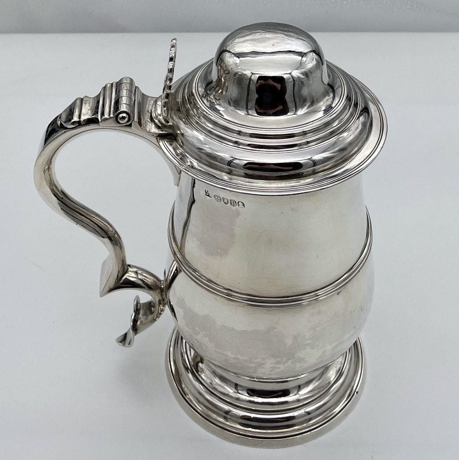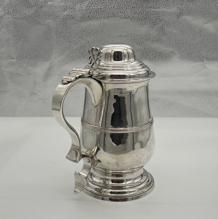 A beautiful plain formed Georgian silver baluster tankard and cover decorated with an elegant lower girdle and designed with a stylish domed lid and a cast wire scrolling thumbpiece.