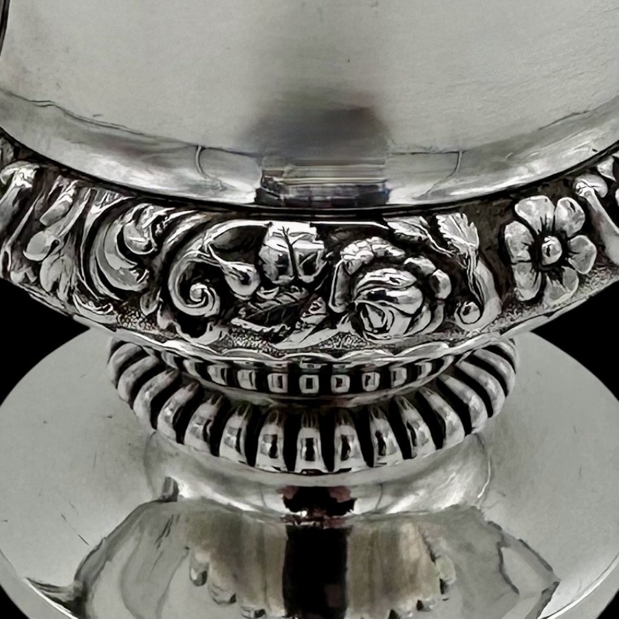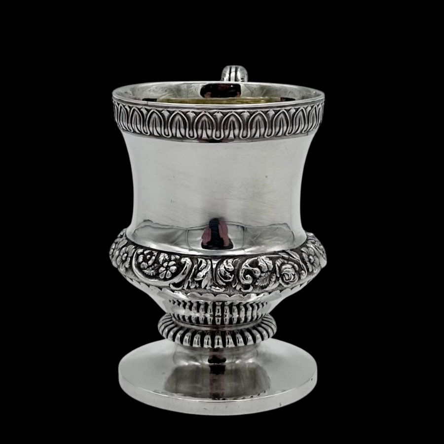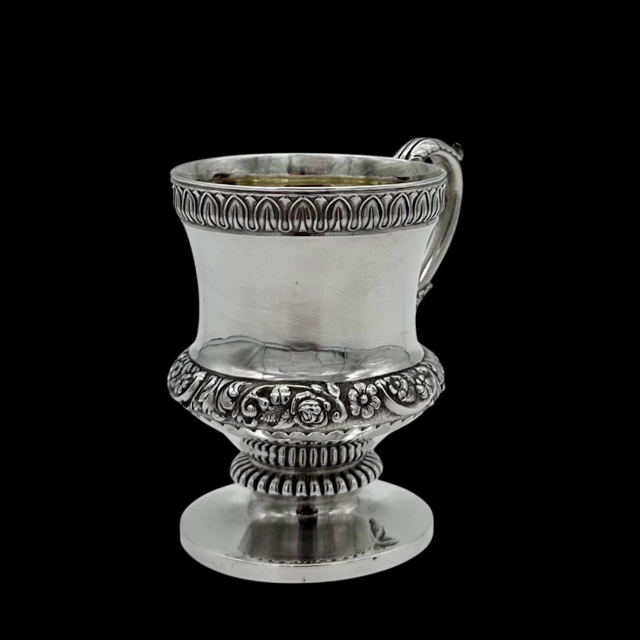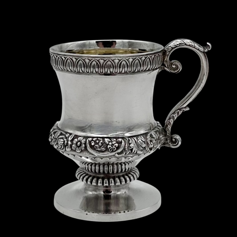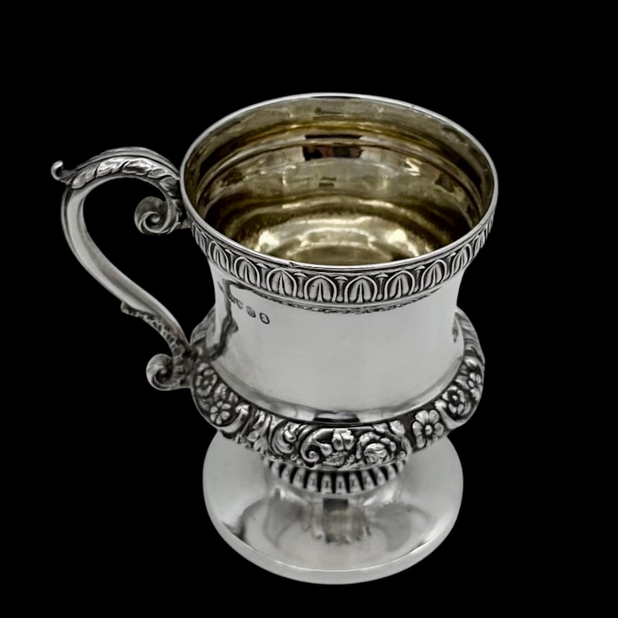 Truly magnificent Paul Storr wine mug decorated with a beautiful bulbous matted embossed lower floral border and an upper dart style border. The inside has been elegantly gilt and the lower foot has an additional decorative band of lobbing for lowlights.
