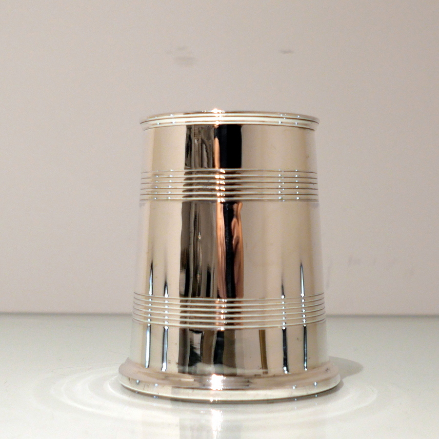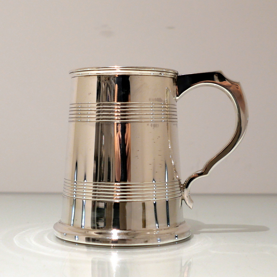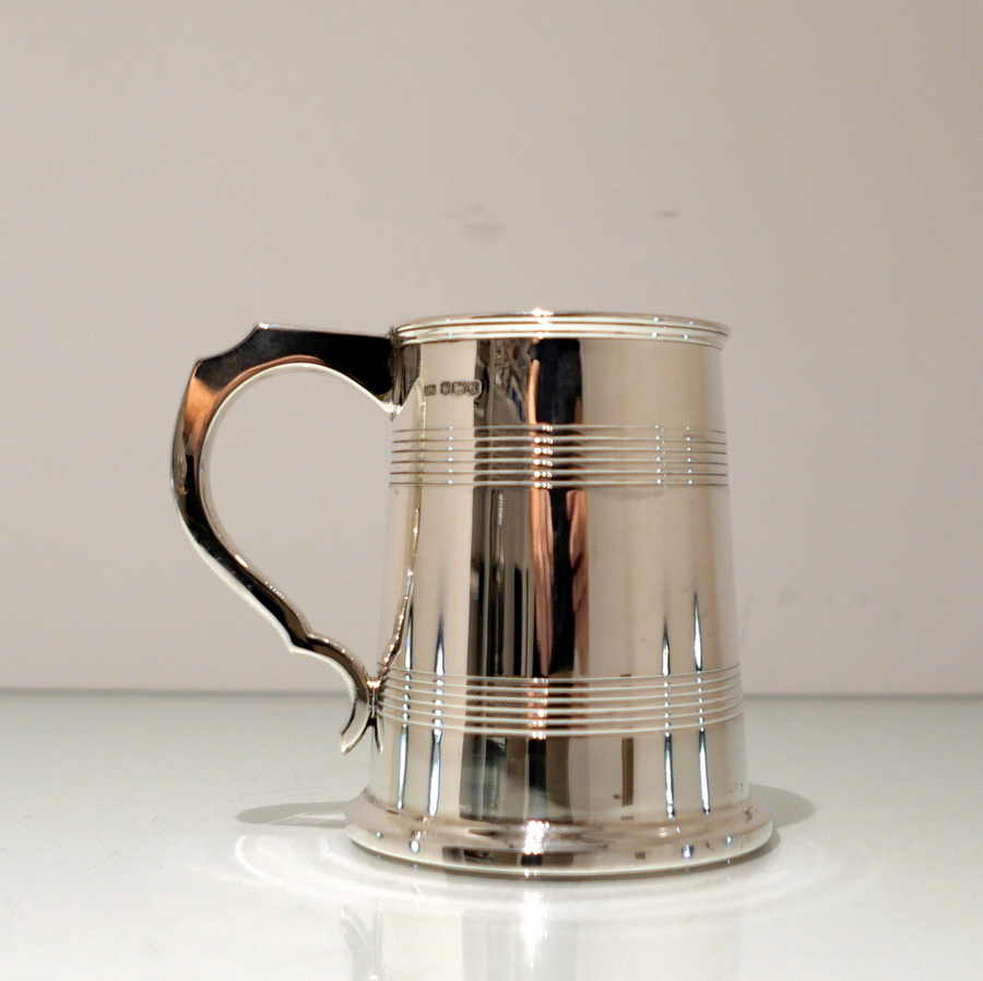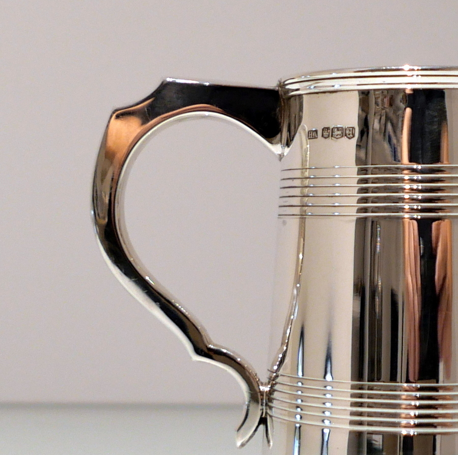 A beautifully proportioned sterling silver pint mug designed with a tapering body and decorated with two bands of reed decoration for highlights. Â The applied handle is scroll formed.