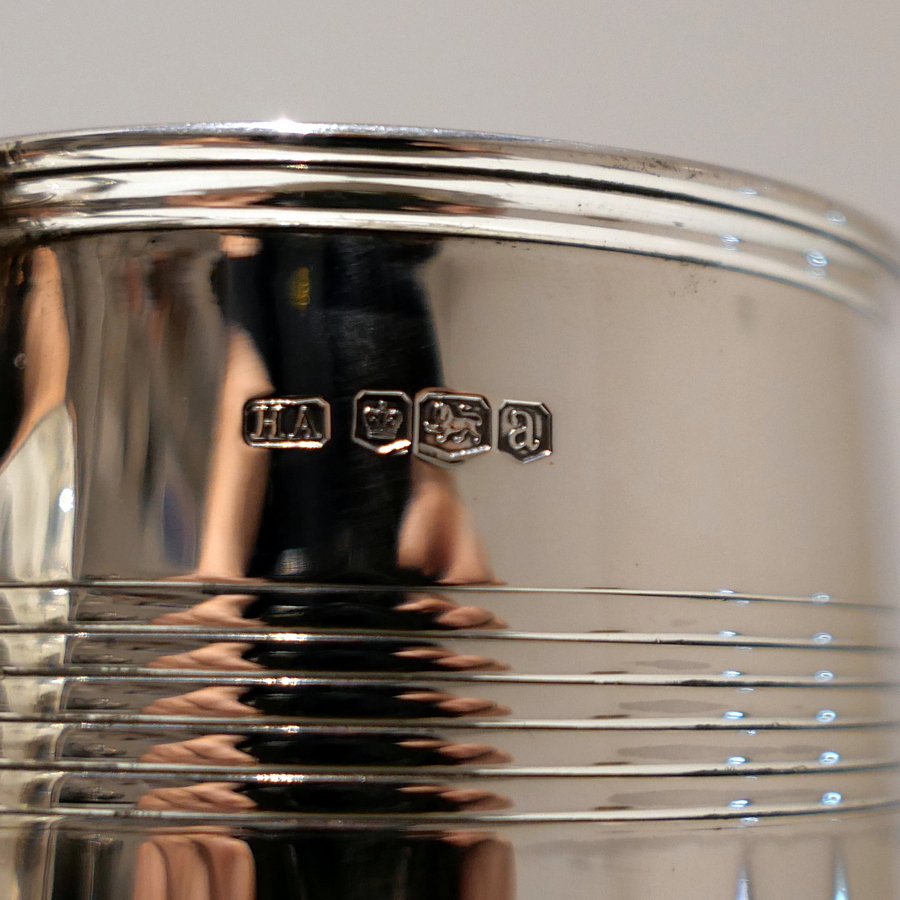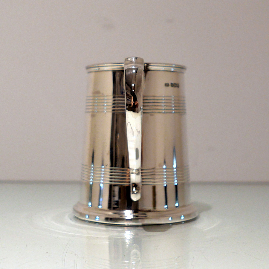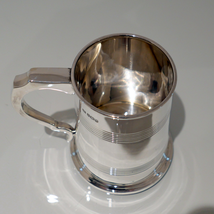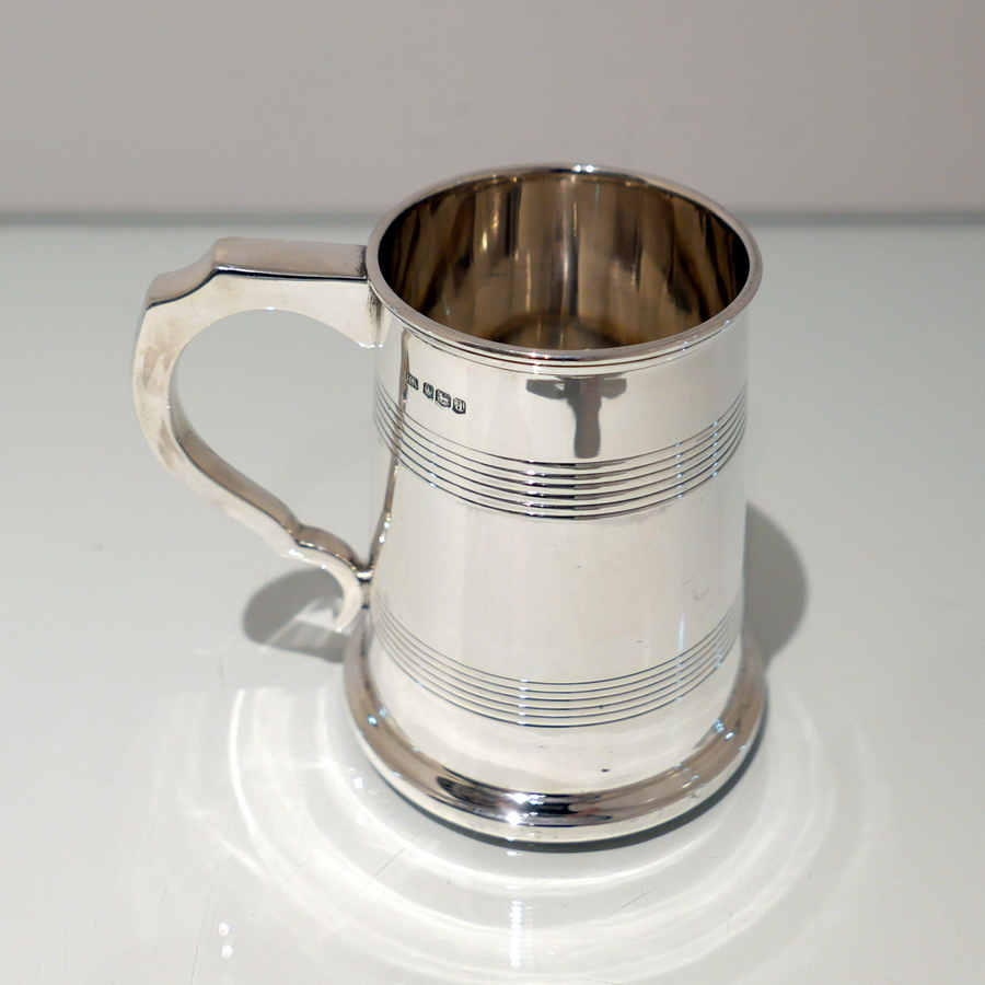 A beautifully proportioned sterling silver pint mug designed with a tapering body and decorated with two bands of reed decoration for highlights. Â The applied handle is scroll formed.