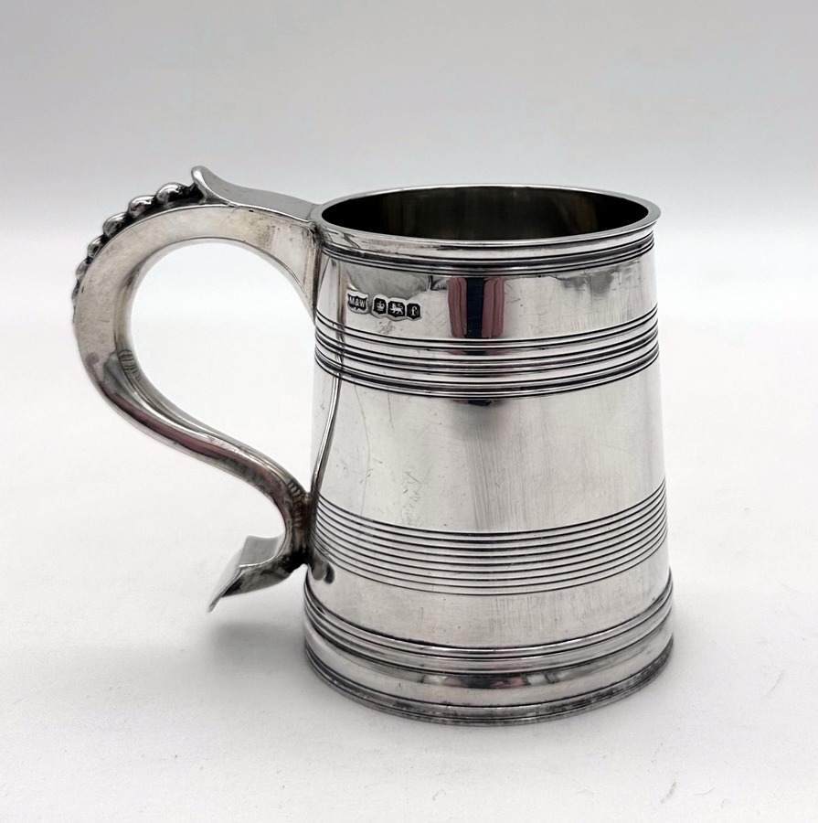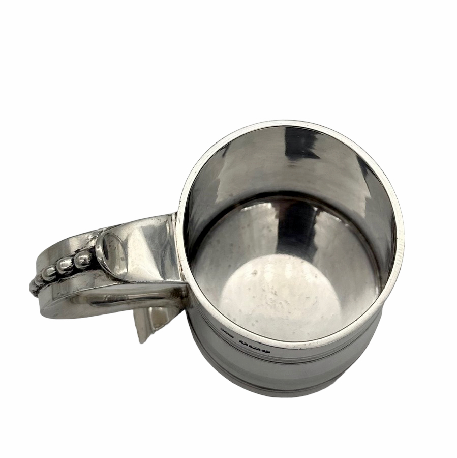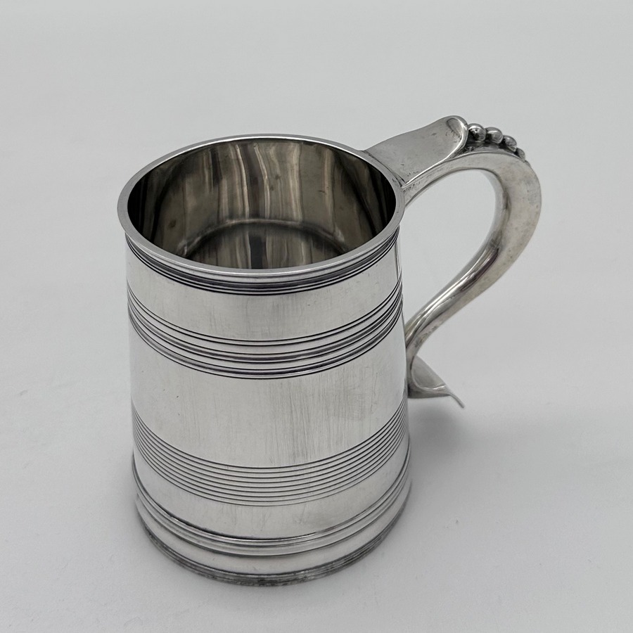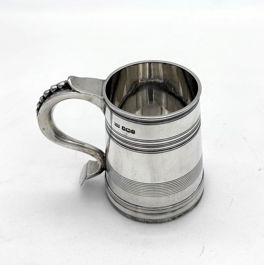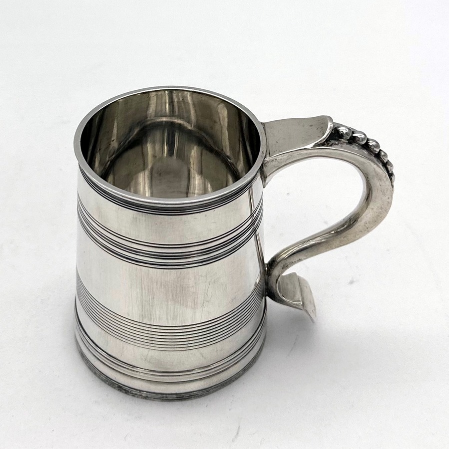 Very fine early 20th century sterling silver christening mug decorated with elegant turnings to the tapering bowl and a sumptuous scroll handle featuring a stunning sheet capped thumbpiece with delightful cascading tear drops.