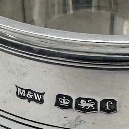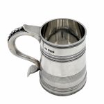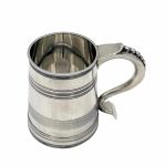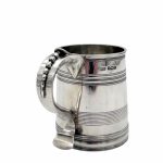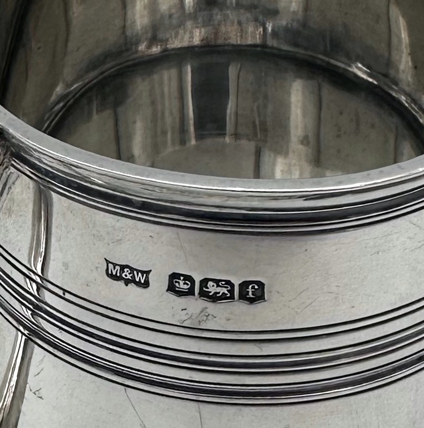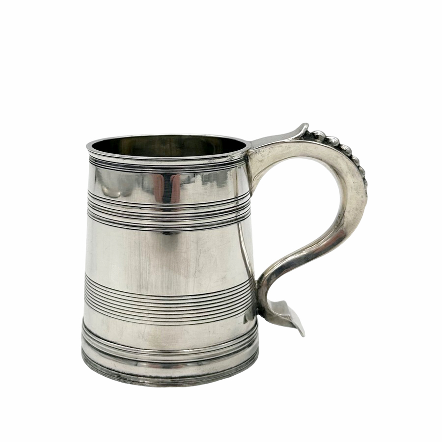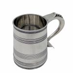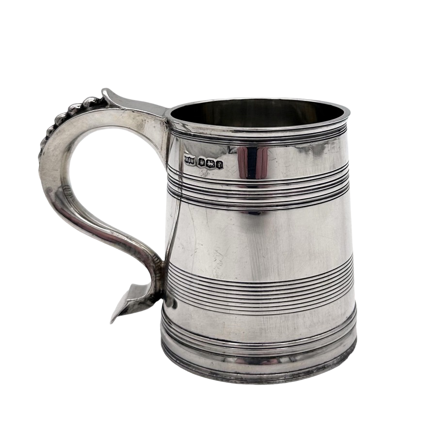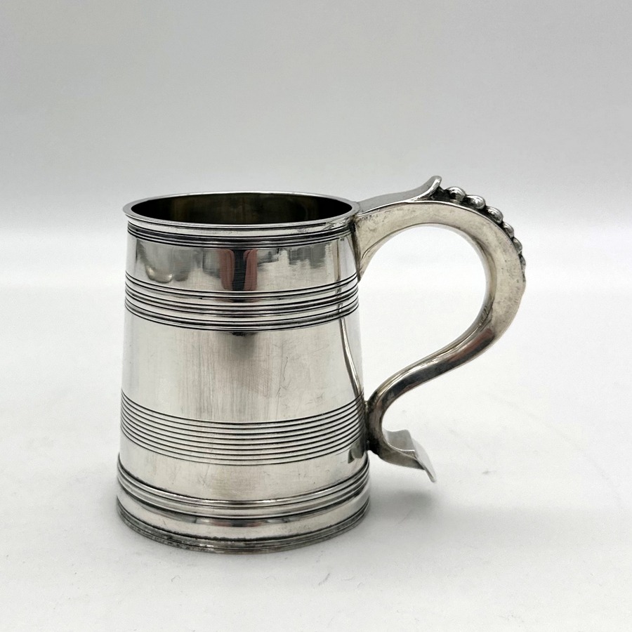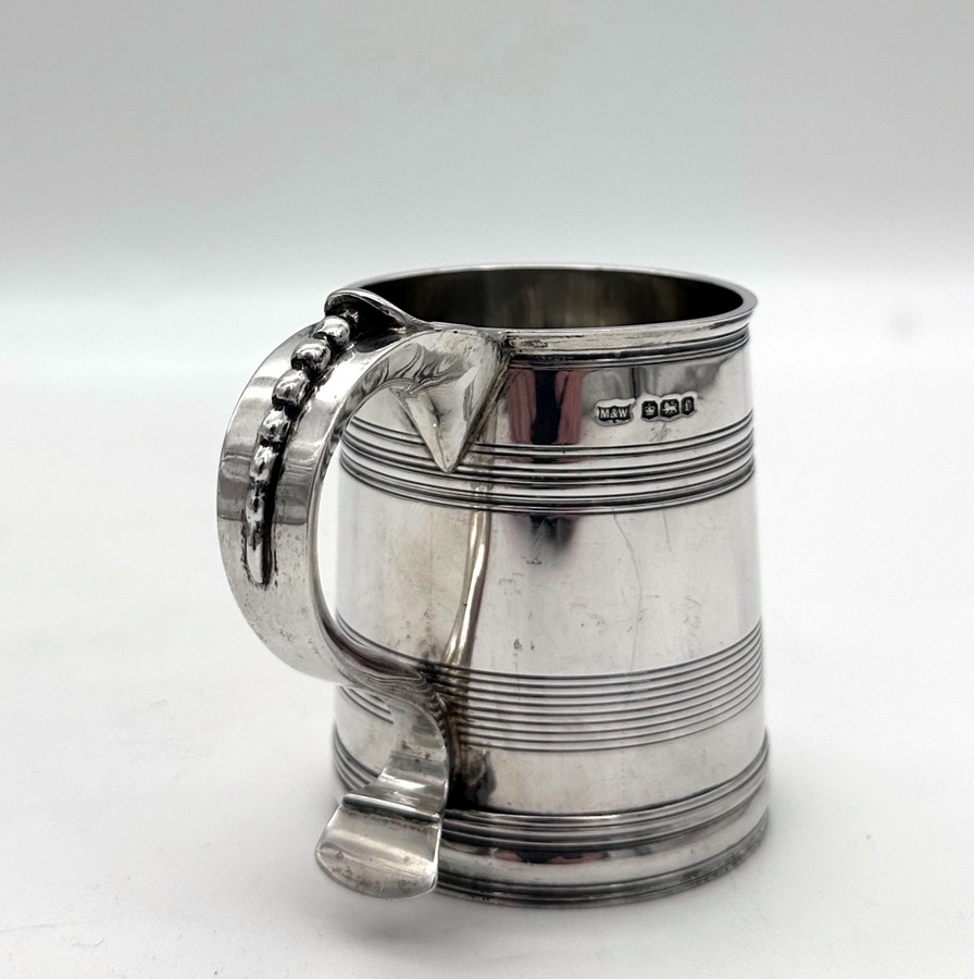 Very fine early 20th century sterling silver christening mug decorated with elegant turnings to the tapering bowl and a sumptuous scroll handle featuring a stunning sheet capped thumbpiece with delightful cascading tear drops.