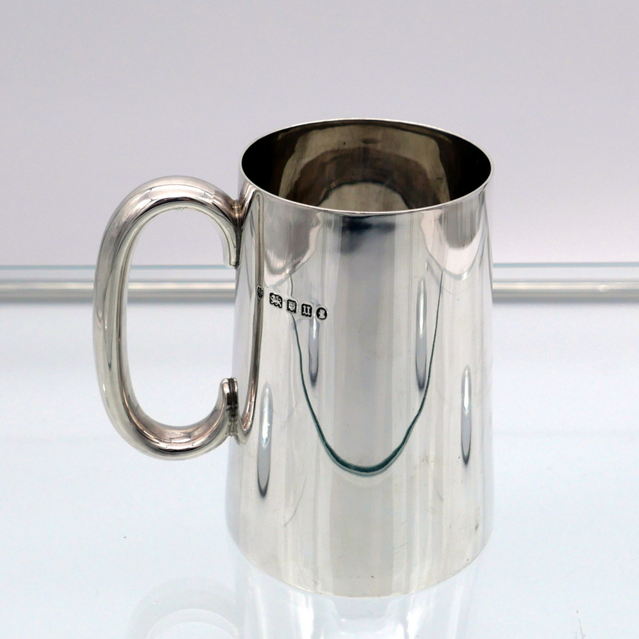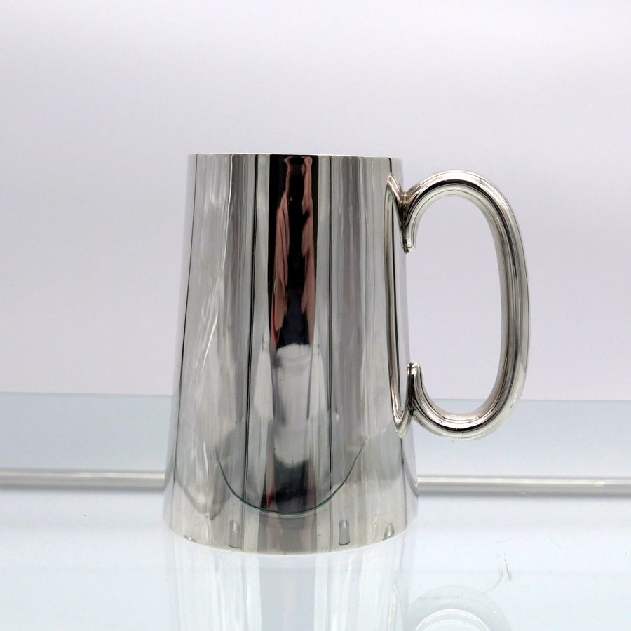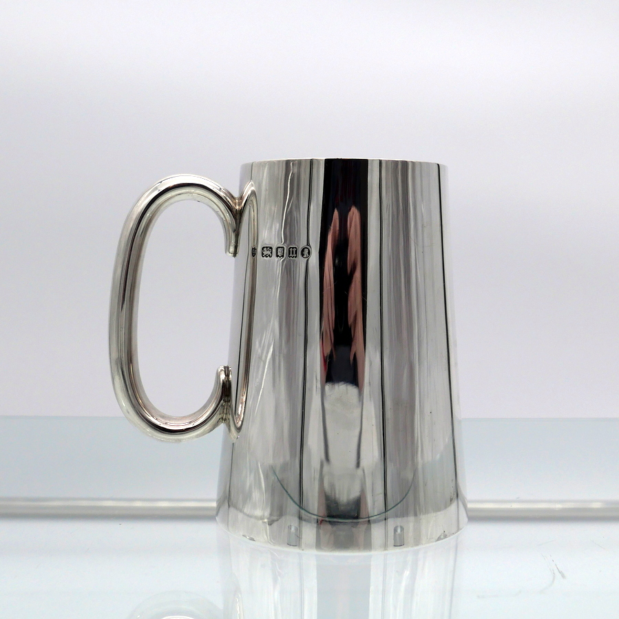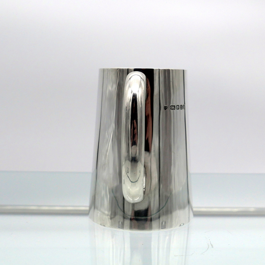 A stylish early 20th century plain formed sterling silver glass bottomed pint mug designed with tapering sides and an elegant applied oval handle. Â There is a hand engraved contemporary inscription on the underside of the base.
