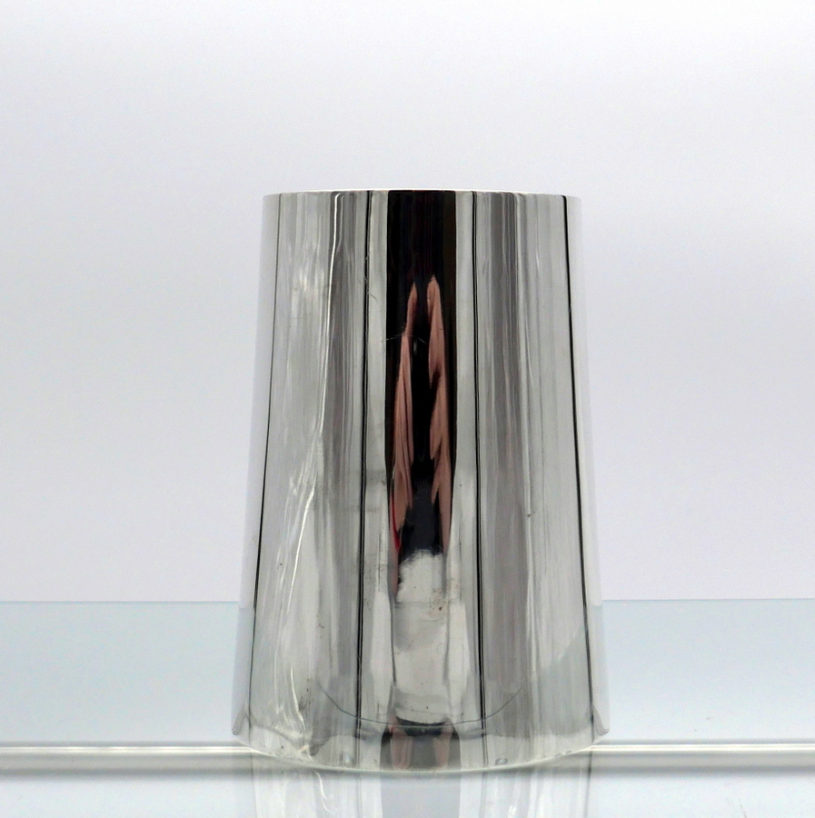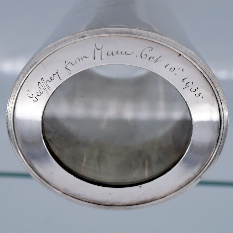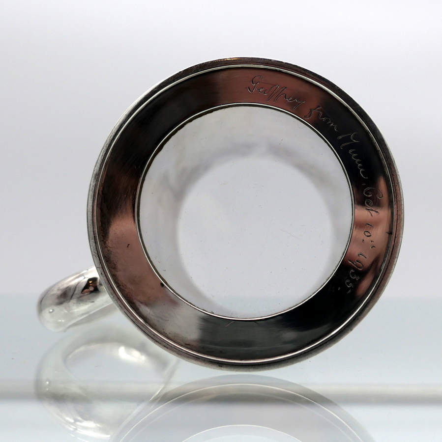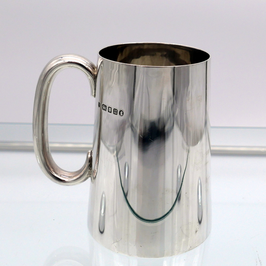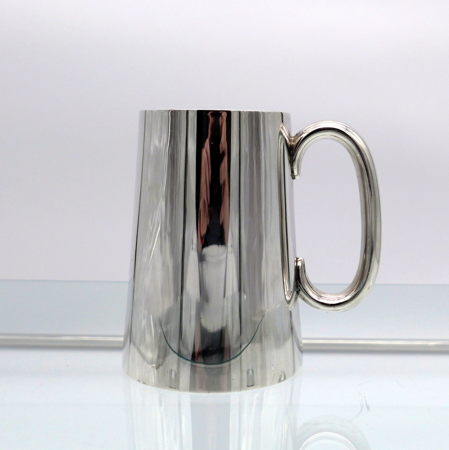 A stylish early 20th century plain formed sterling silver glass bottomed pint mug designed with tapering sides and an elegant applied oval handle. Â There is a hand engraved contemporary inscription on the underside of the base.