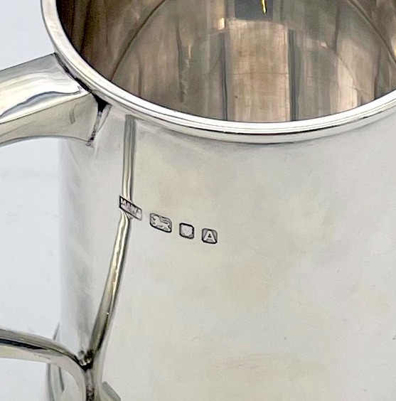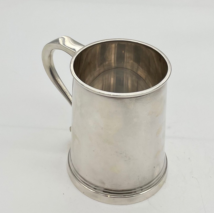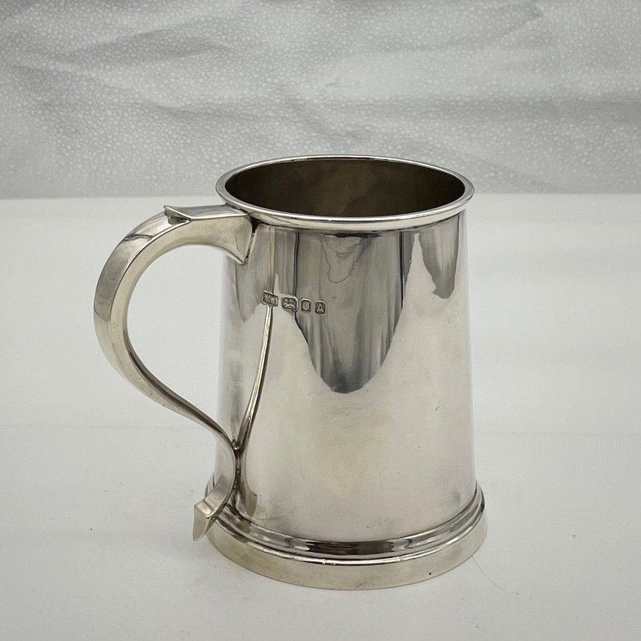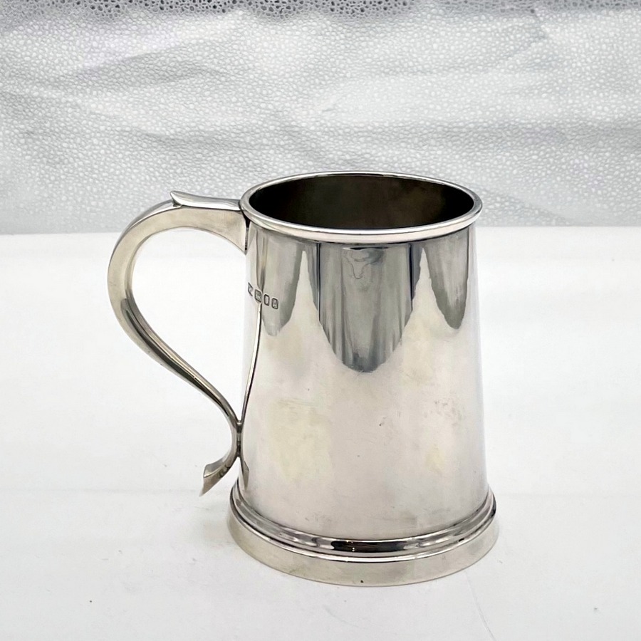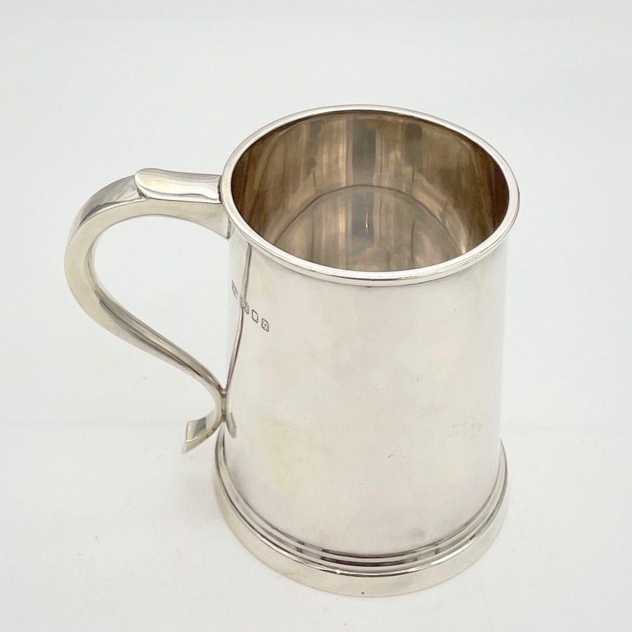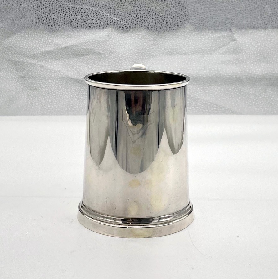 A highly desirable plain formed straight sided sterling silver pint mug designed with an elegant scroll handle and eye catching thick upper and lower wire bezels for decorative designer styling.