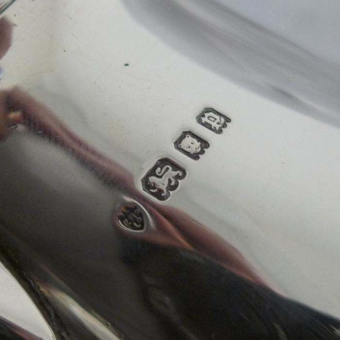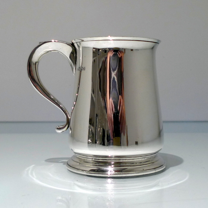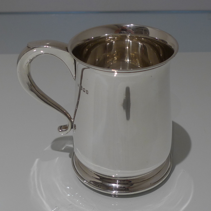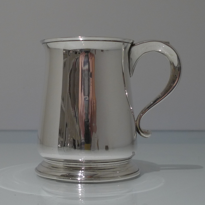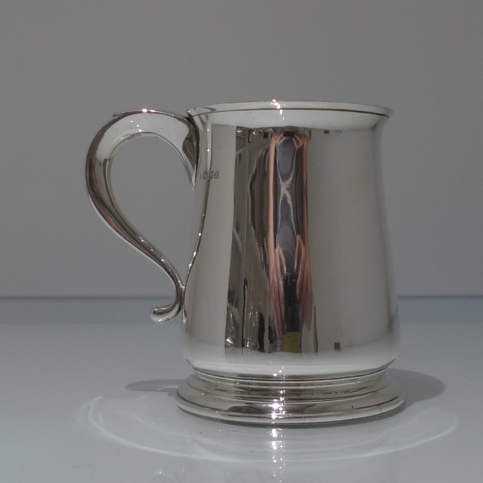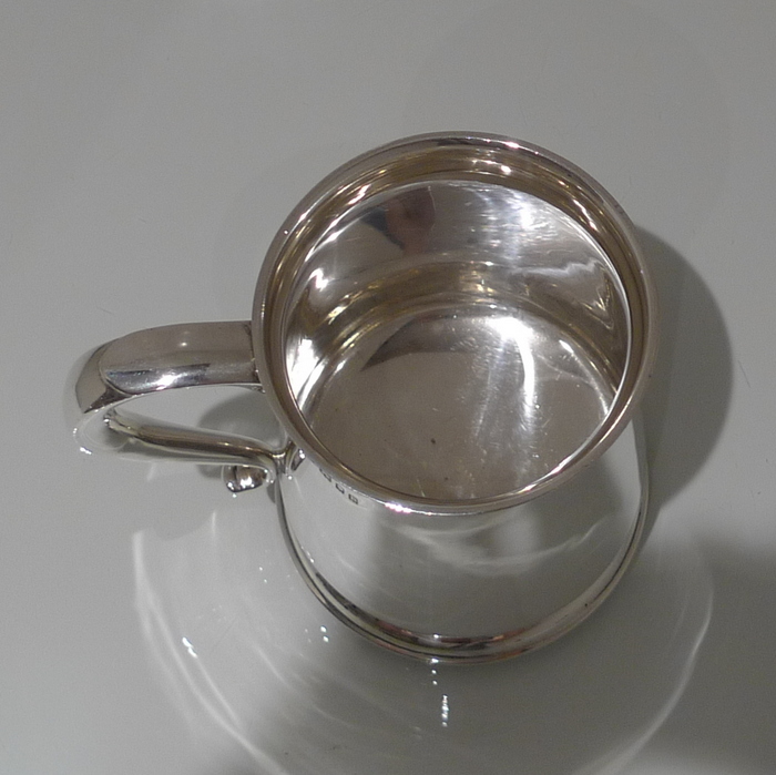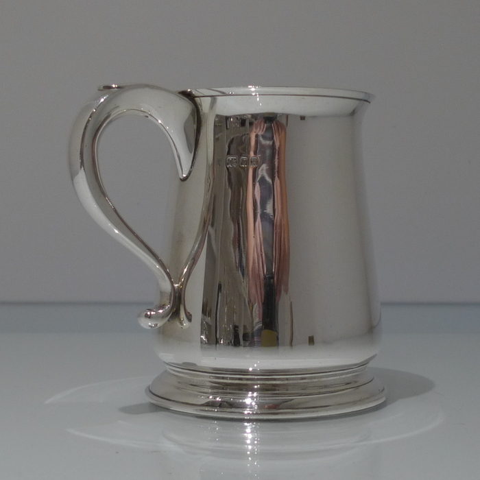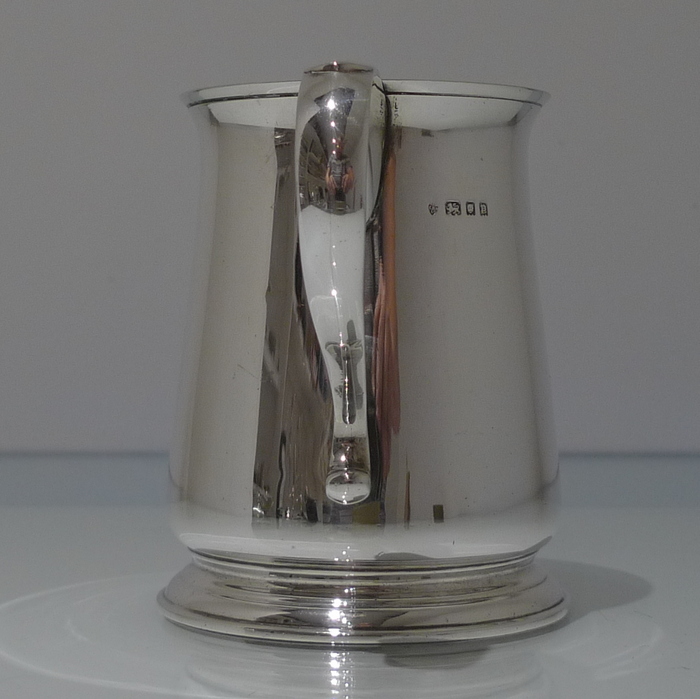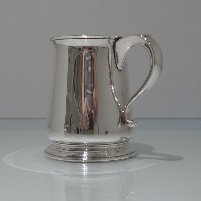 An elegant George V plain formed silver pint mug tapering at the angles of the bowl for overall visual design. Â The handle is scroll formed and is crowned with a sheet formed thumb piece.