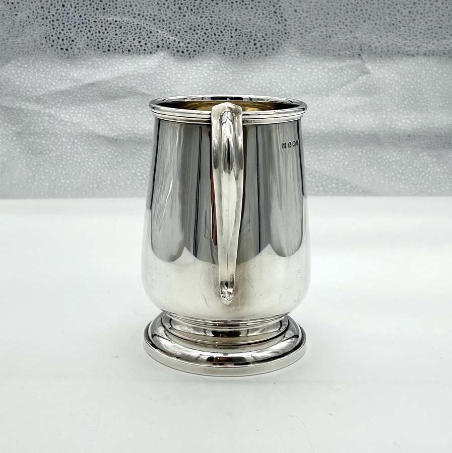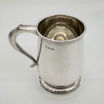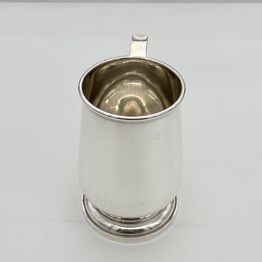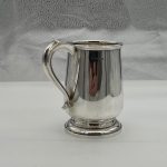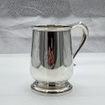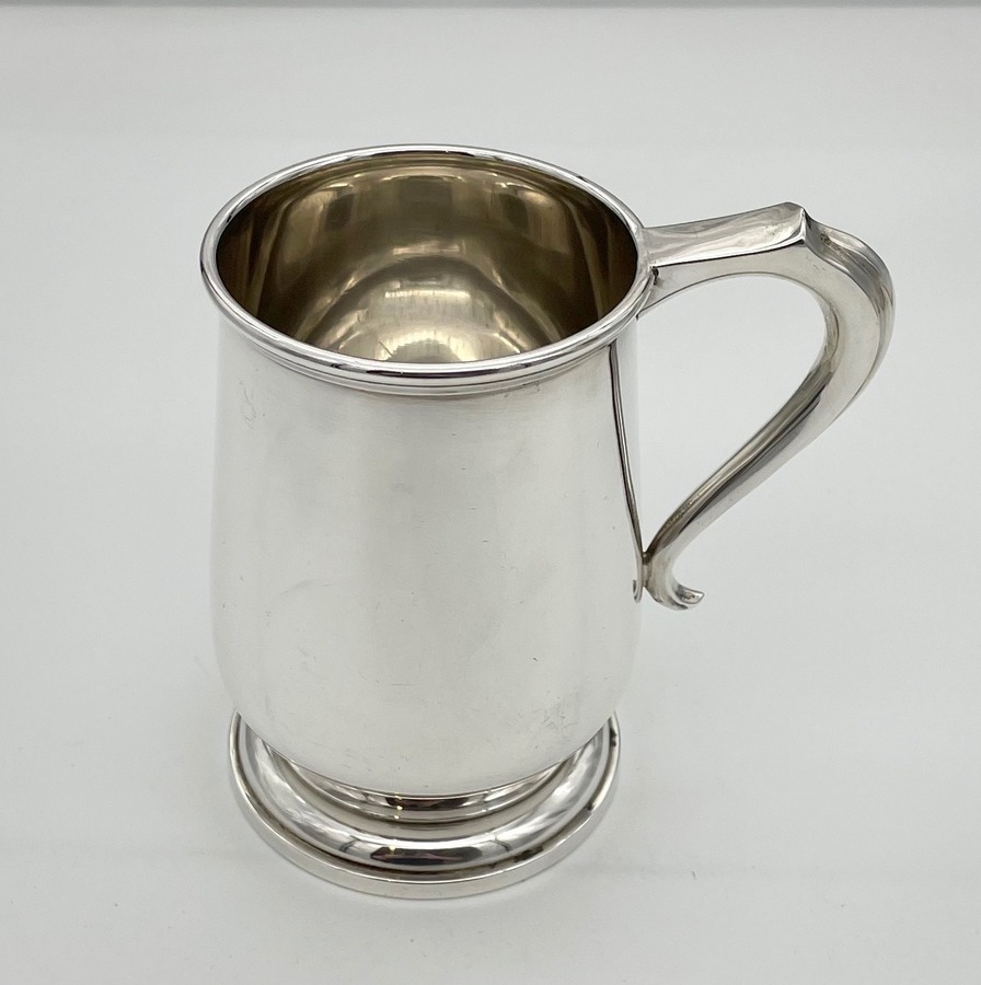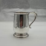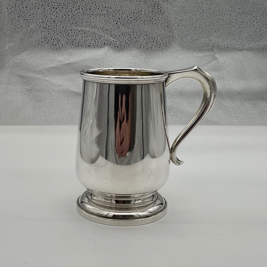 A very crisp sterling silver pint mug designed with an elegant plain formed theme and a beautiful scroll handle which has a stylish incorporate thumbpiece.