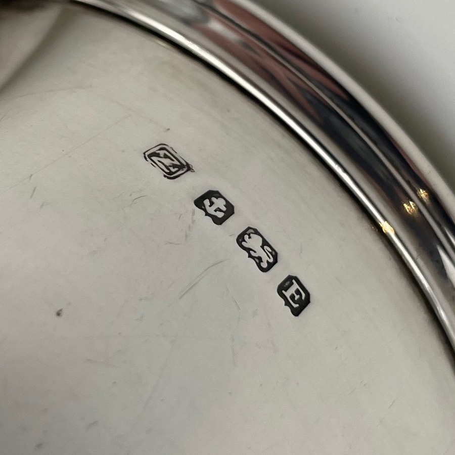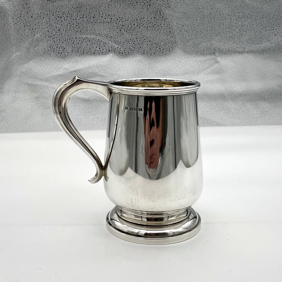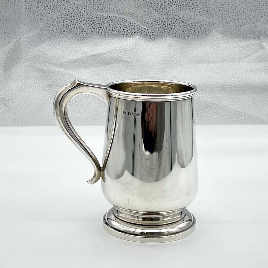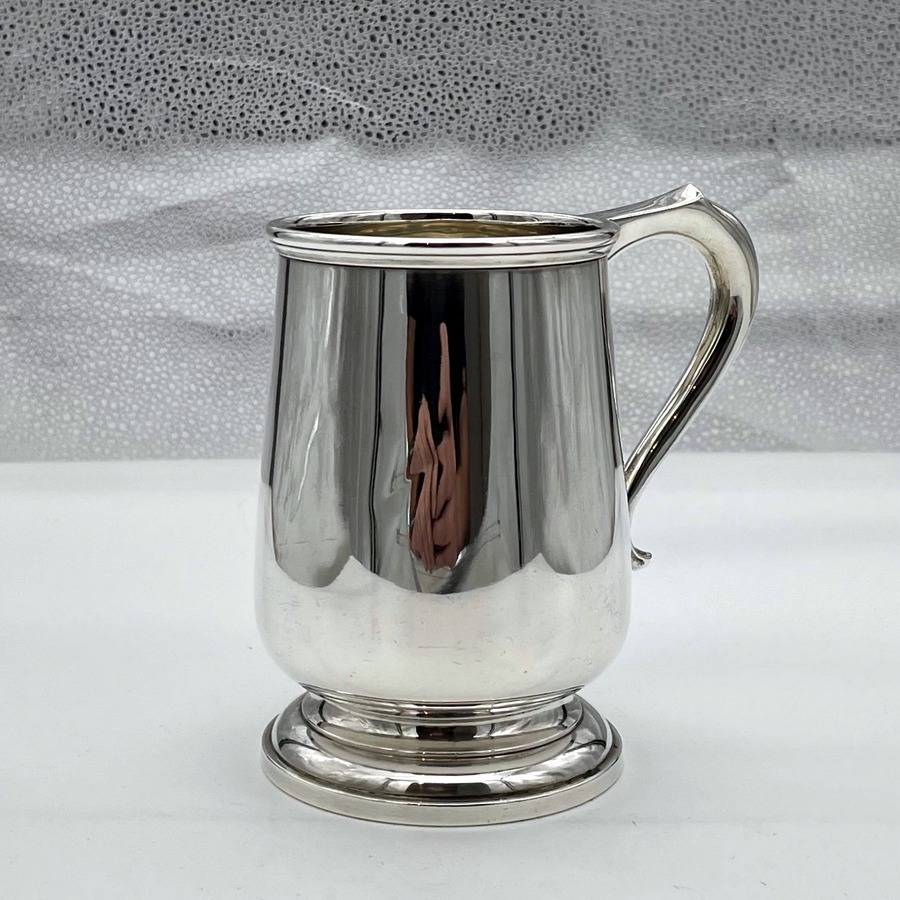 A very crisp sterling silver pint mug designed with an elegant plain formed theme and a beautiful scroll handle which has a stylish incorporate thumbpiece.