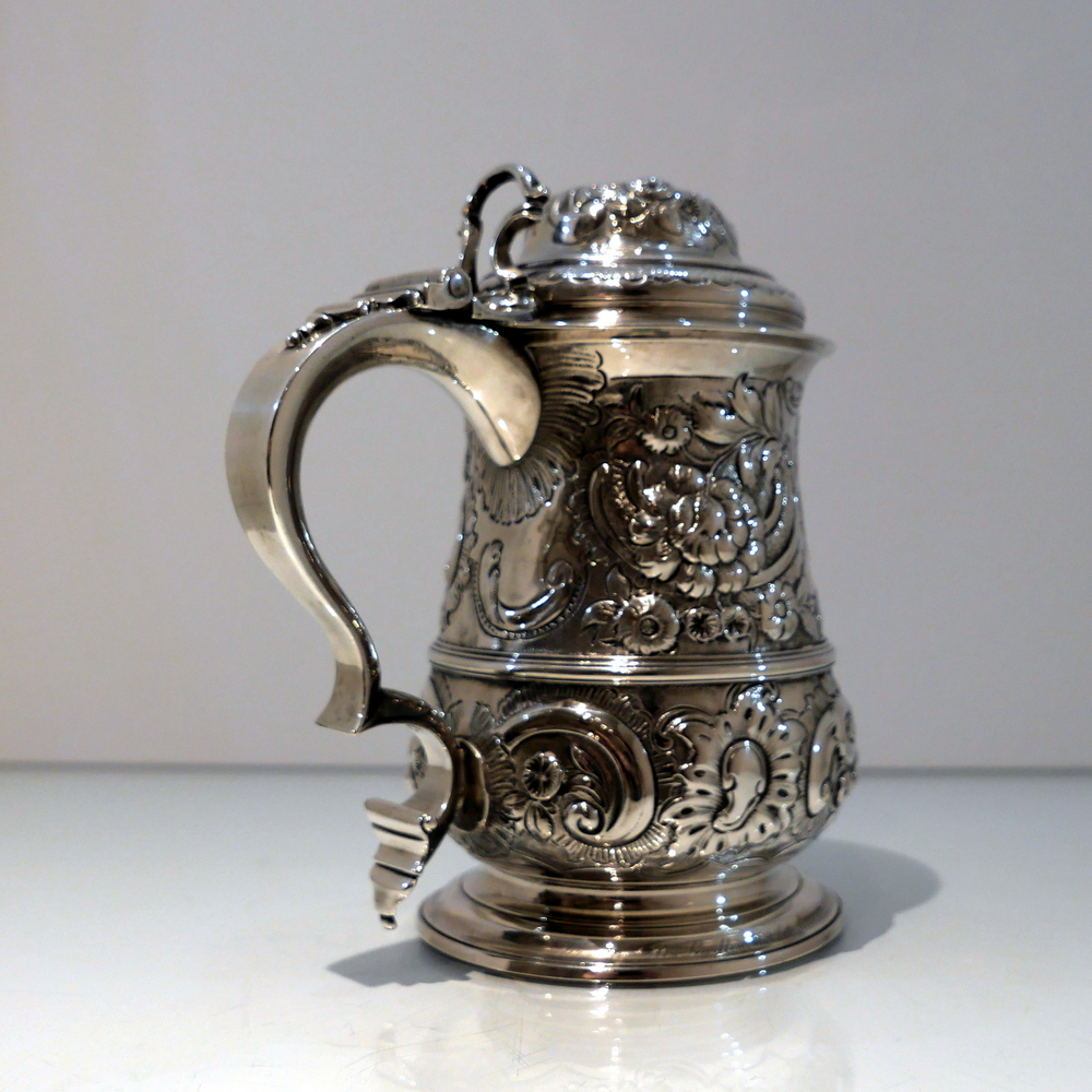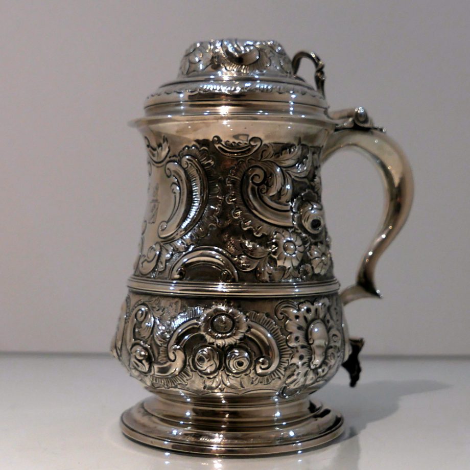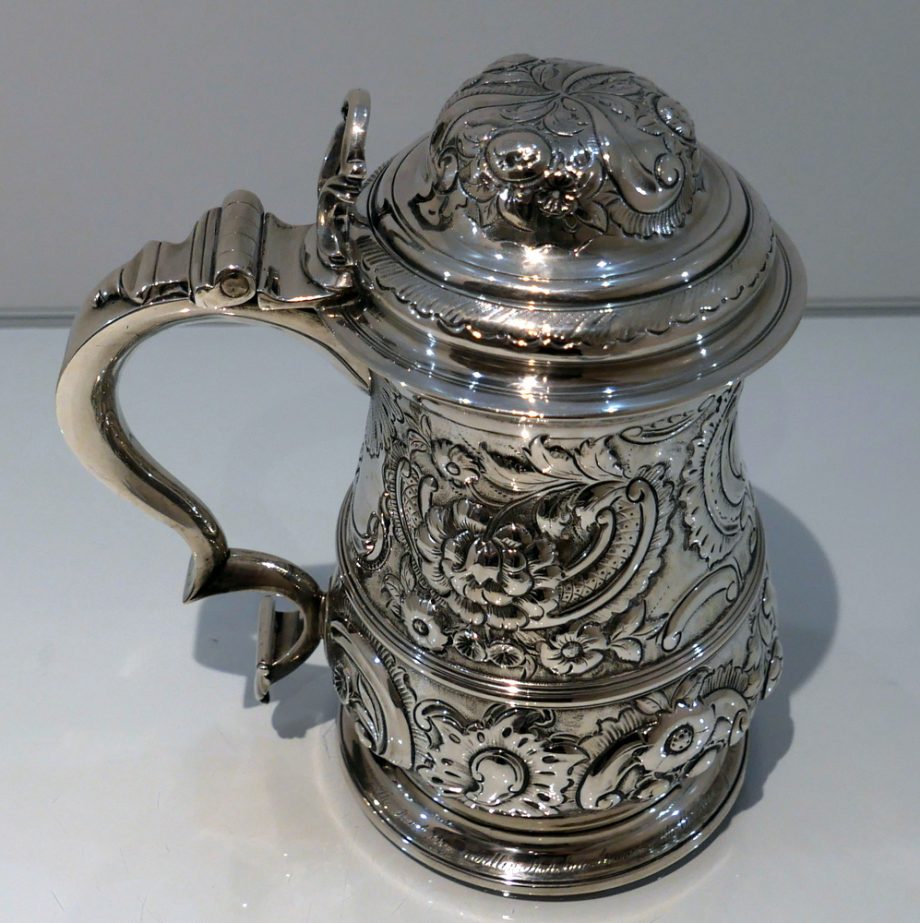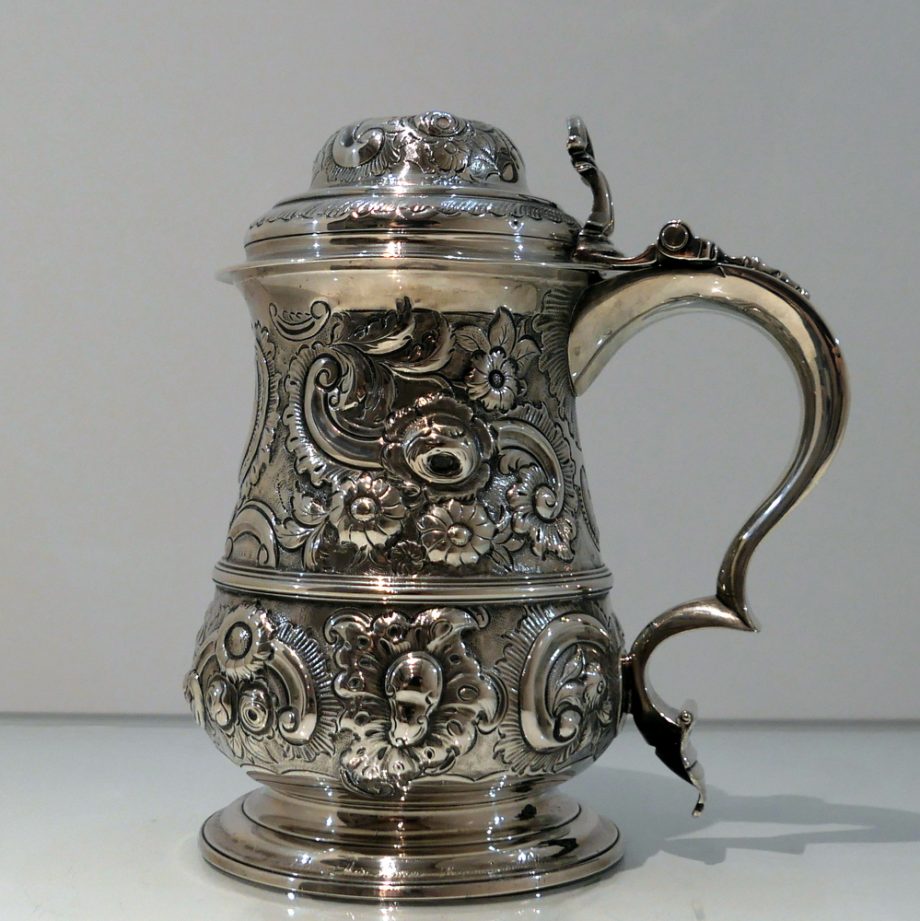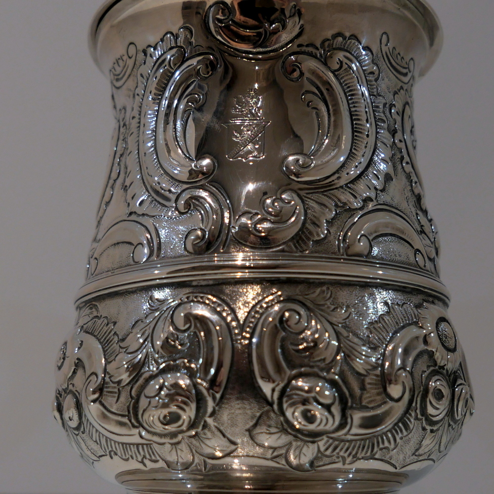 A large and incredibly fine mid 18th century quart sterling silver baluster tankard and cover decorated with ornate Victorian era floral hand chasing throughout. Â The domed lid is hinged and has an elegant cast wire thumbpiece. Â The centre front has an elaborate cartouche in which sits a contemporary engraved armorial for importance.