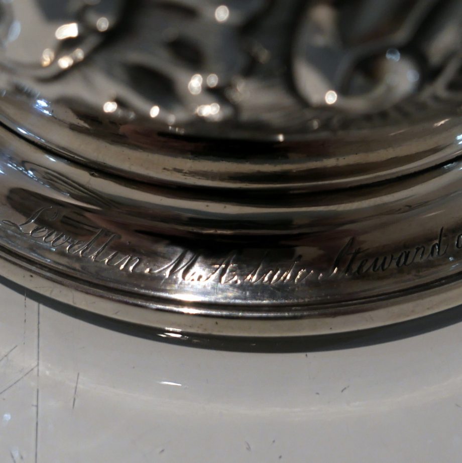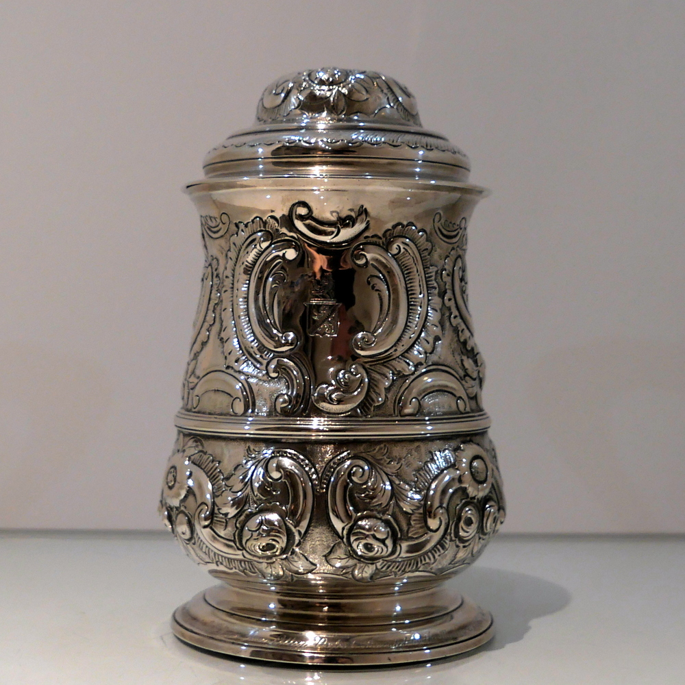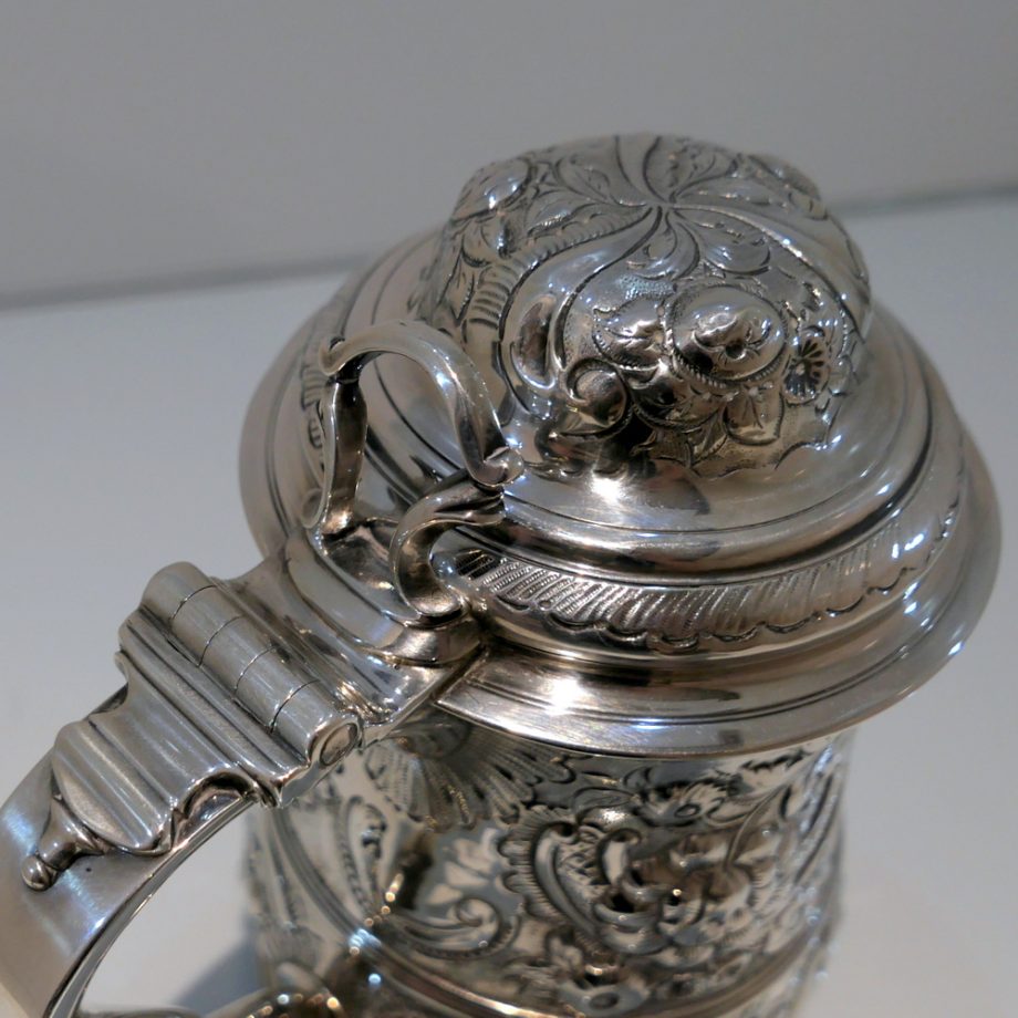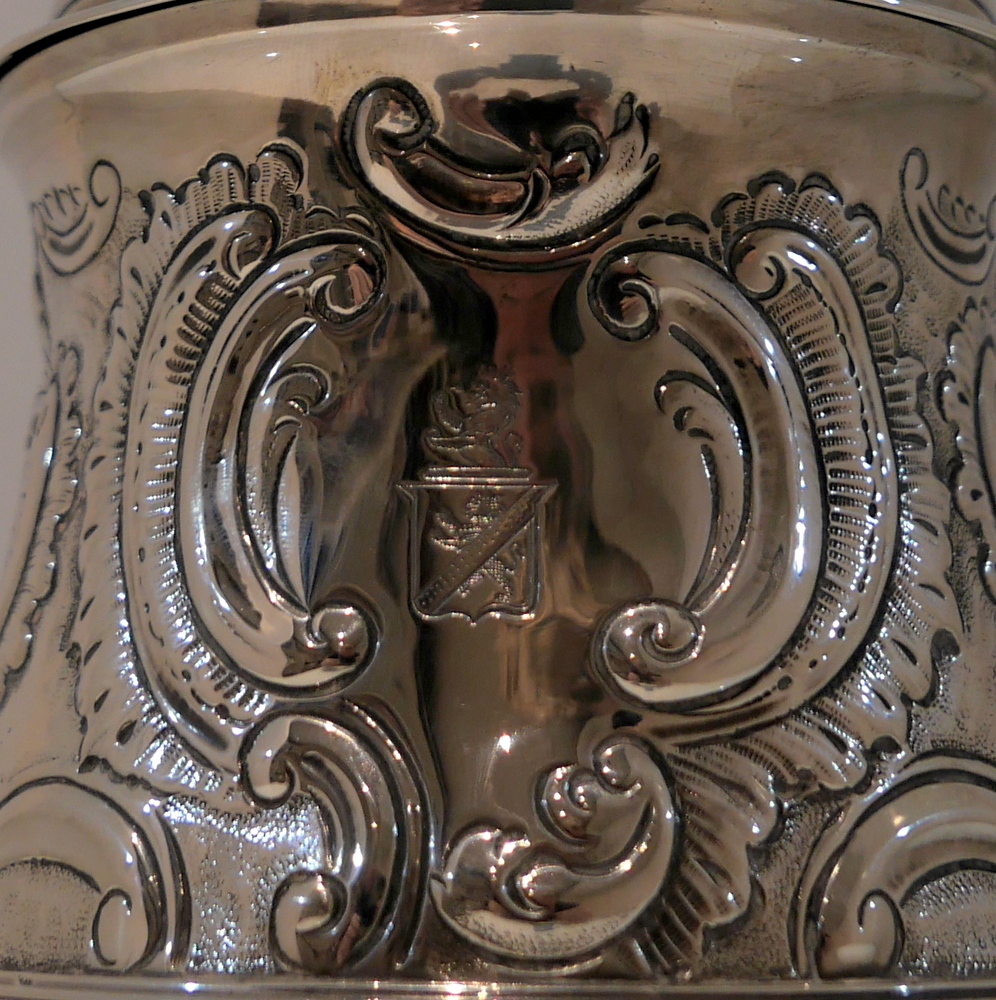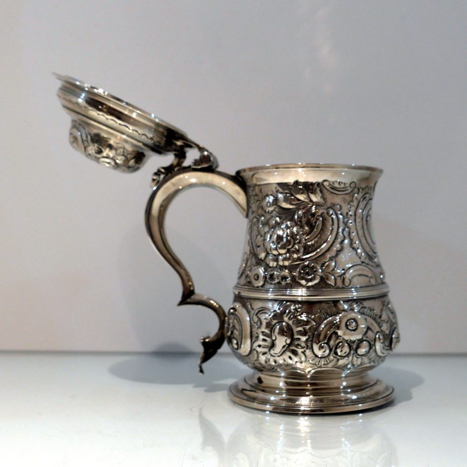 A large and incredibly fine mid 18th century quart sterling silver baluster tankard and cover decorated with ornate Victorian era floral hand chasing throughout. Â The domed lid is hinged and has an elegant cast wire thumbpiece. Â The centre front has an elaborate cartouche in which sits a contemporary engraved armorial for importance.