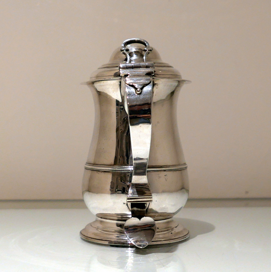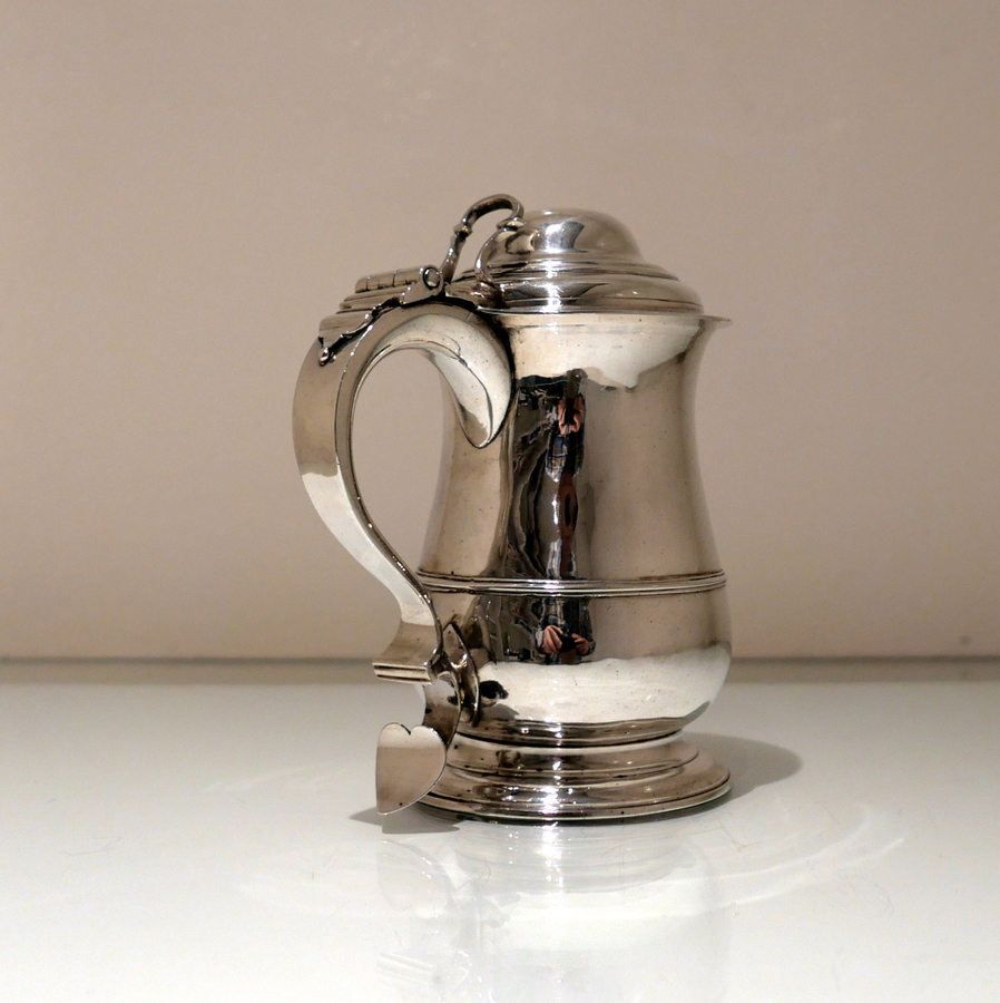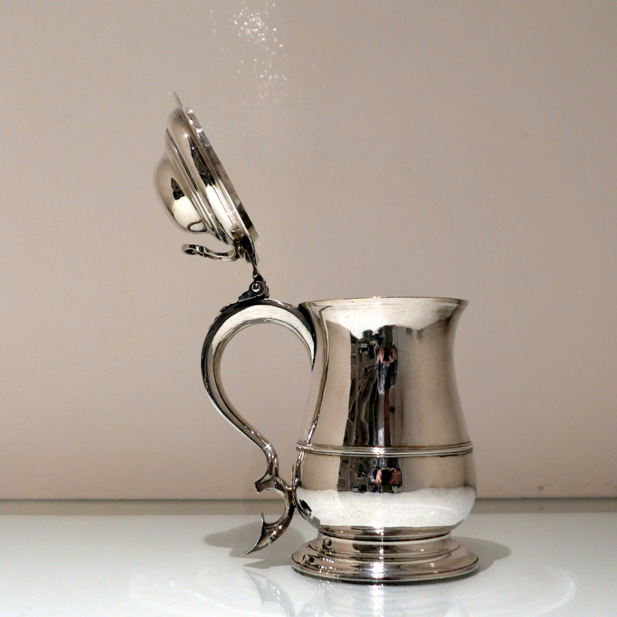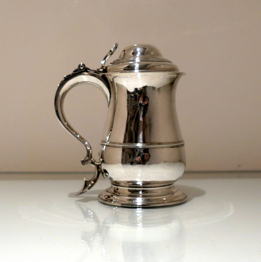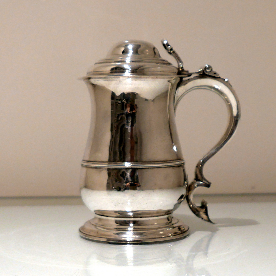 A fine and extremely good quality 18th century baluster tankard and cover elegantly plain formed in design and decorated with a “strap” work band to the lower part of the body. Â The domed lid is hinged and has a stylish wire work thumb piece.