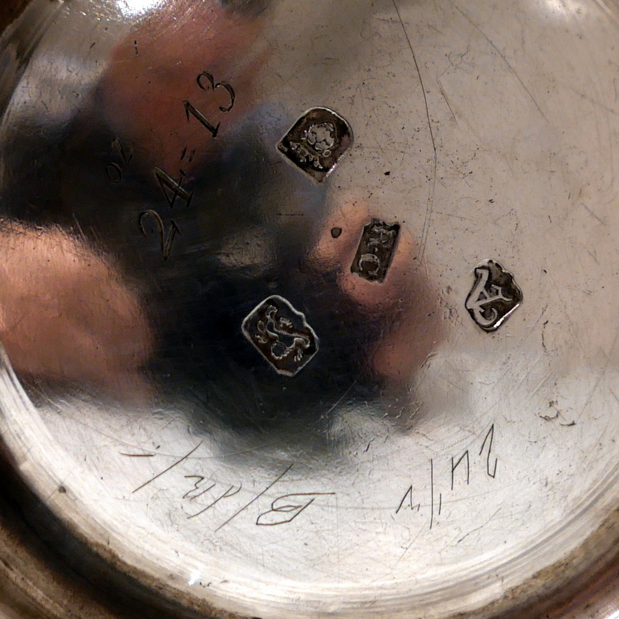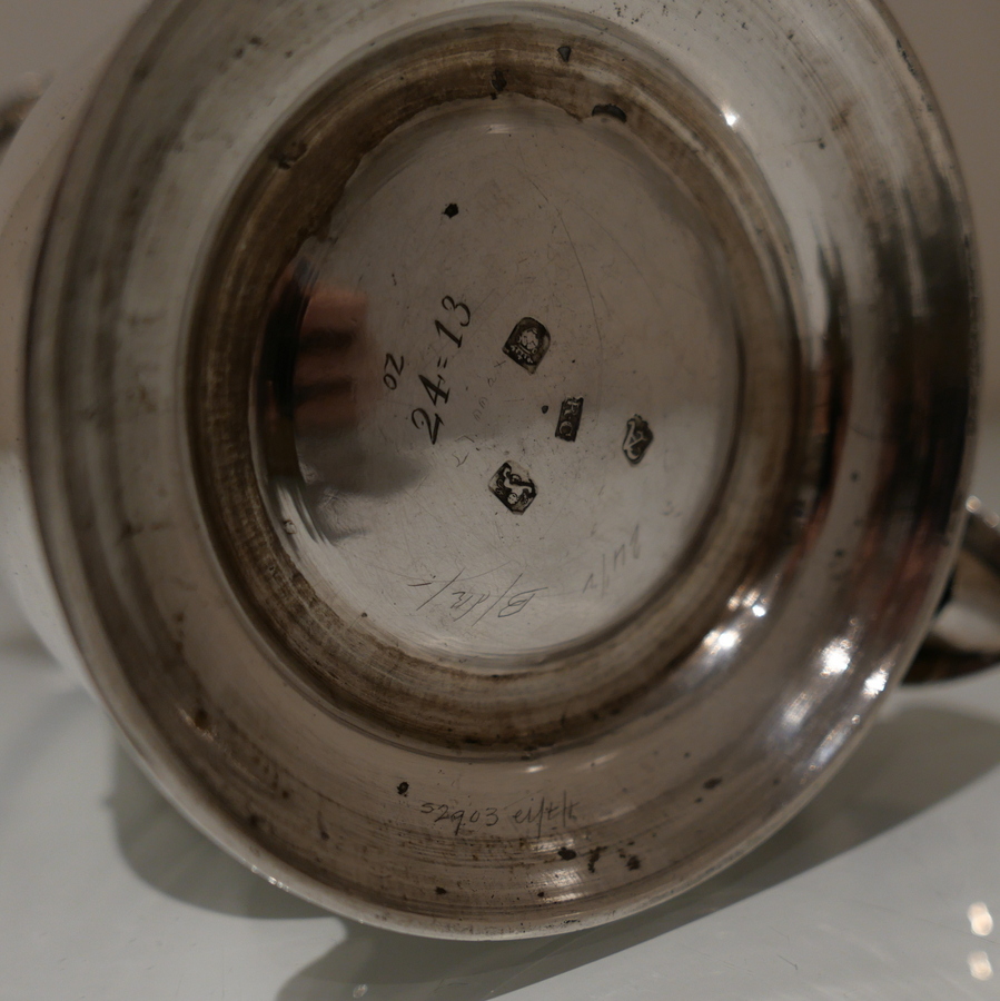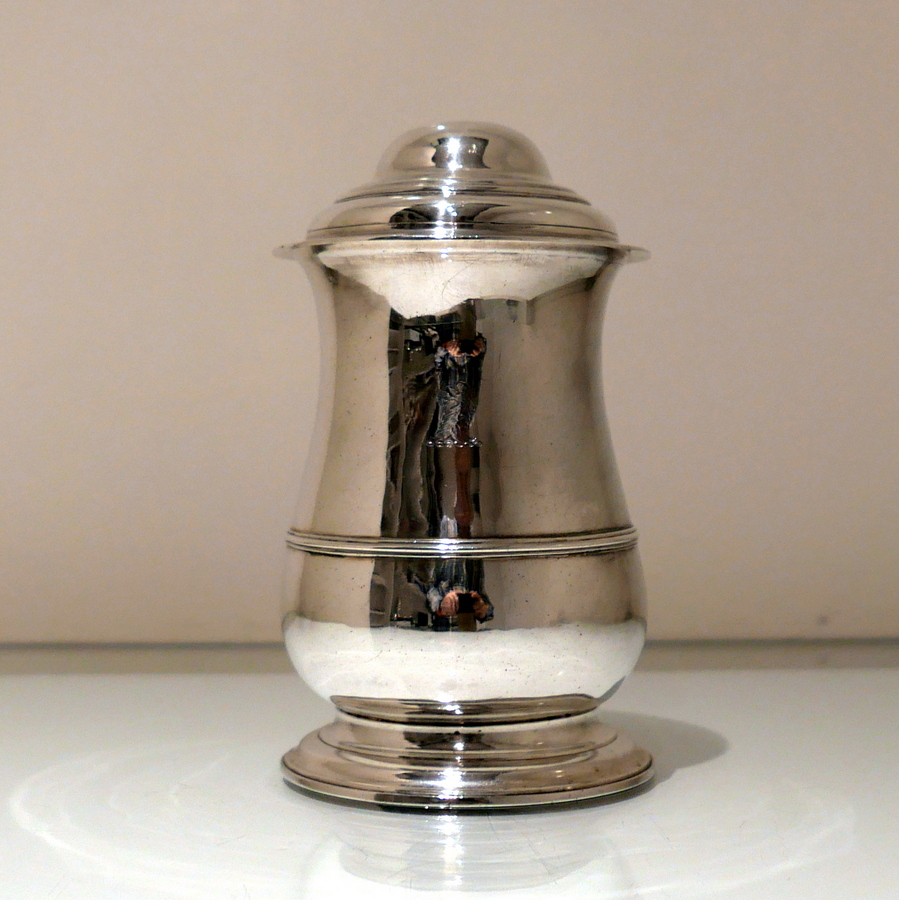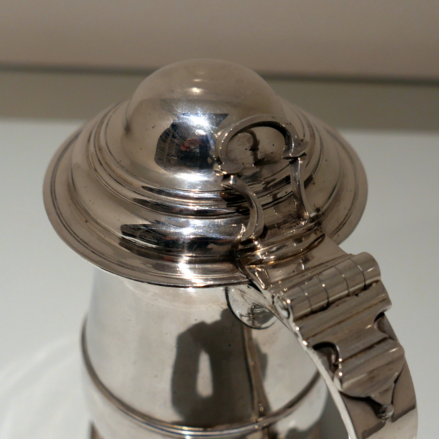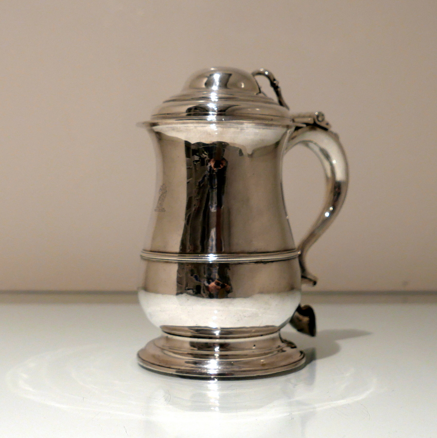 A fine and extremely good quality 18th century baluster tankard and cover elegantly plain formed in design and decorated with a “strap” work band to the lower part of the body. Â The domed lid is hinged and has a stylish wire work thumb piece.