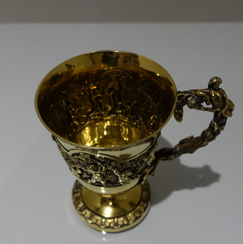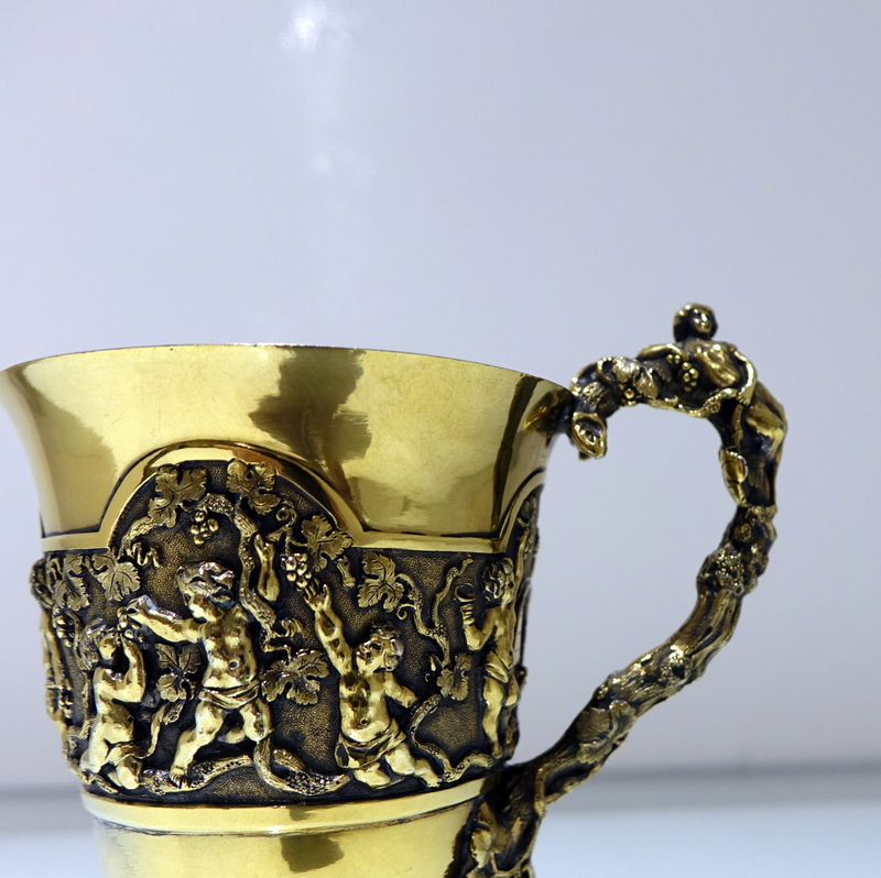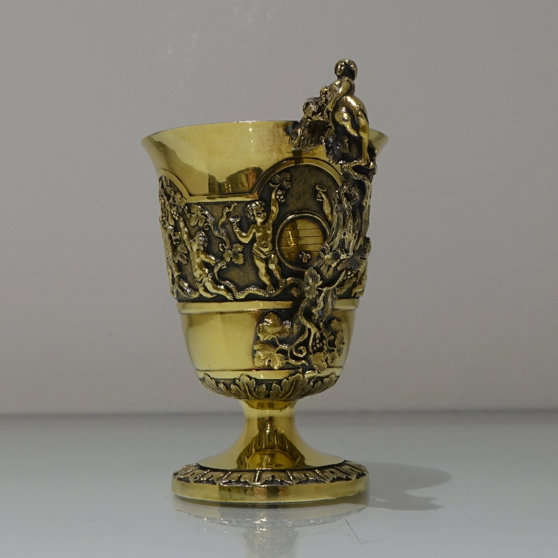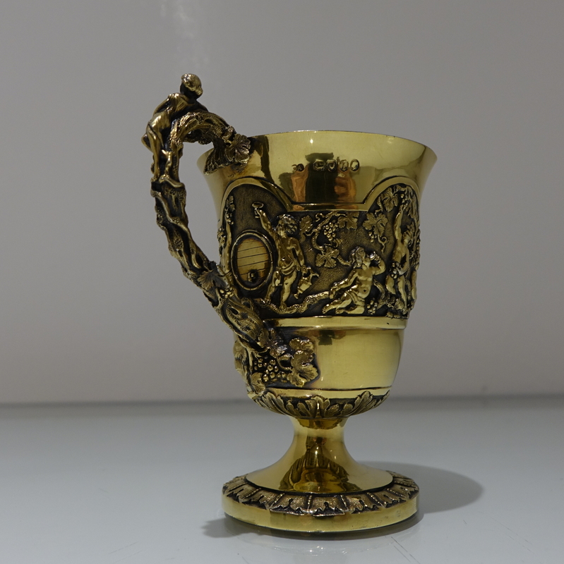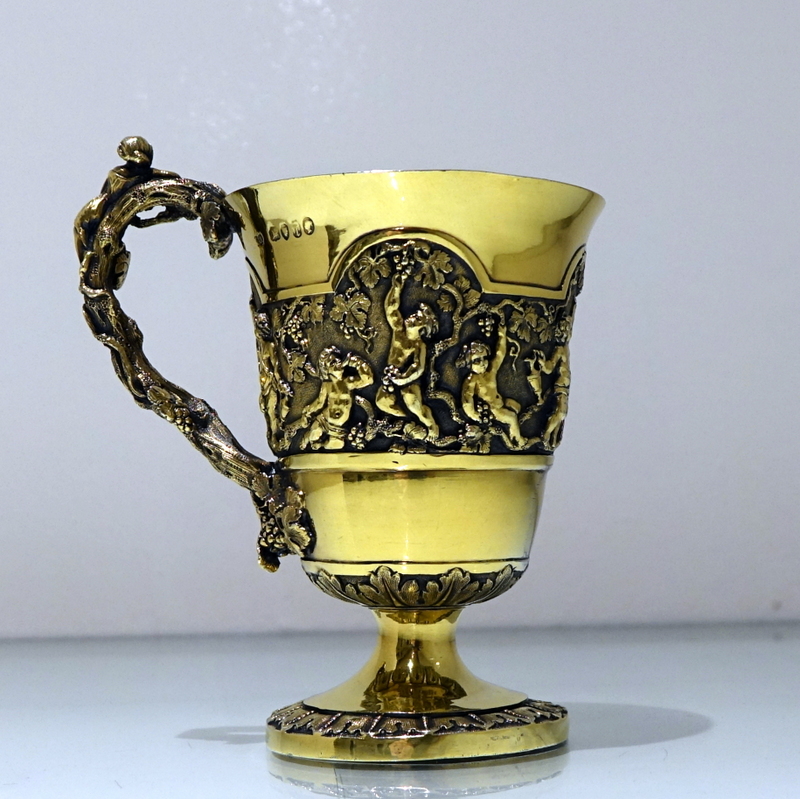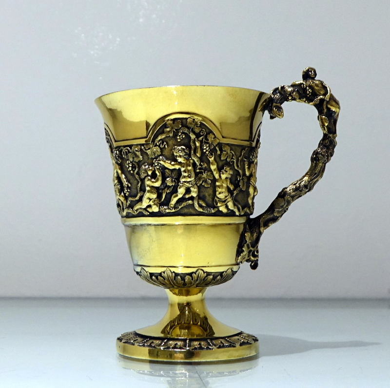 A magnificent mid 19th century silver gilt christening mug decorated with beautiful scenes of cherubs picking grapes from a climbing vine shrub which is then set on a matt background for decorative contrast. Â The mug has a stunning cast naturalistic handle with an outstanding “relaxing figural” thumb piece for design focusing highlights.
