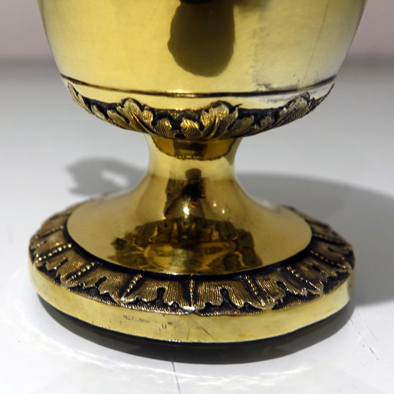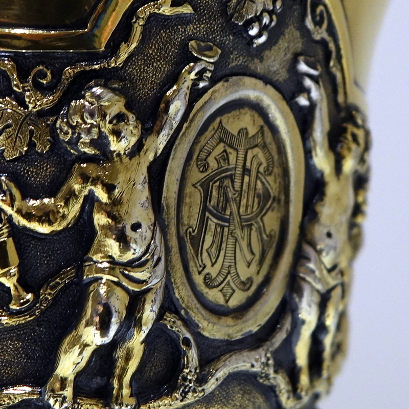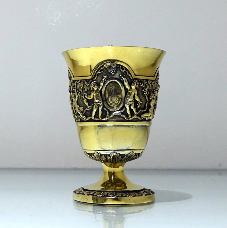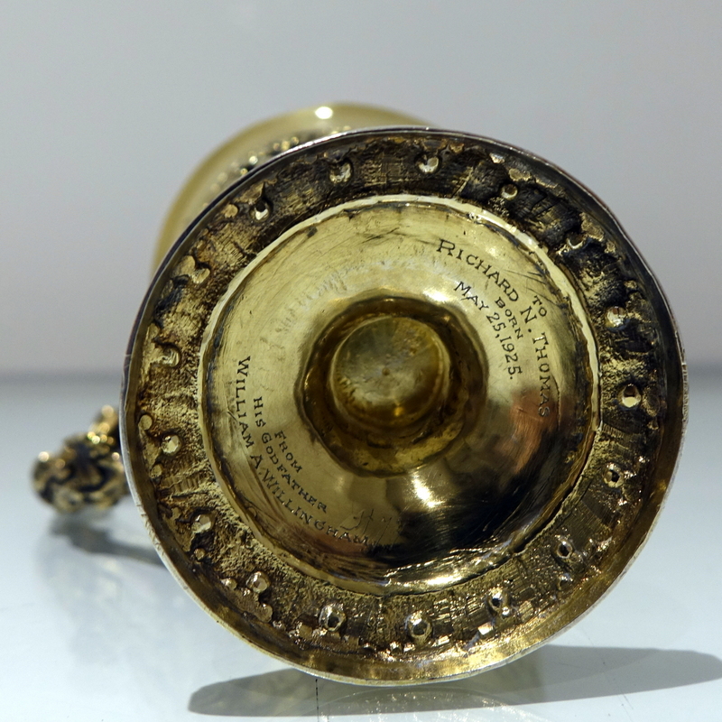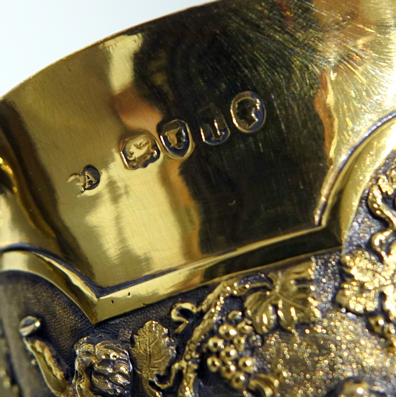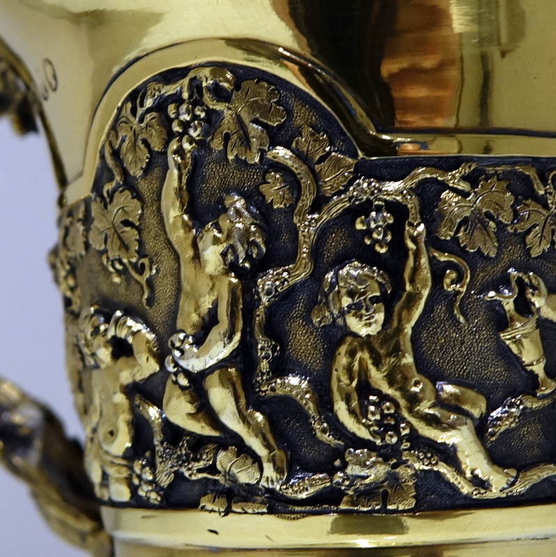 A magnificent mid 19th century silver gilt christening mug decorated with beautiful scenes of cherubs picking grapes from a climbing vine shrub which is then set on a matt background for decorative contrast. Â The mug has a stunning cast naturalistic handle with an outstanding “relaxing figural” thumb piece for design focusing highlights.