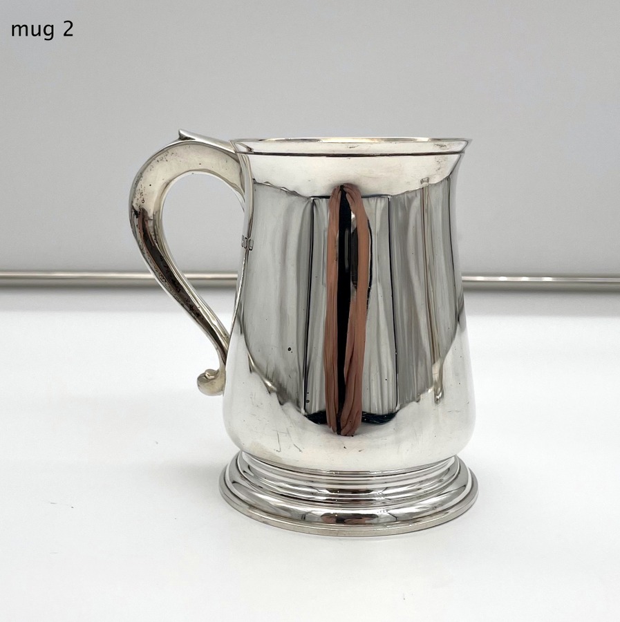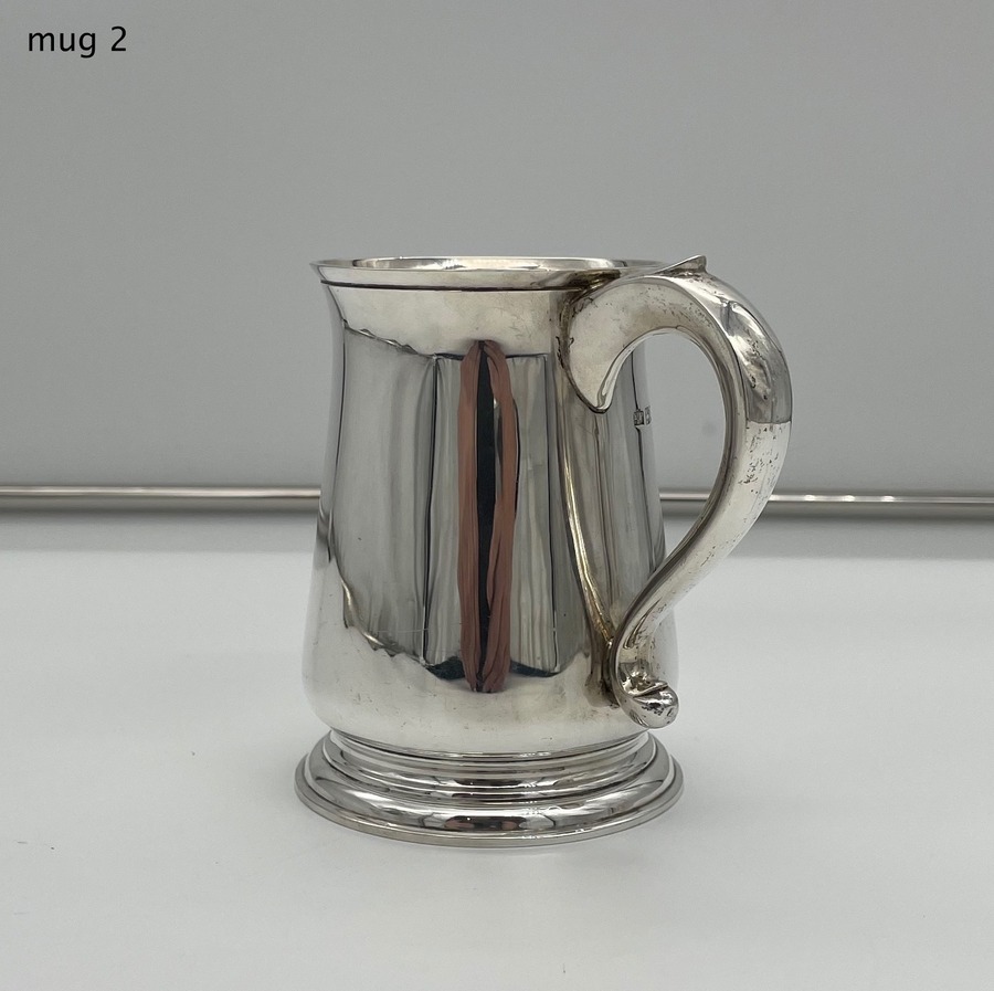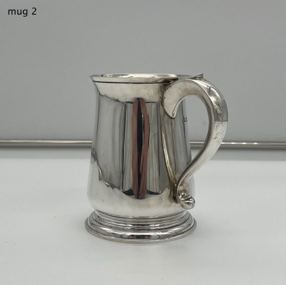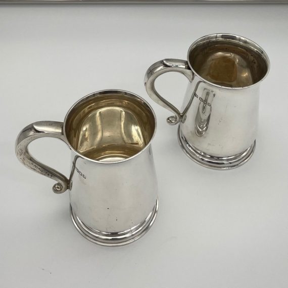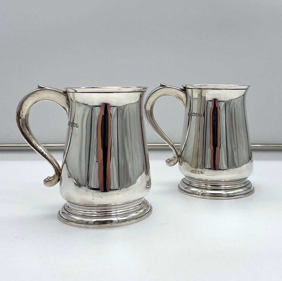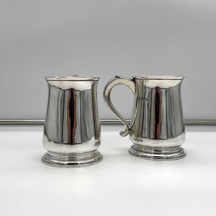 A fine pair of sterling silver pint mugs styled in an elegant plain formed manner and designed with stylish scroll handles.
