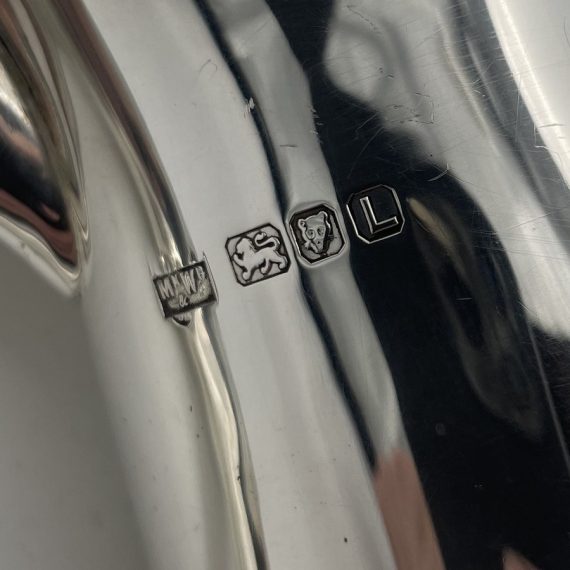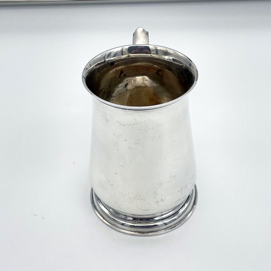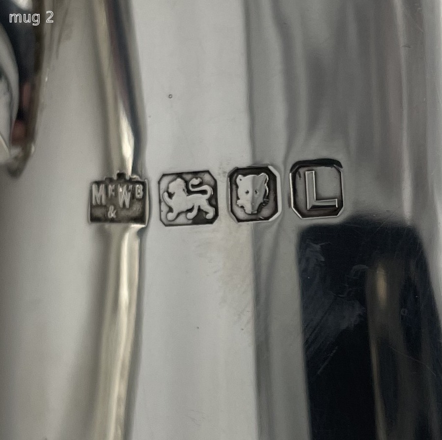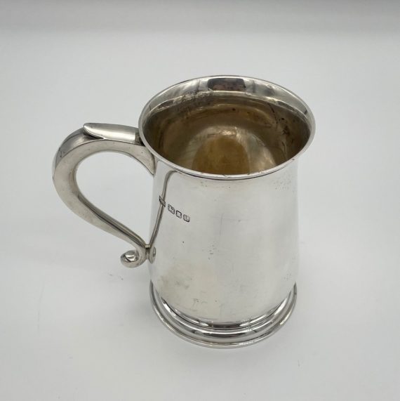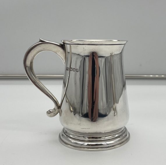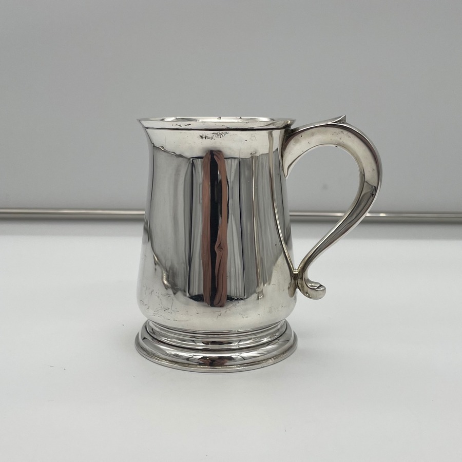 A fine pair of sterling silver pint mugs styled in an elegant plain formed manner and designed with stylish scroll handles.
