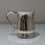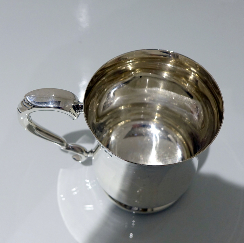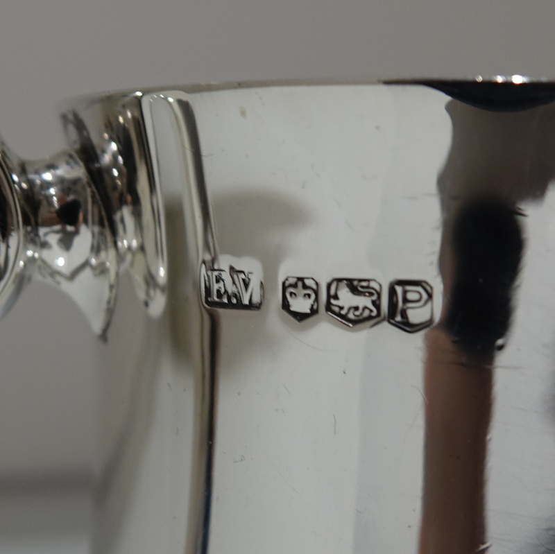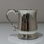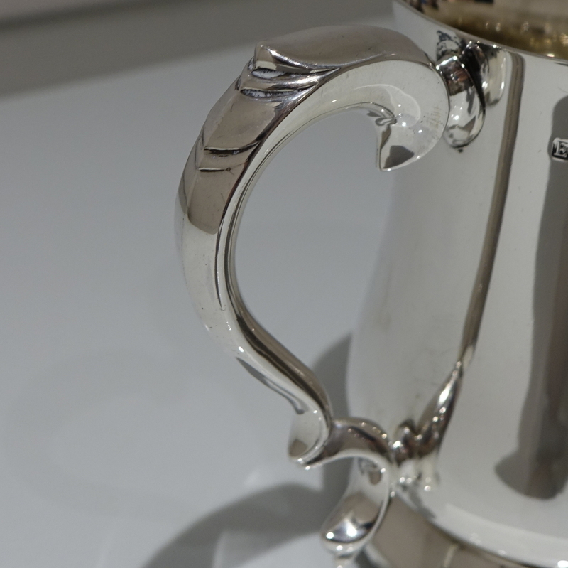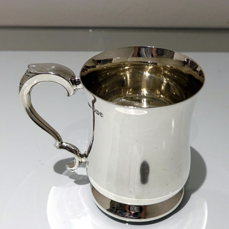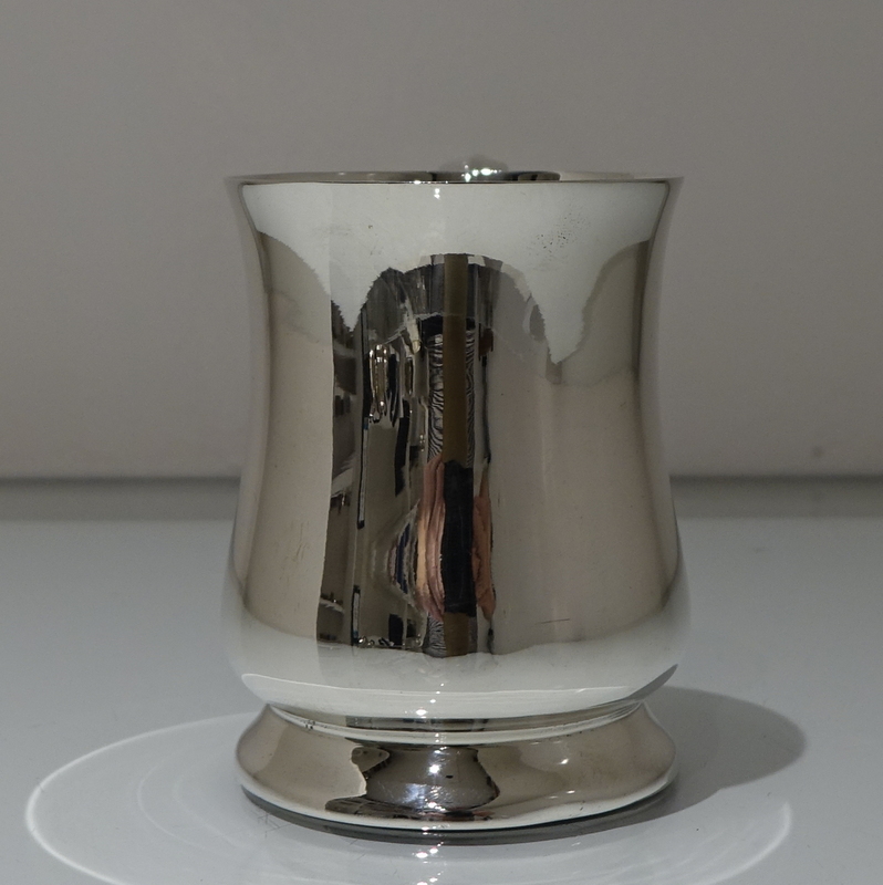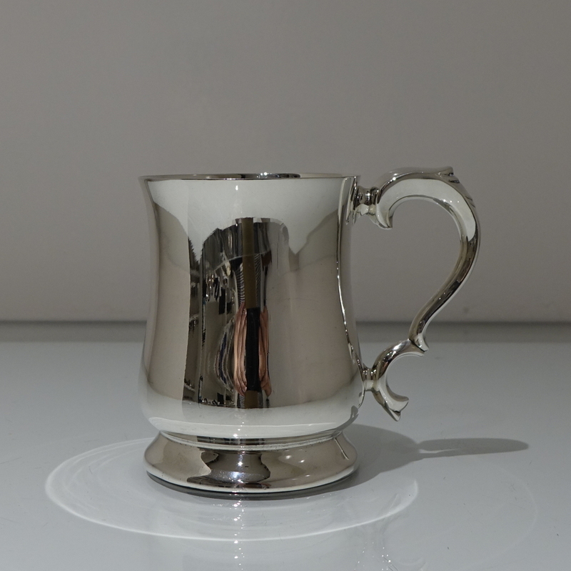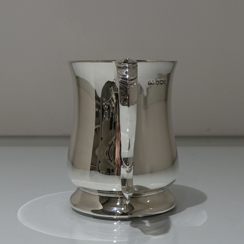 An elegant plain formed modern silver baluster shaped pint mug with an applied double scroll handle which has a stylish moulded thumb piece incorporated into its design.