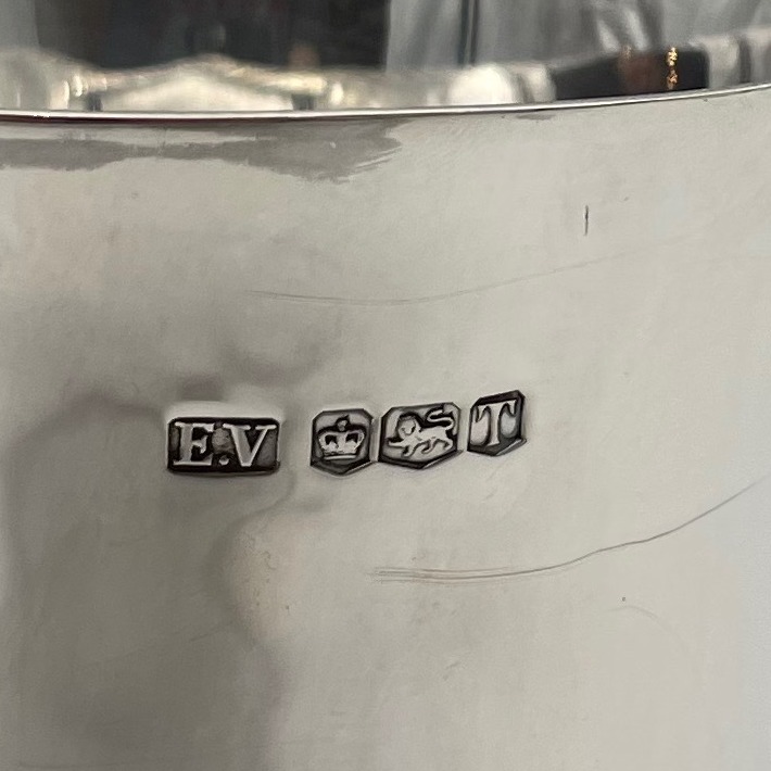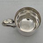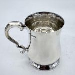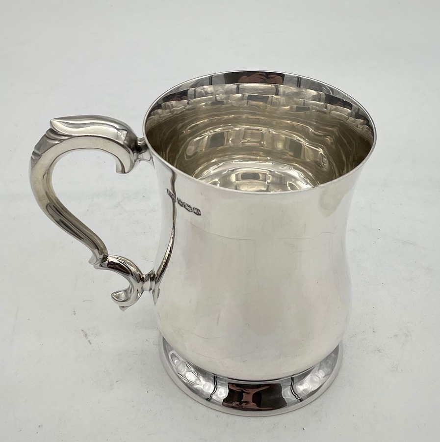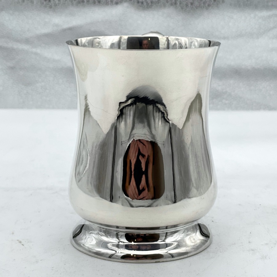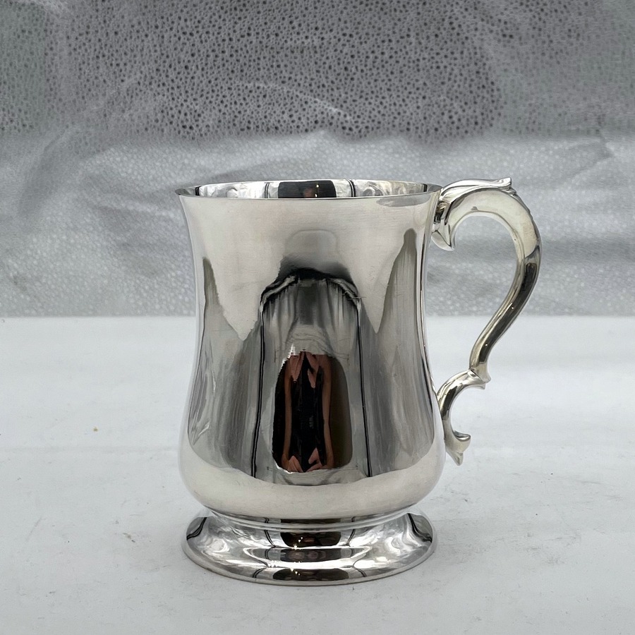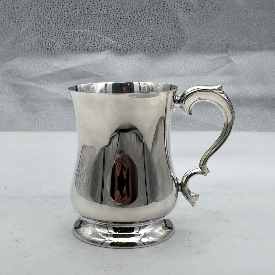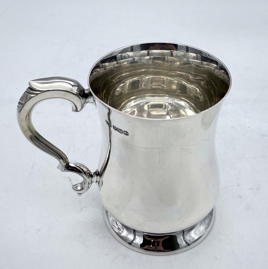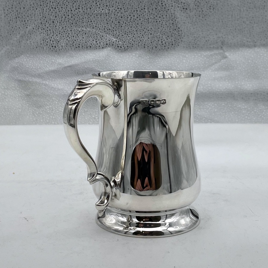 A delightful plain formed sterling silver baluster pint mug designed with a stylish double scroll handle which has an elegant integrated moulded thumbpiece.