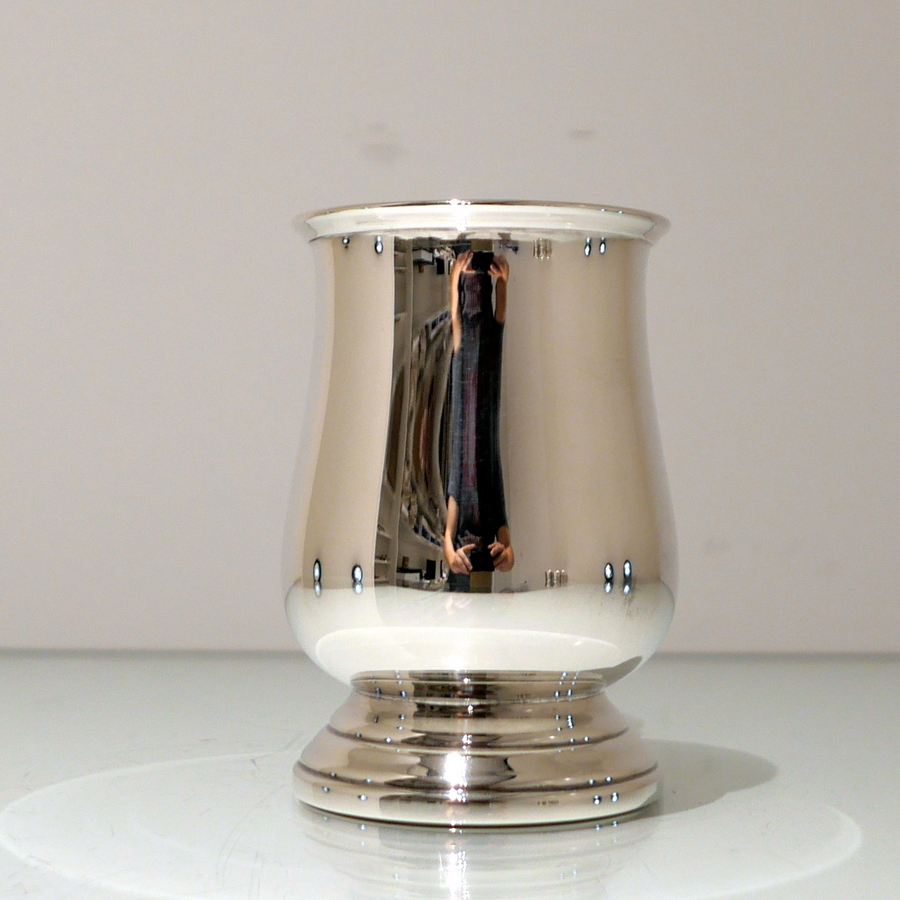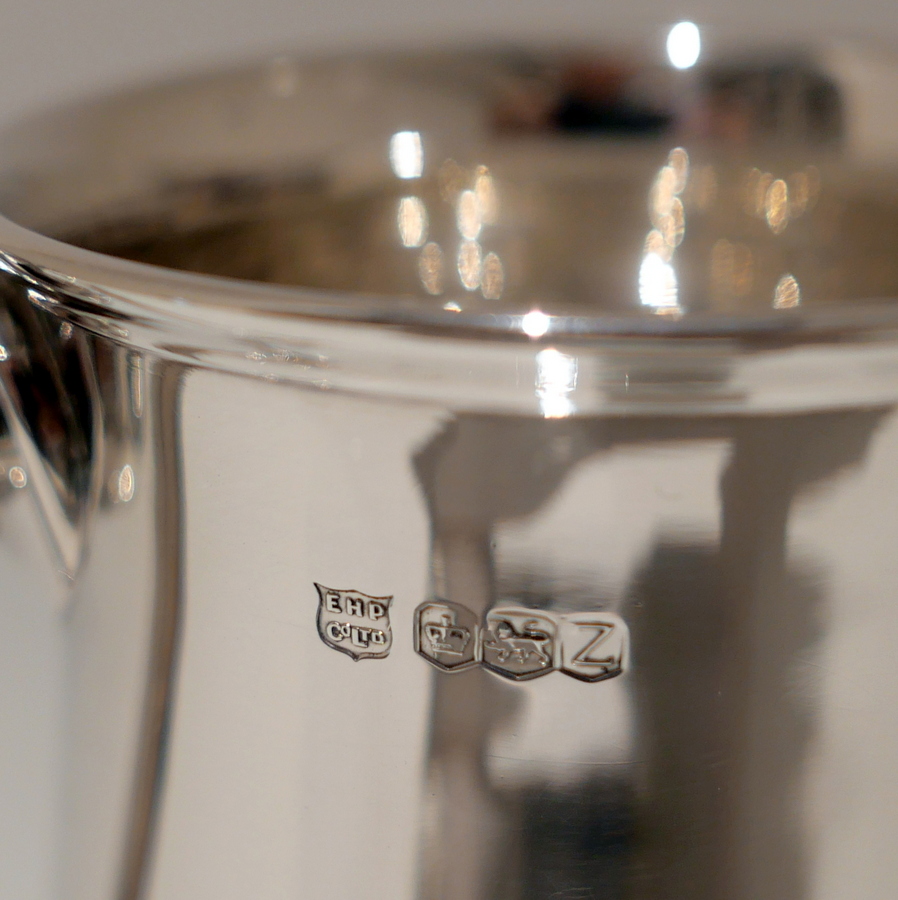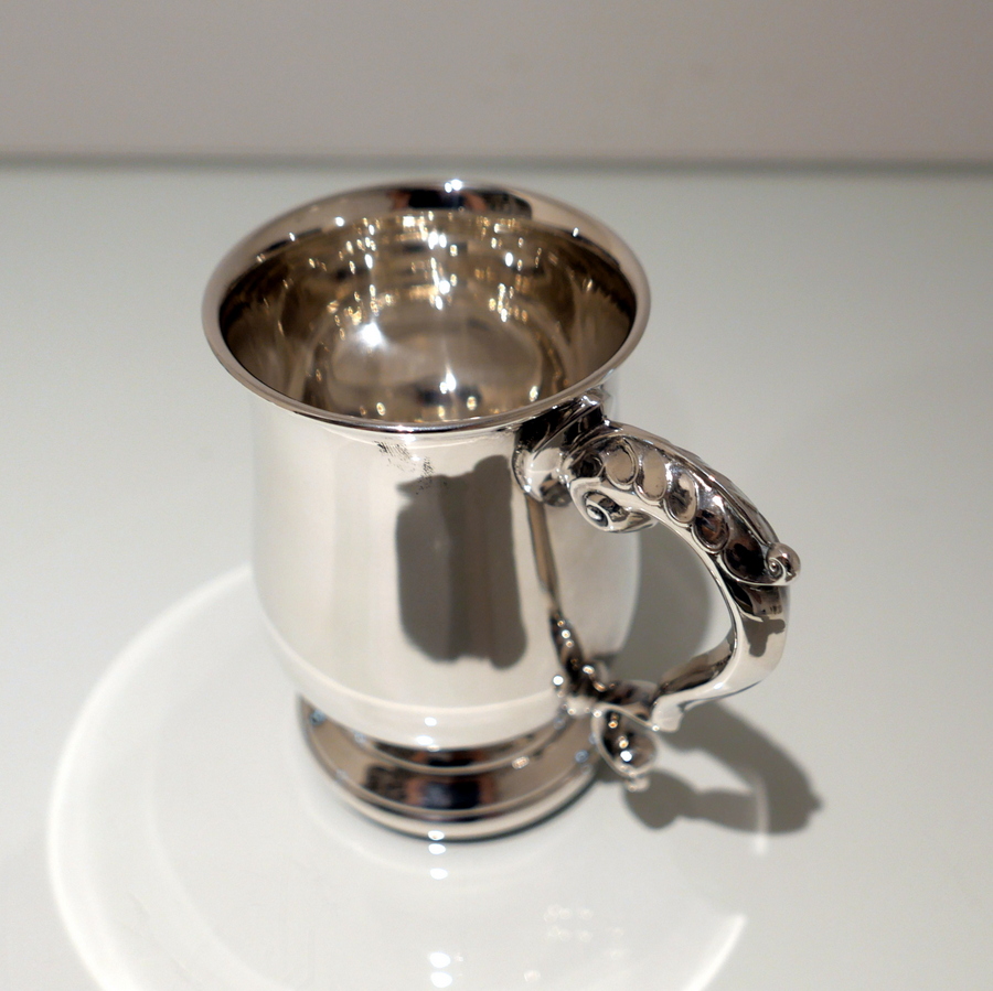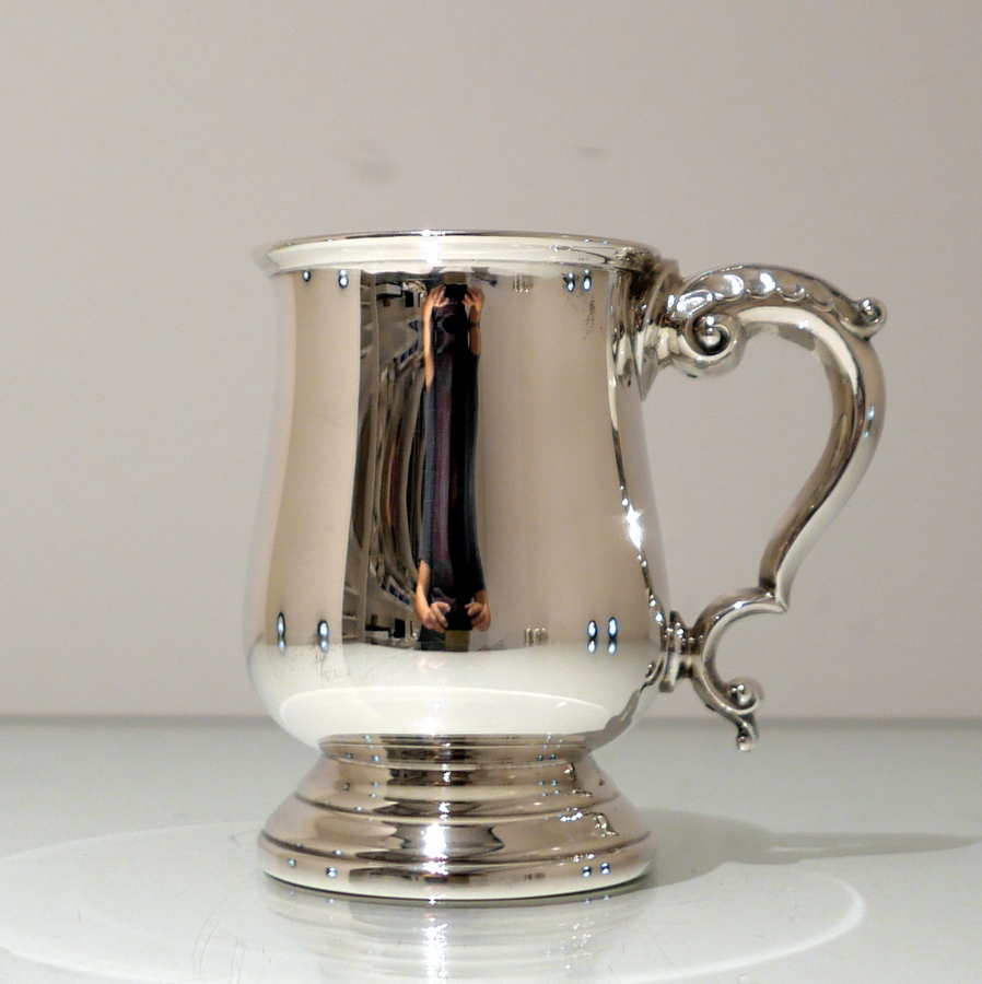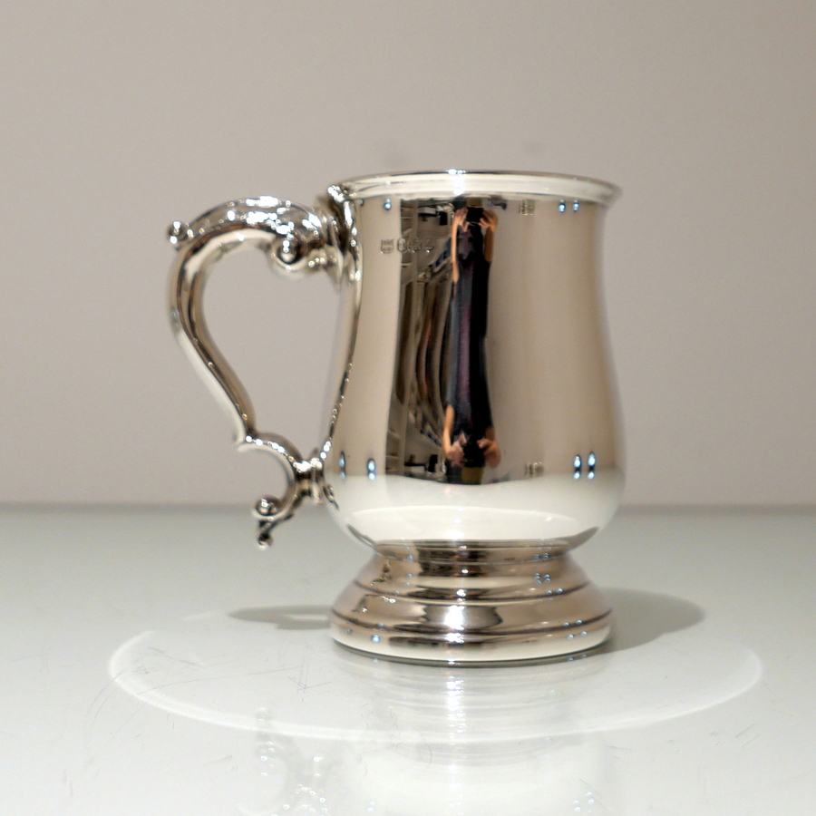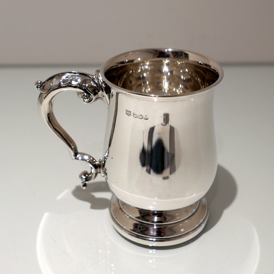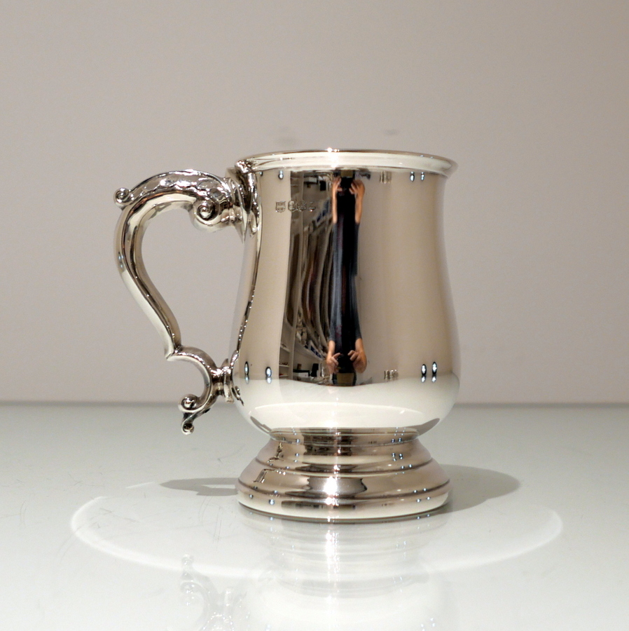 A beautiful mid 20th century sterling silver baluster shaped pint mug elegantly plain formed in design. Â The stylish applied double scroll handle is crowned with a sumptuous ‘acanthus’ decorated style thumbpiece.