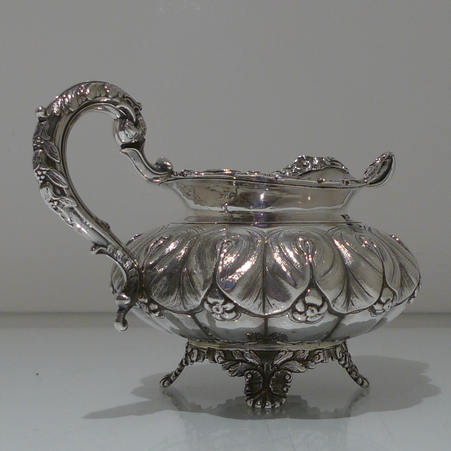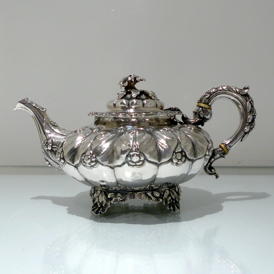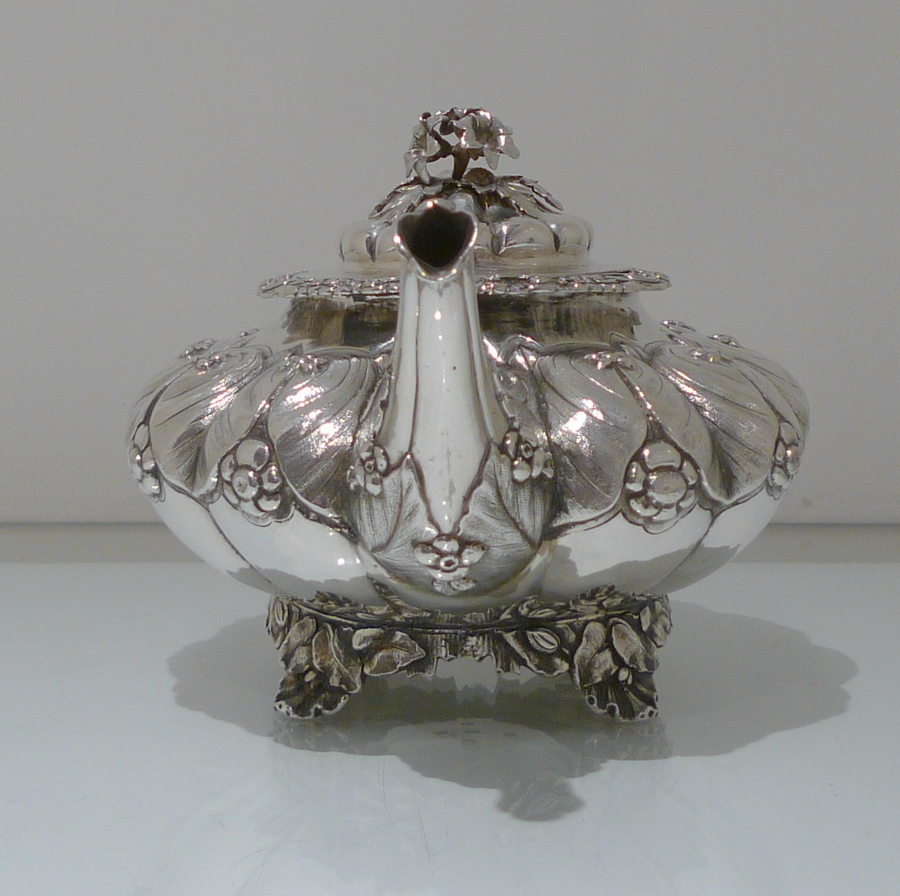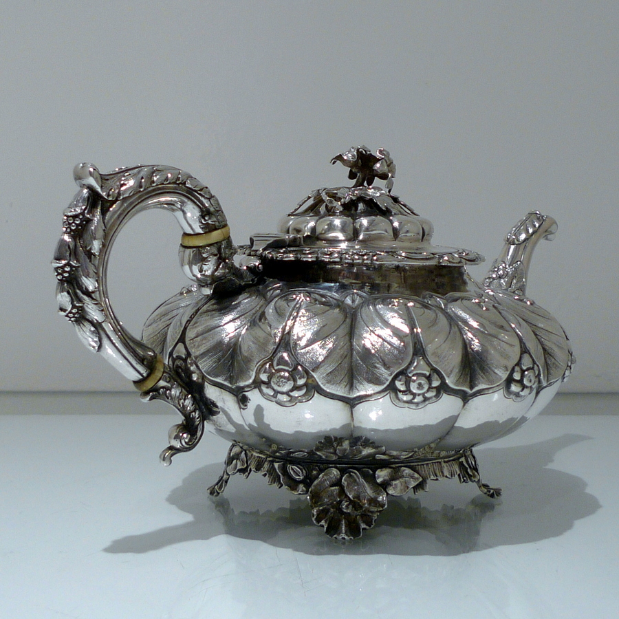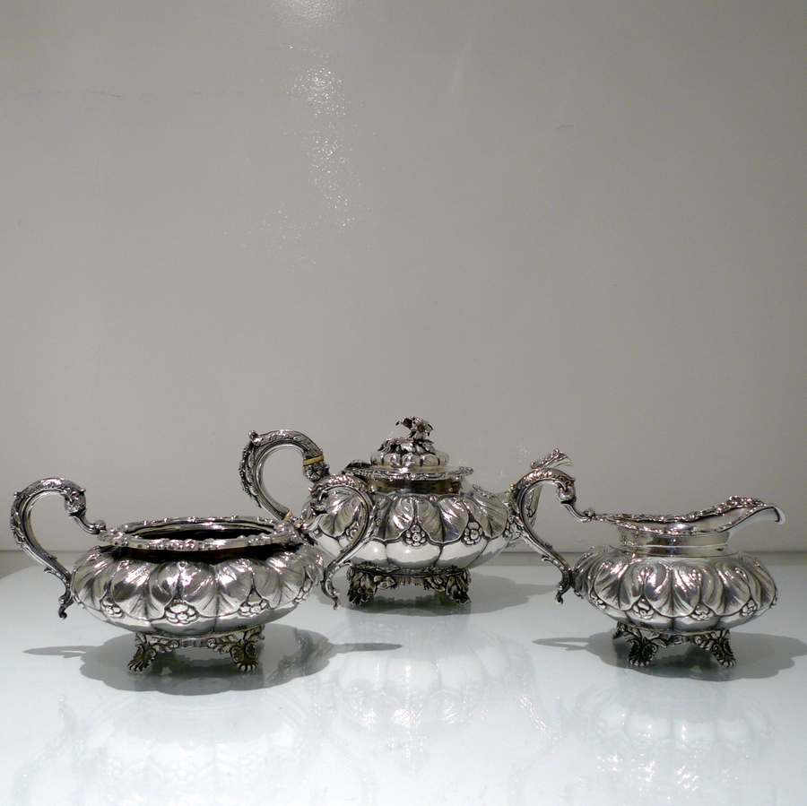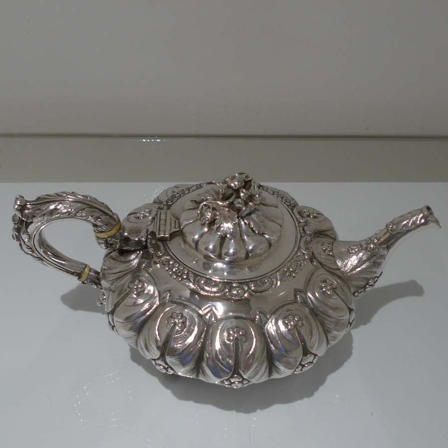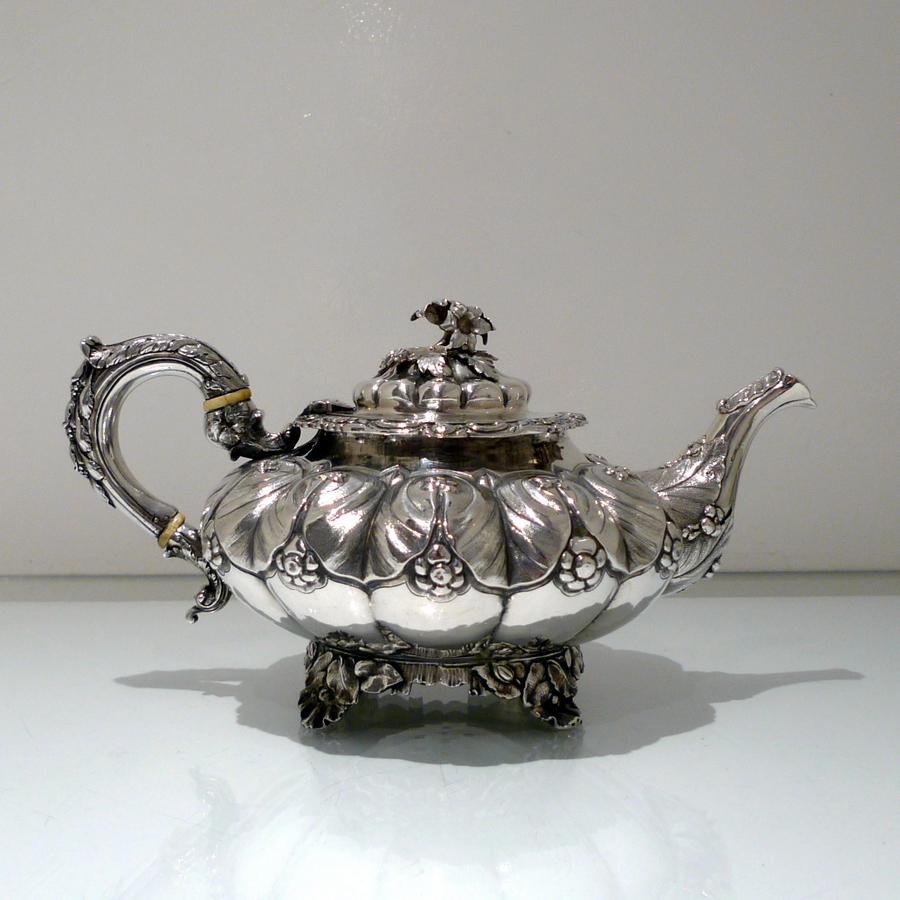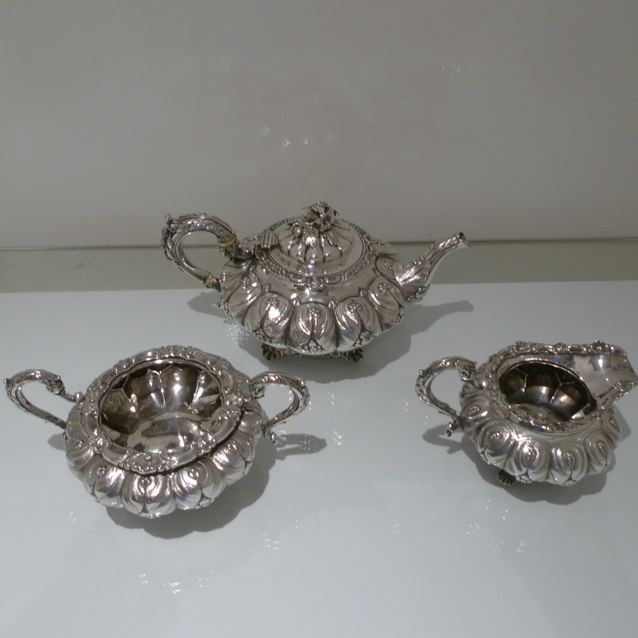 A truly beautiful and extremely stylish shaped circular three piece teaset decorated with ornate floral upper chasing and lower plain formed flute designs for decorative contrast. Â The splendidly ornate scroll formed handle rounds off a beautifully designed Irish teaset.
