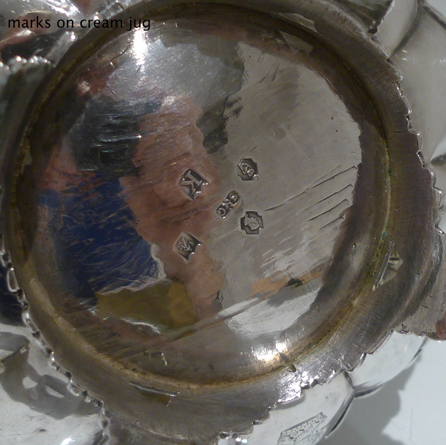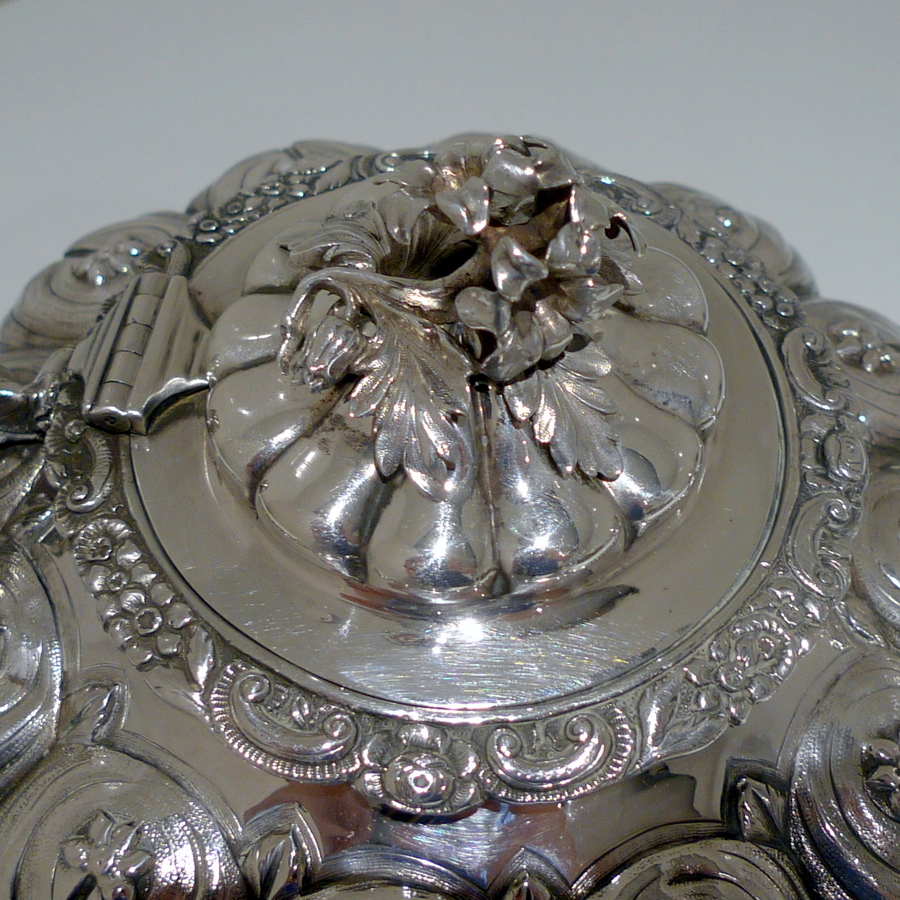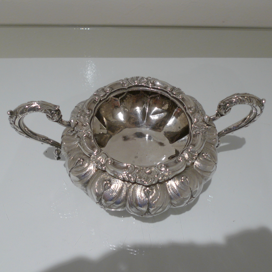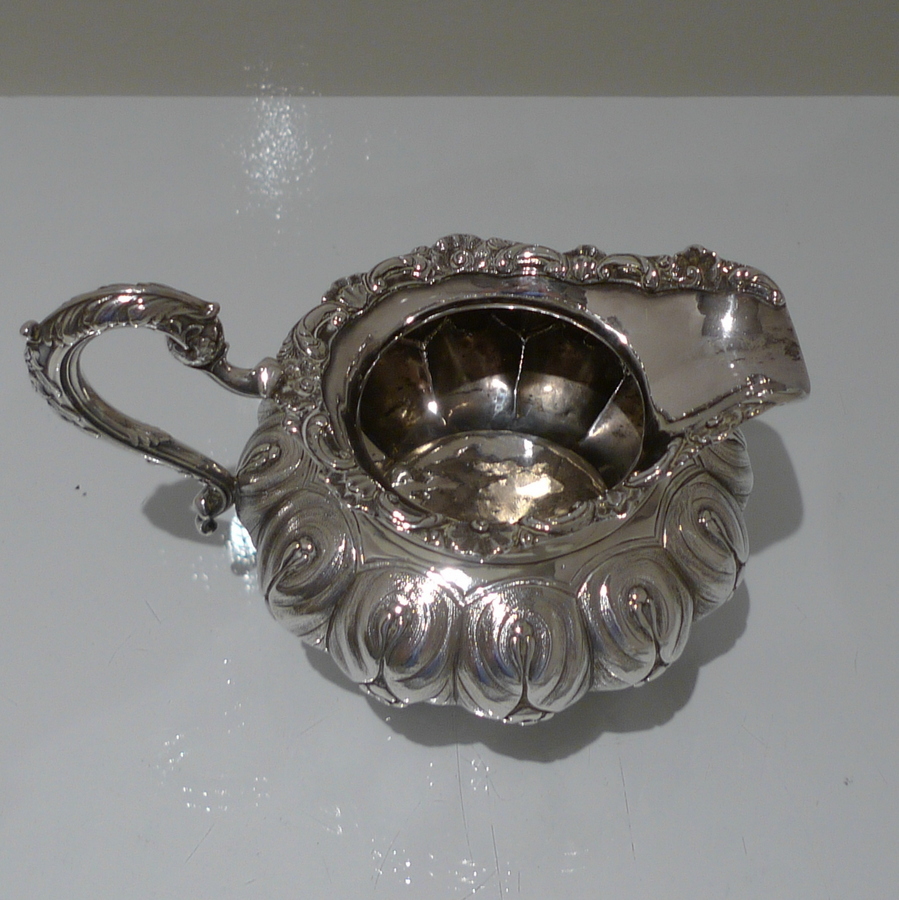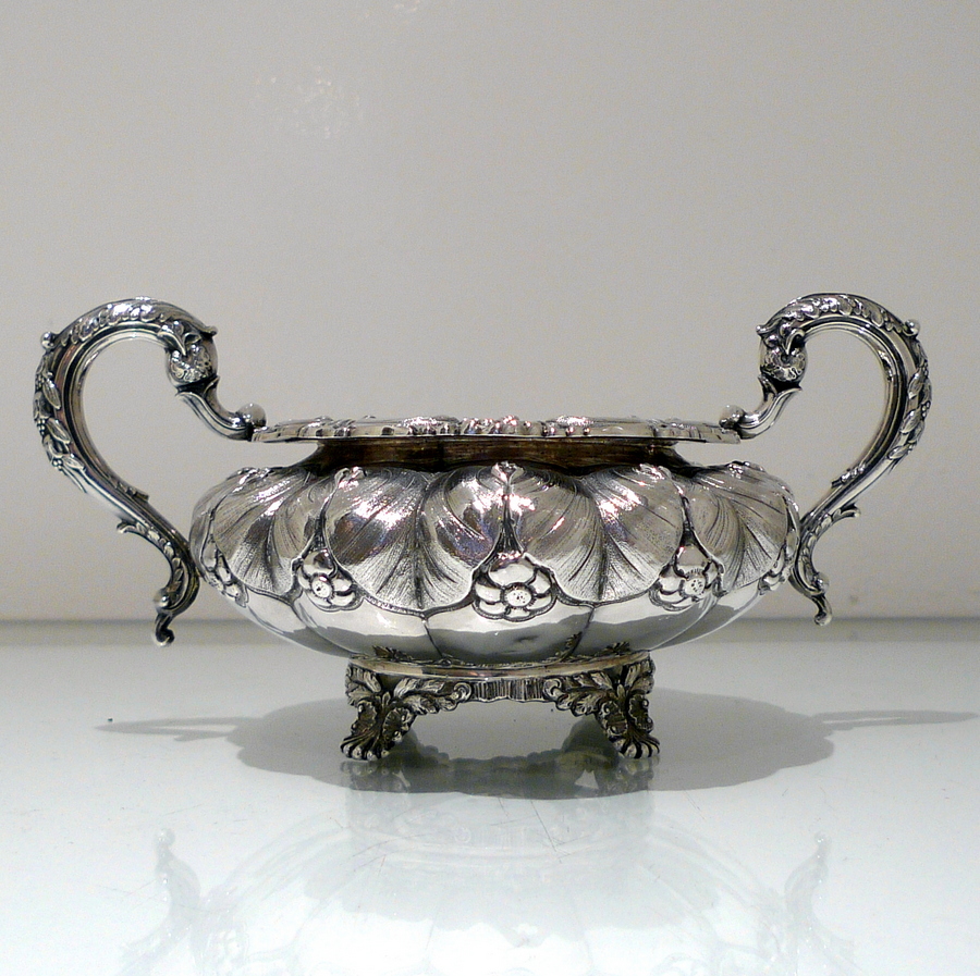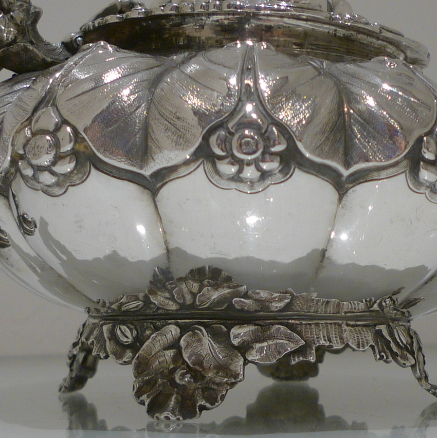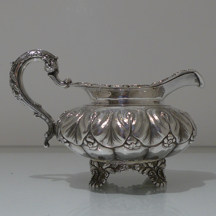 A truly beautiful and extremely stylish shaped circular three piece teaset decorated with ornate floral upper chasing and lower plain formed flute designs for decorative contrast. Â The splendidly ornate scroll formed handle rounds off a beautifully designed Irish teaset.