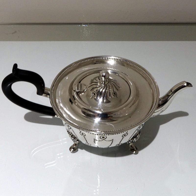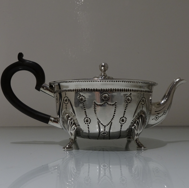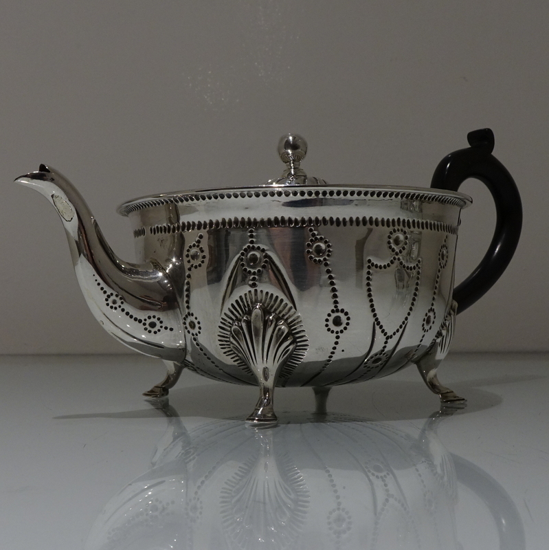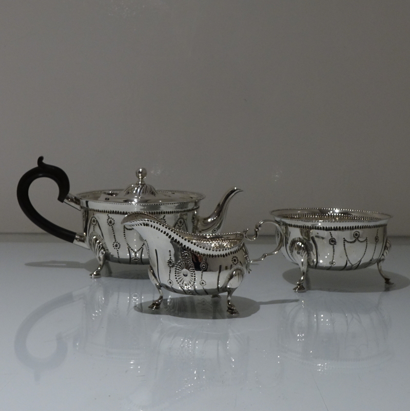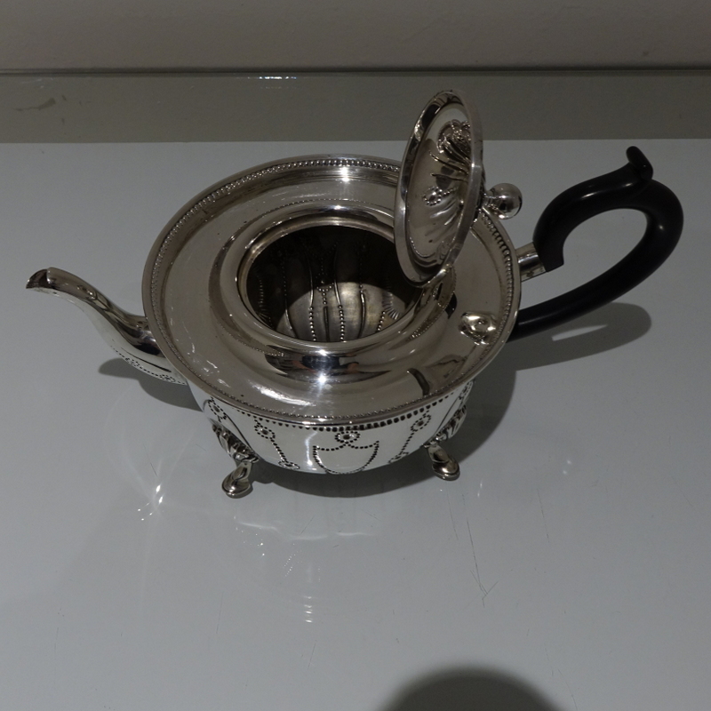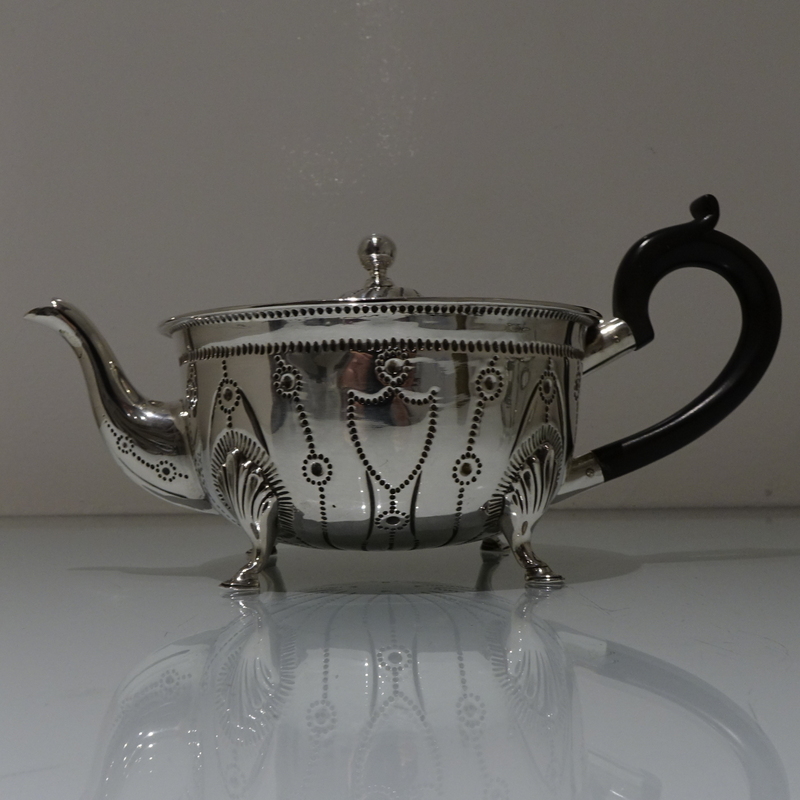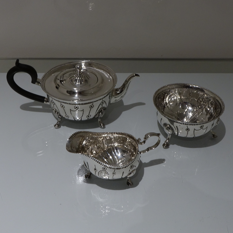 A beautiful and incredibly rare designed Edwardian three piece silver tea set decorated with waves of elaborate “pin prick” designs throughout.  The teapot sits on four ornate hooved peg feet and all pieces have stylish shielded shaped cartouches.