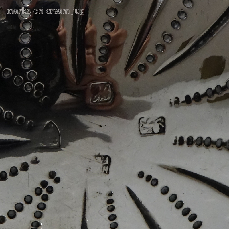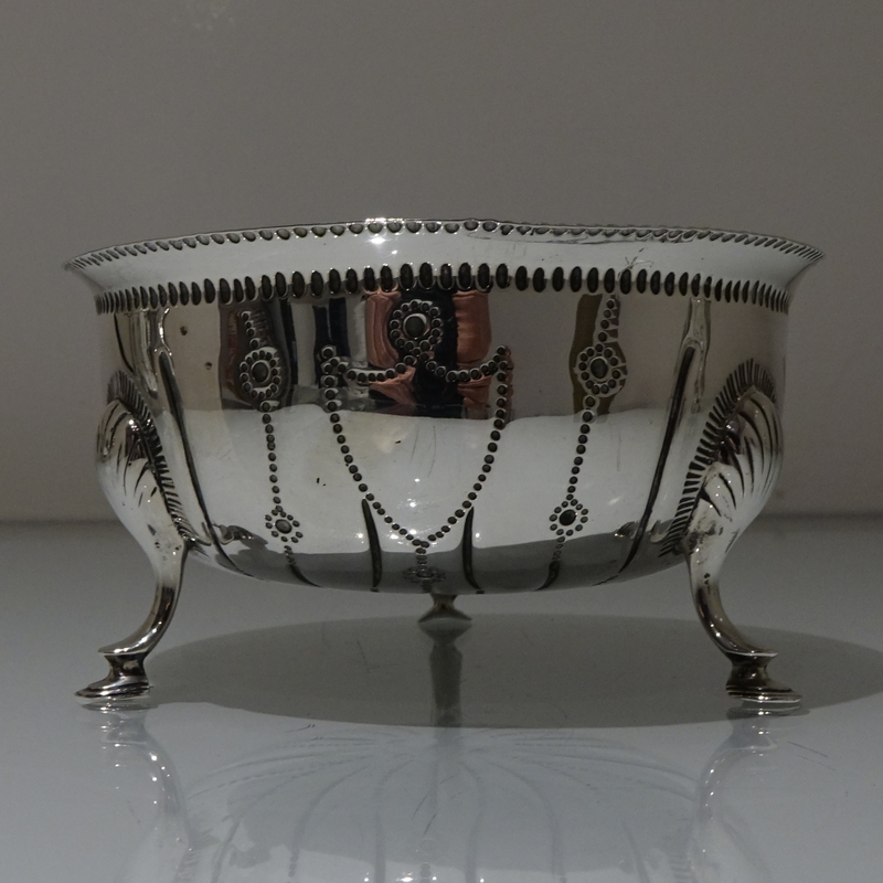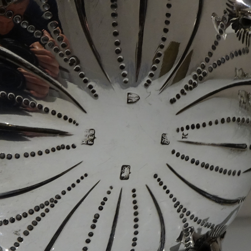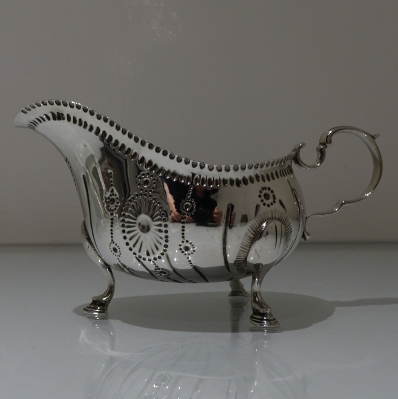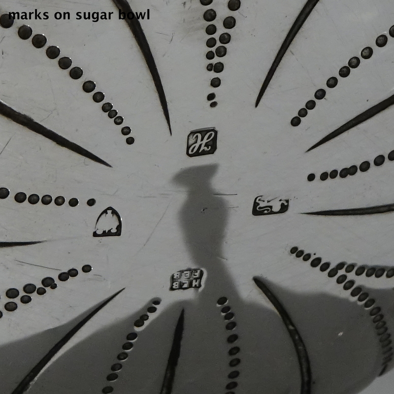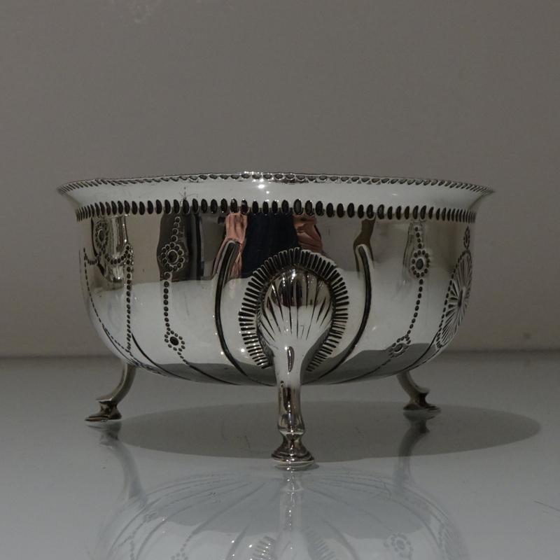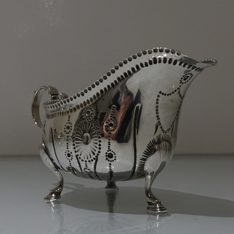 A beautiful and incredibly rare designed Edwardian three piece silver tea set decorated with waves of elaborate “pin prick” designs throughout.  The teapot sits on four ornate hooved peg feet and all pieces have stylish shielded shaped cartouches.