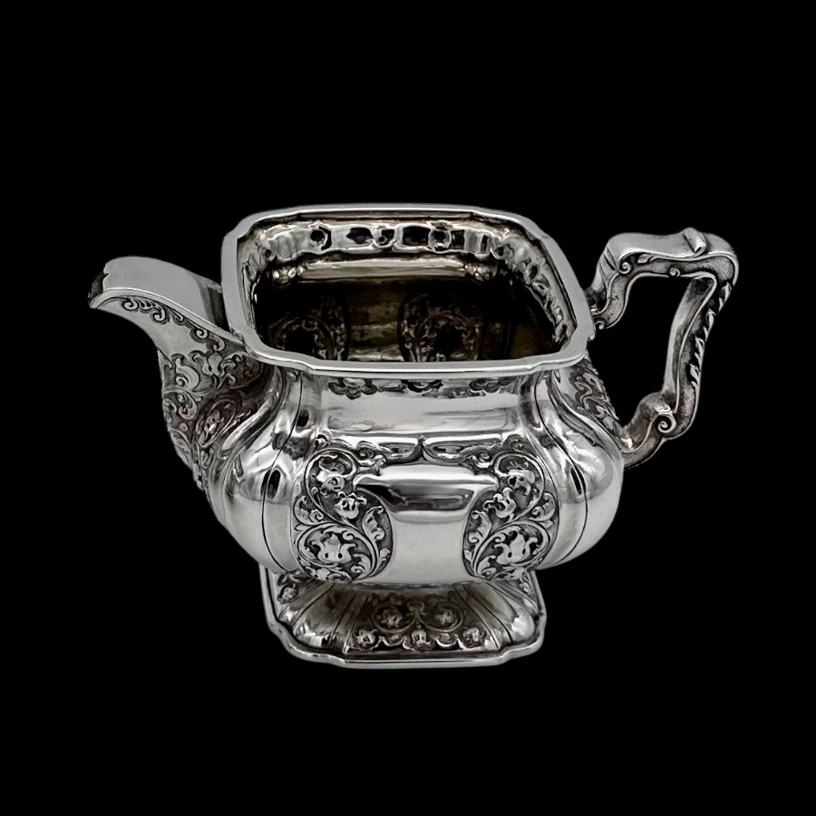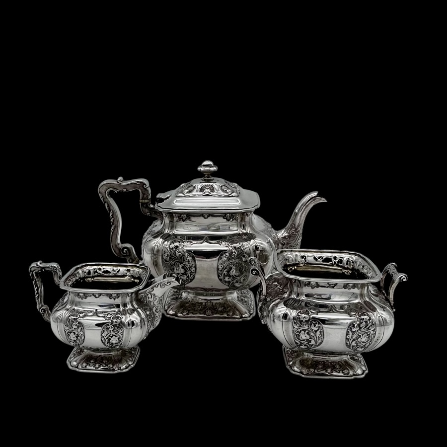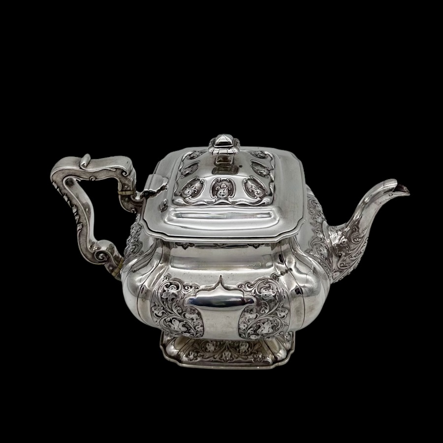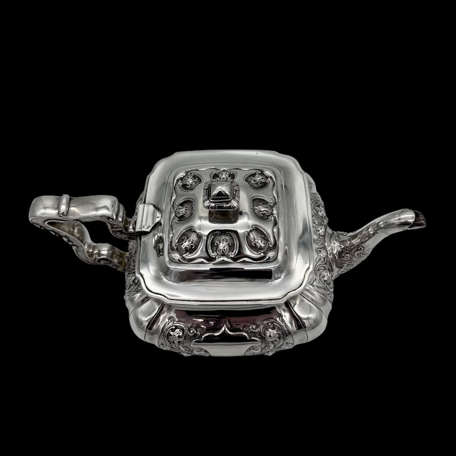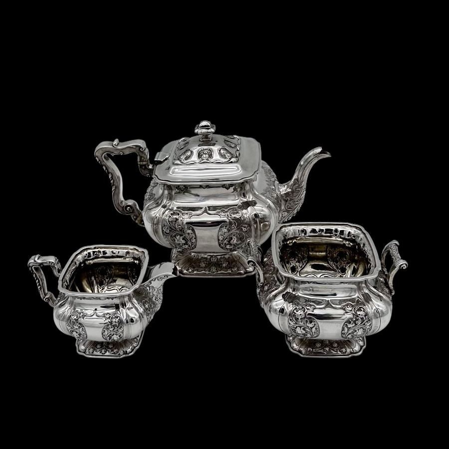 Wonderful Glasgow made sterling silver three piece teaset designed with shaped square bulbous bodies and beautiful ornate floral embellishing revolving around double sided shield cartouches.