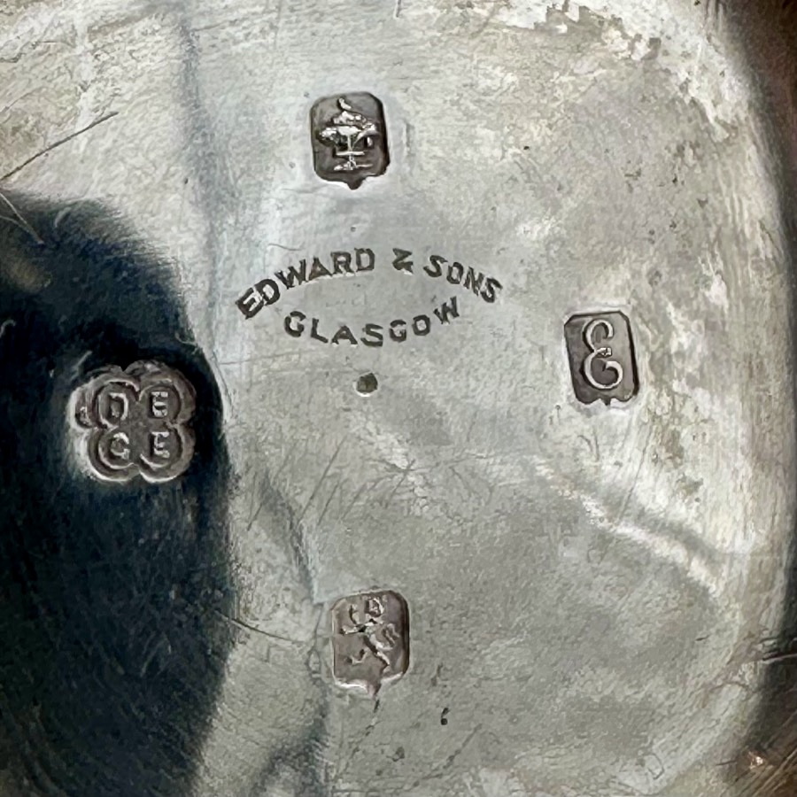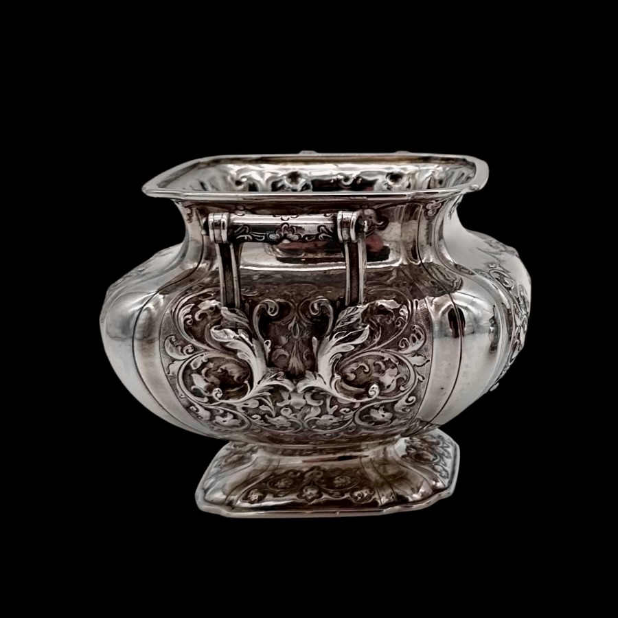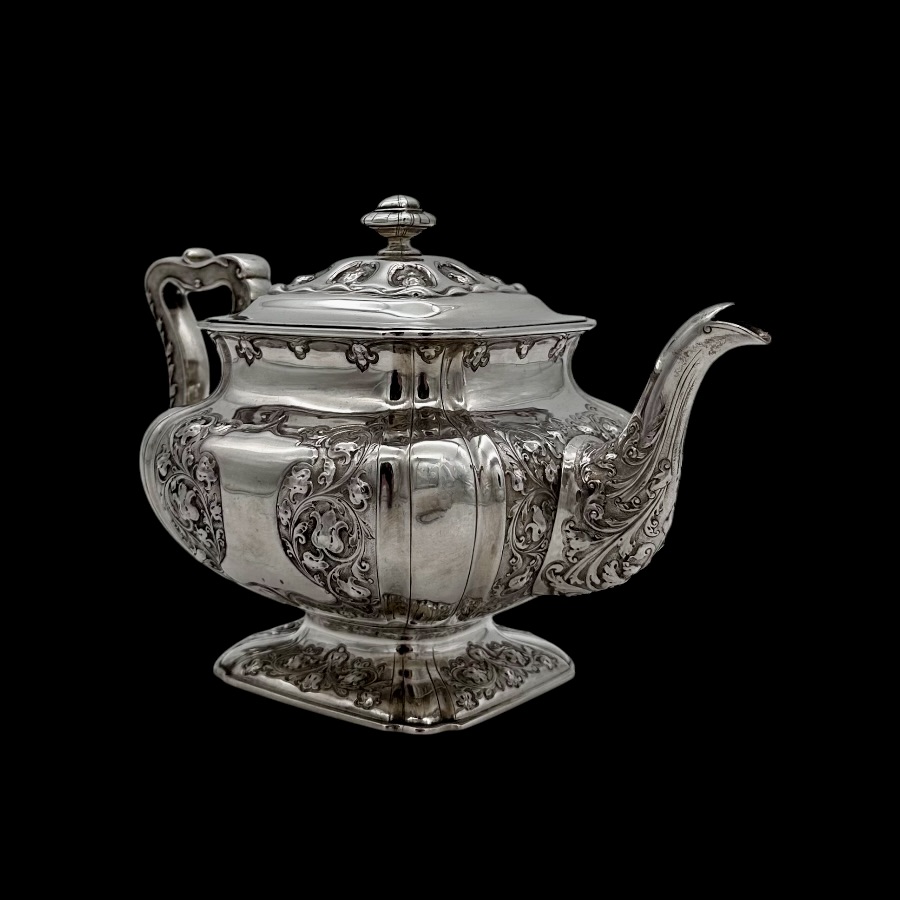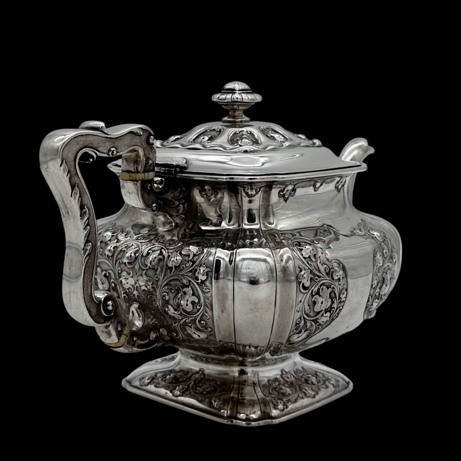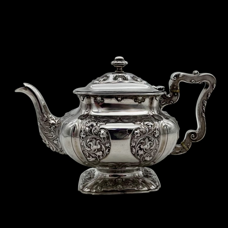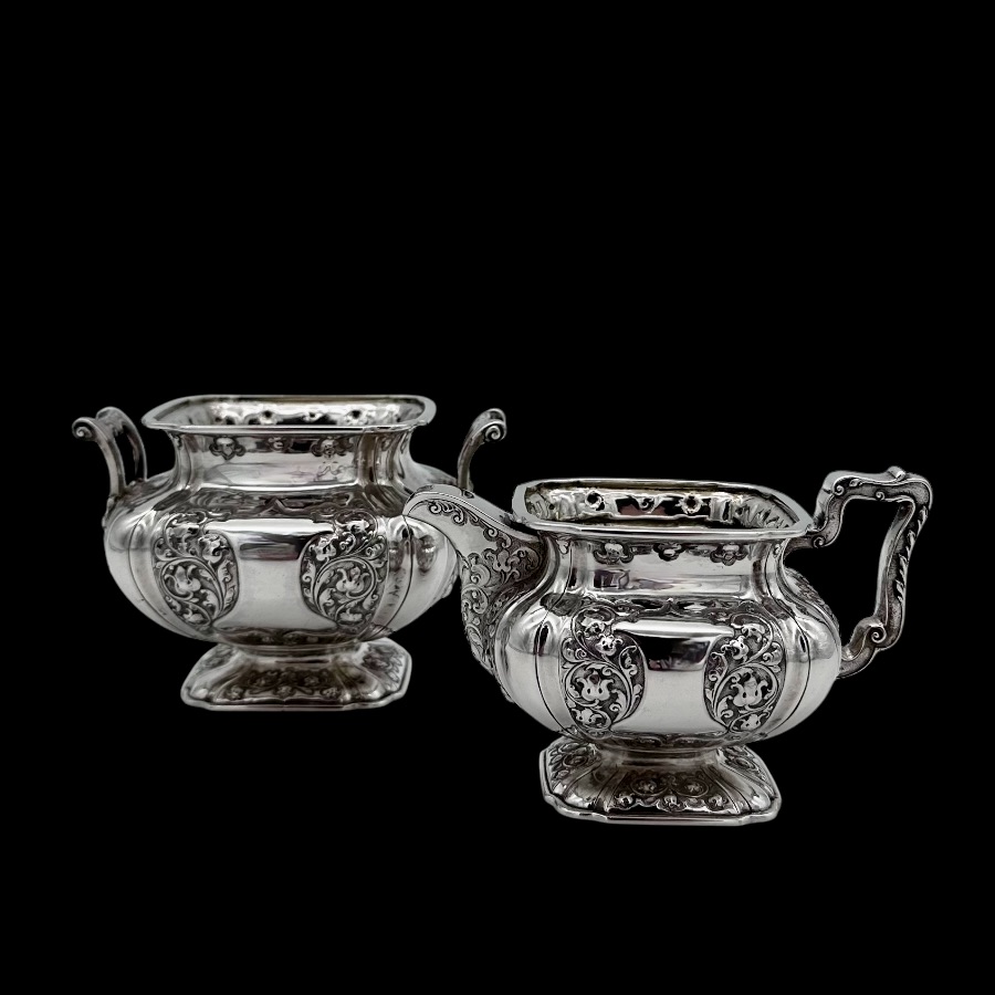 Wonderful Glasgow made sterling silver three piece teaset designed with shaped square bulbous bodies and beautiful ornate floral embellishing revolving around double sided shield cartouches.
