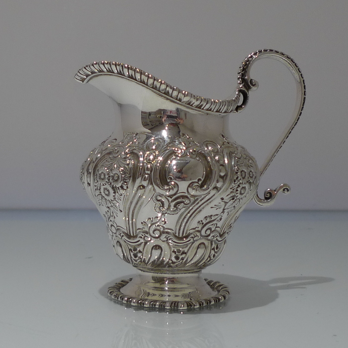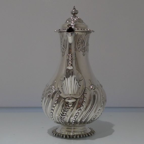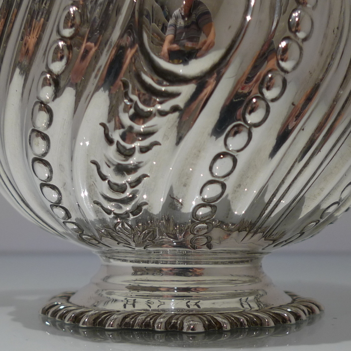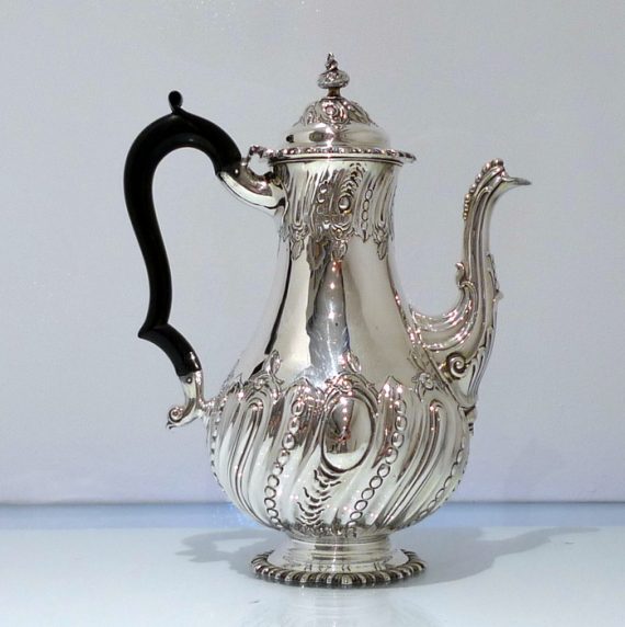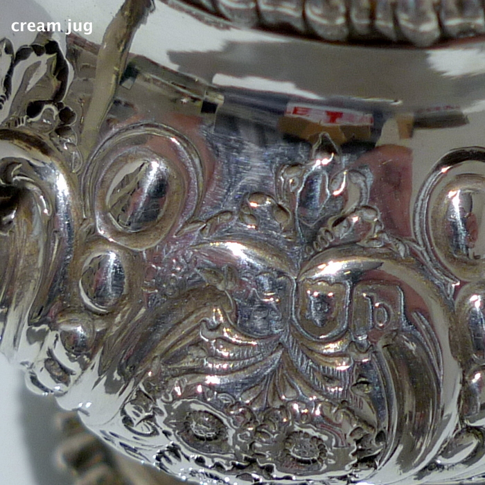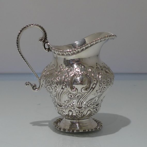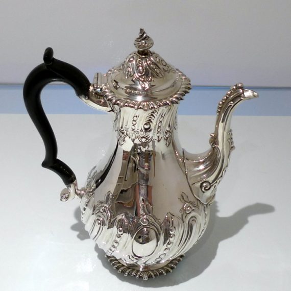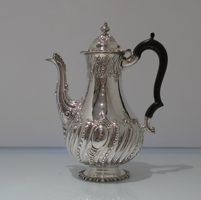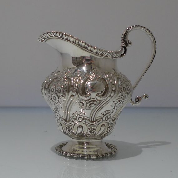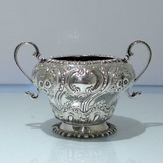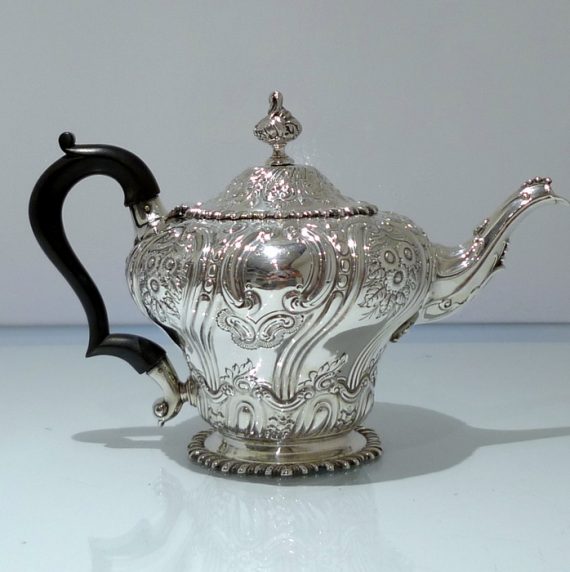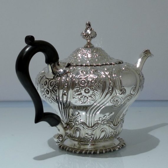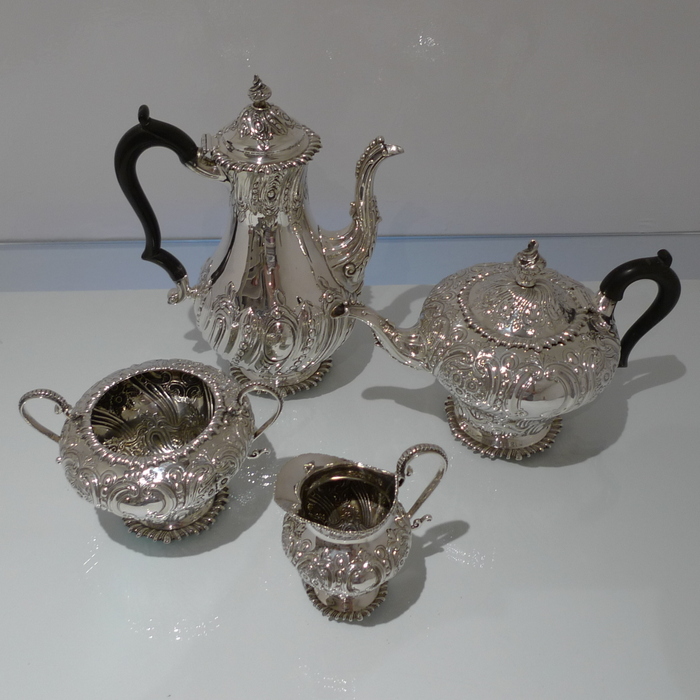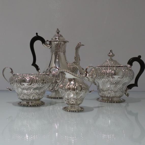 A stunning late Victorian four piece gadroon border teaset decorated with elegant swirl fluting and floral embossing. Â All pieces have elegant cartouches and sit on a circular spreading feet with additional gadroon decoration for lowlights.