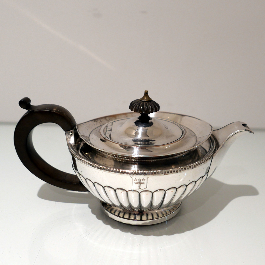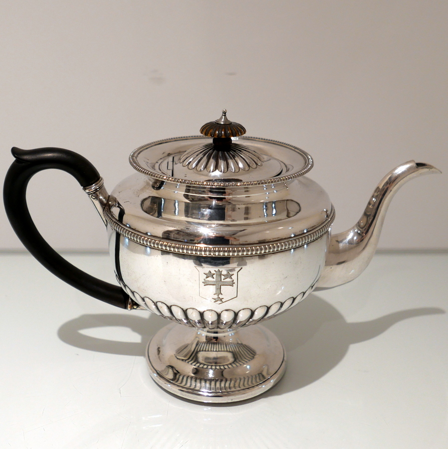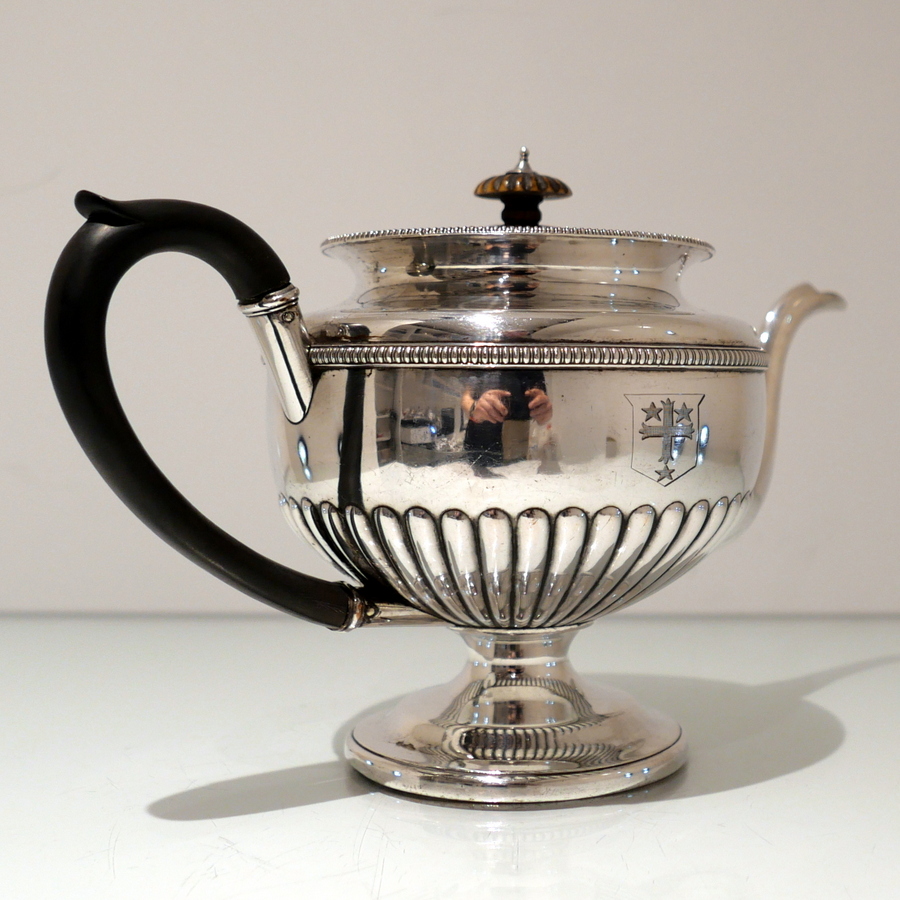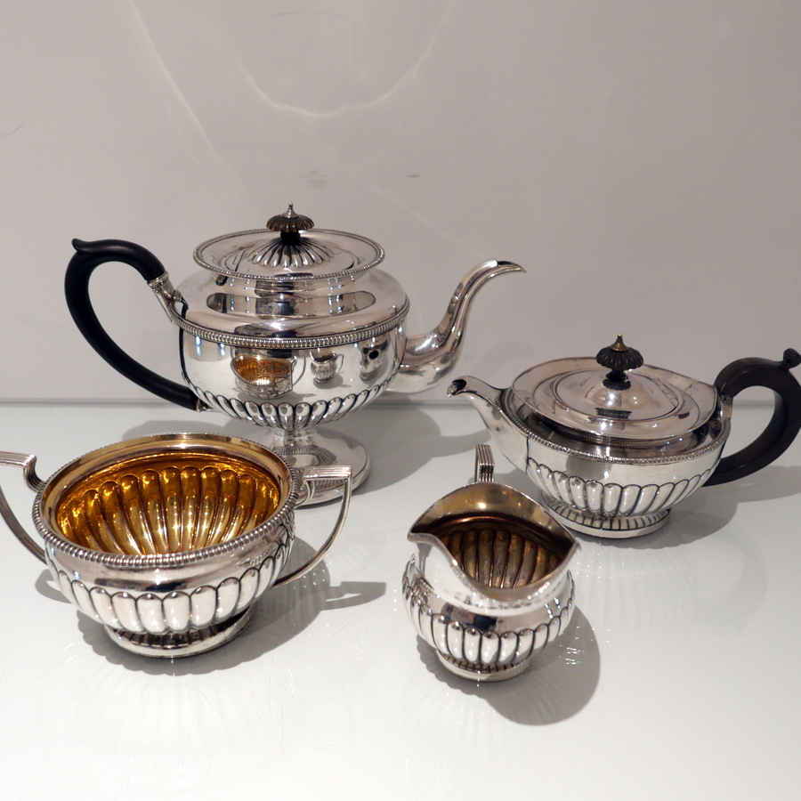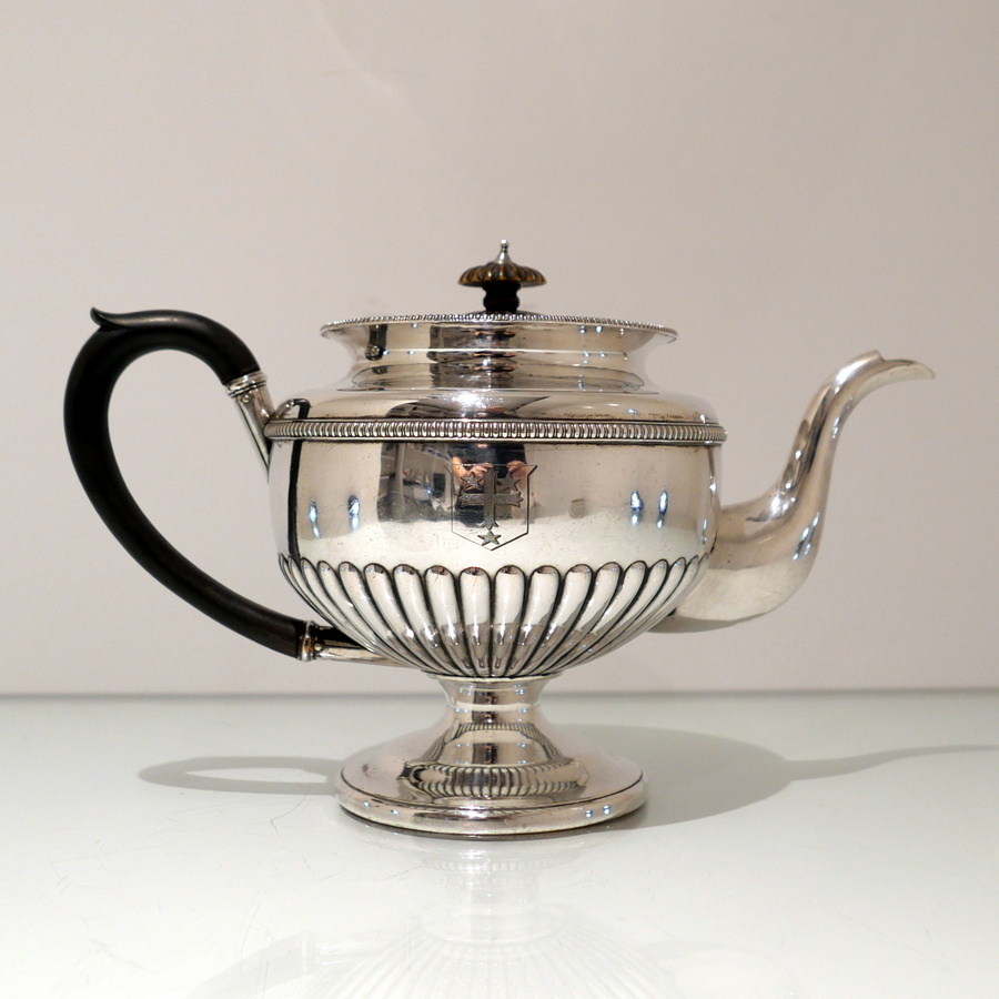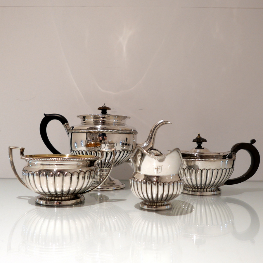 A highly collectable Matthew Boulton four piece tea and coffee set elegantly designed with half fluted bodies, gadroon borders and flush hinged domed lids. Â There is a contemporary engraved armorial for importance.