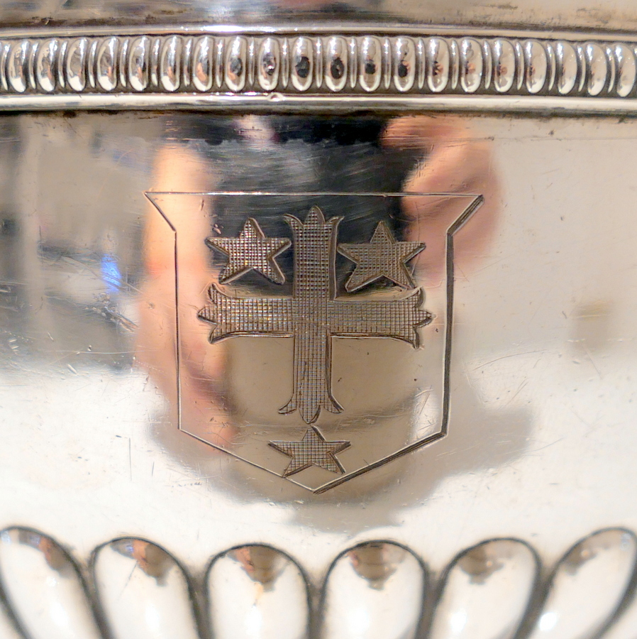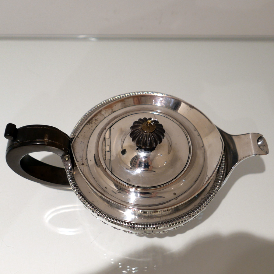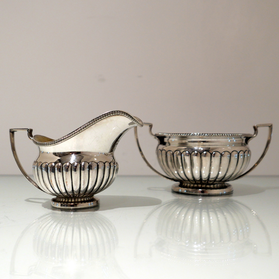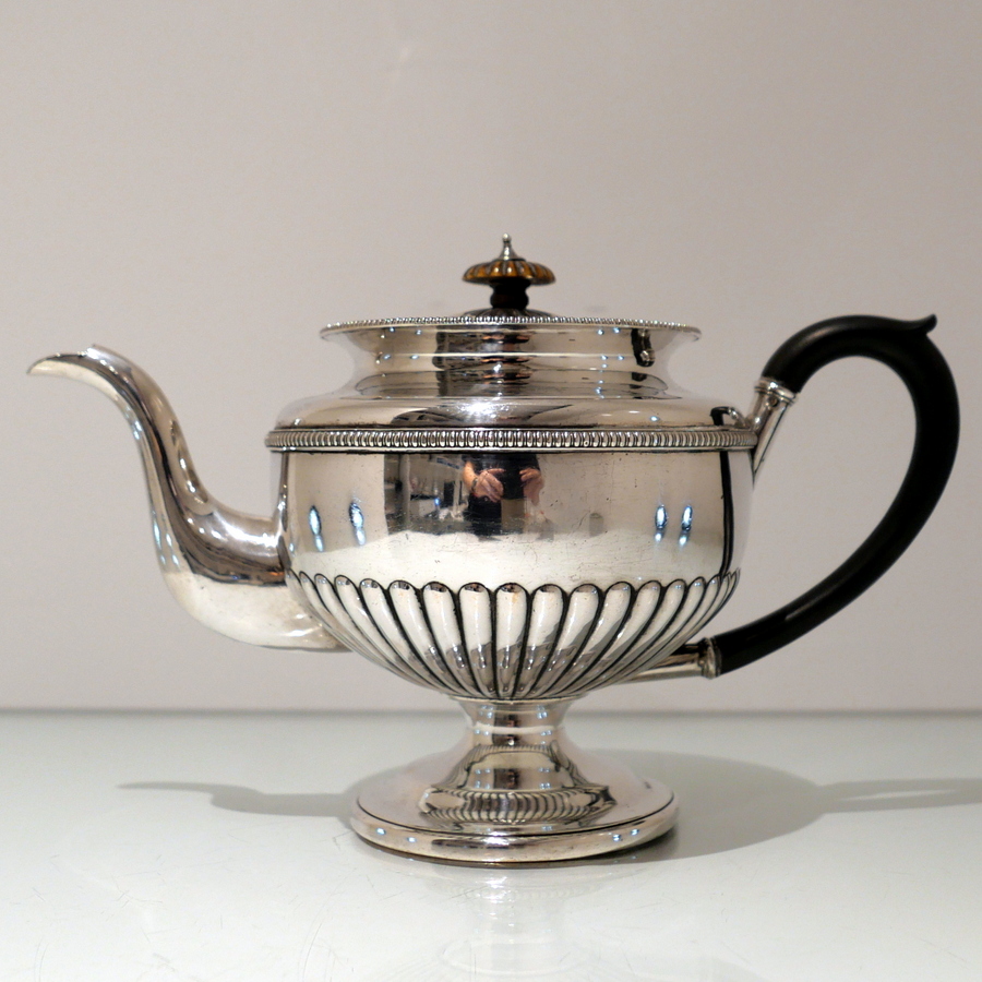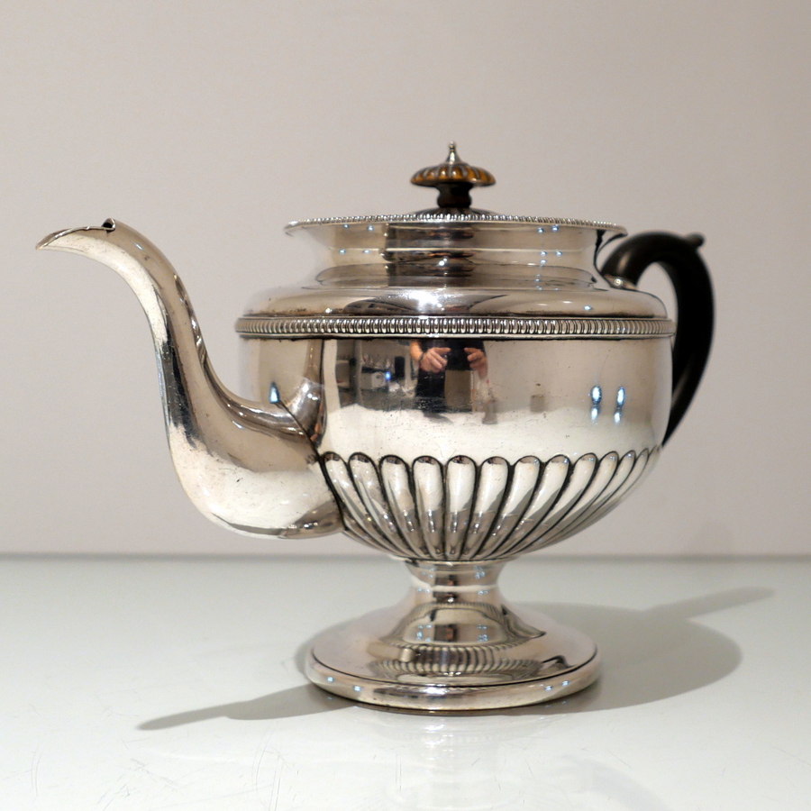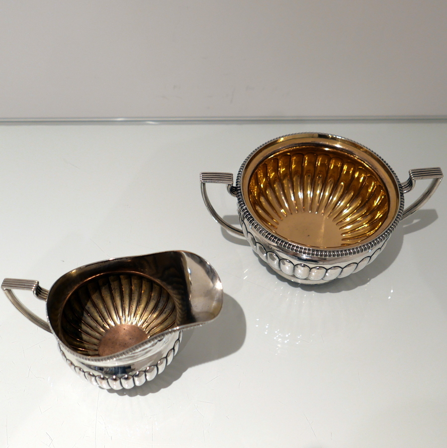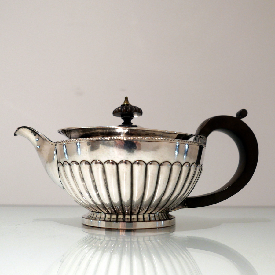 A highly collectable Matthew Boulton four piece tea and coffee set elegantly designed with half fluted bodies, gadroon borders and flush hinged domed lids. Â There is a contemporary engraved armorial for importance.