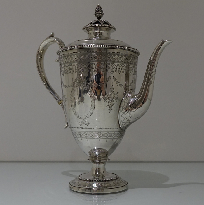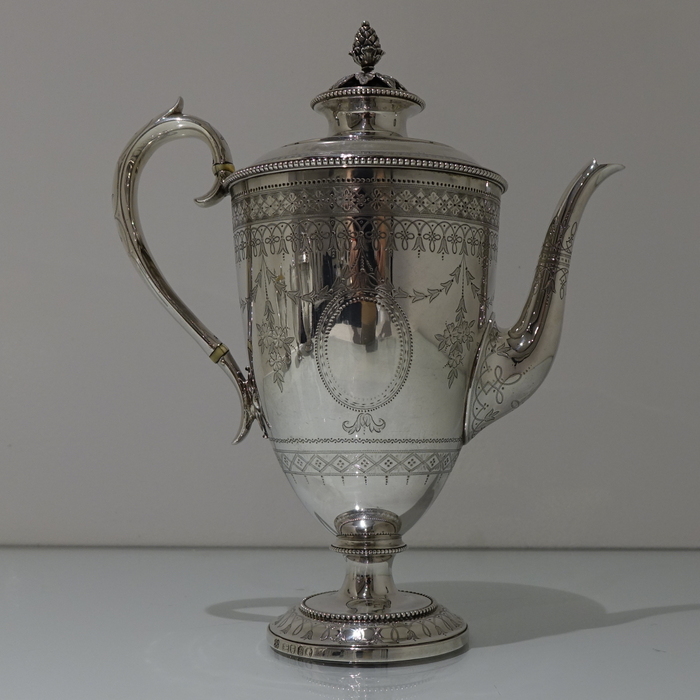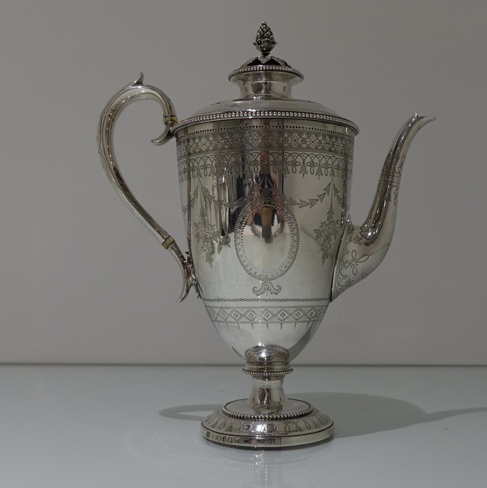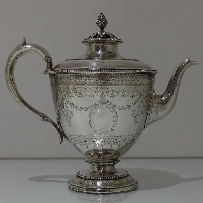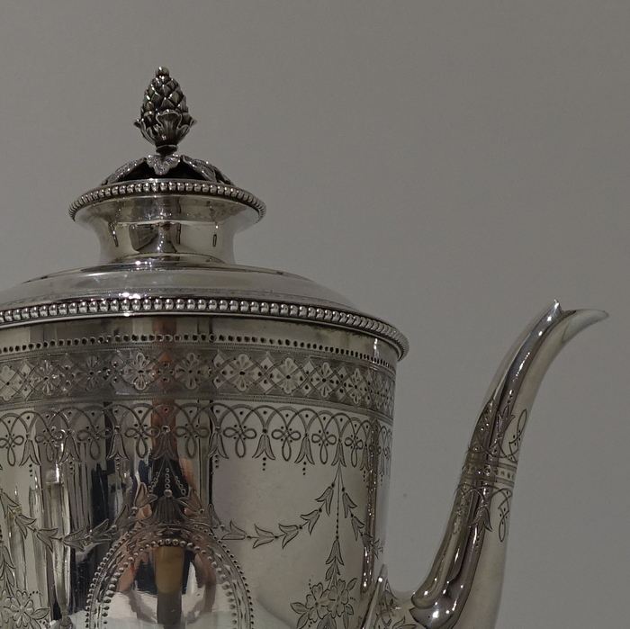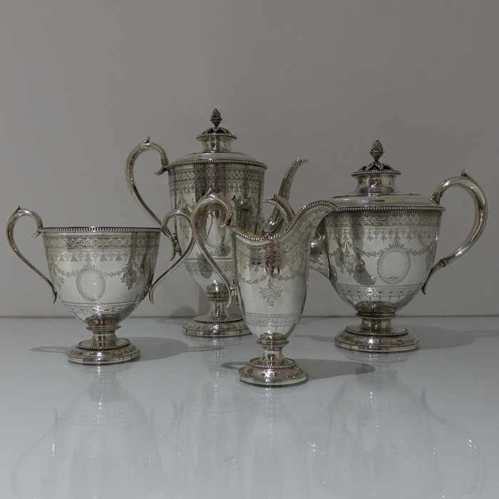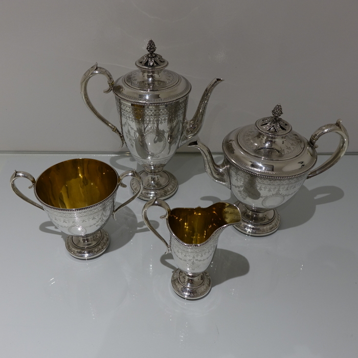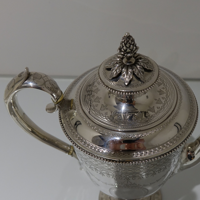 An extremely rare and incredibly beautiful Victorian tea and coffee set decorated with bead borders and intricate hand engraving. Â The lids on the tea and coffee pots are hinged and are crowned with stylish silver acorn finials.