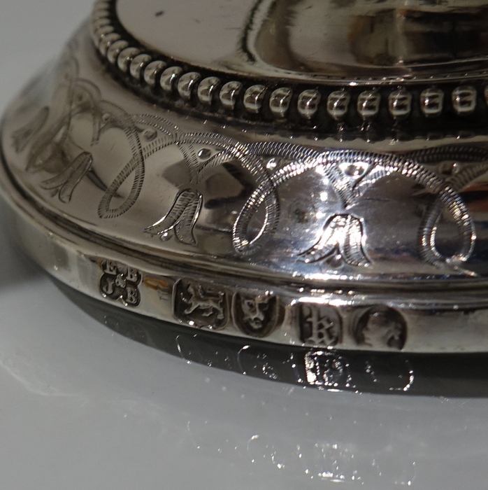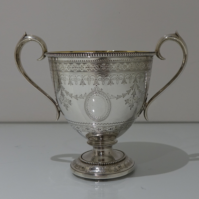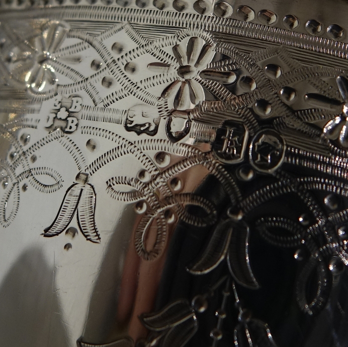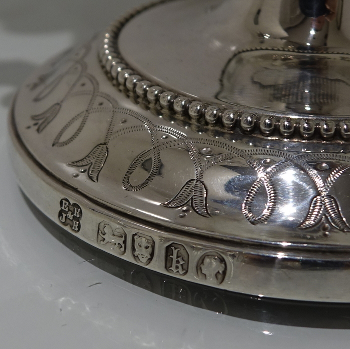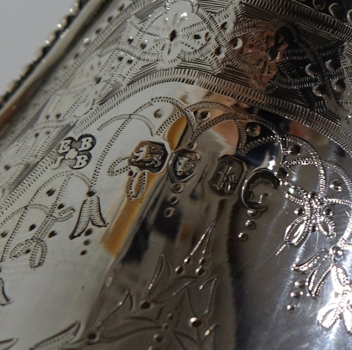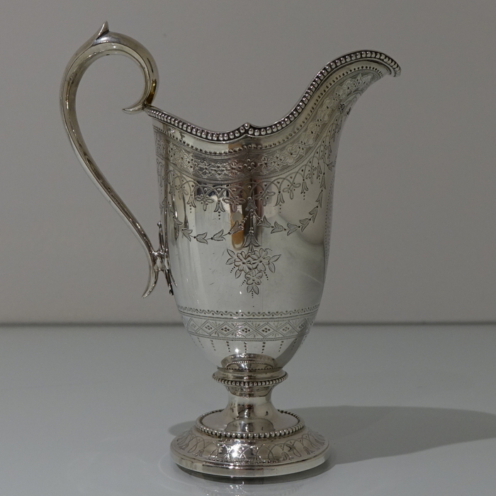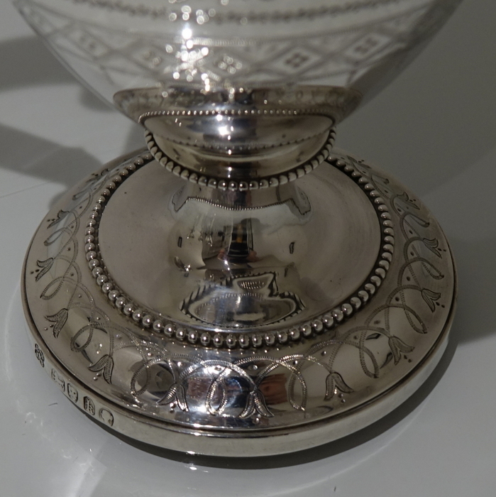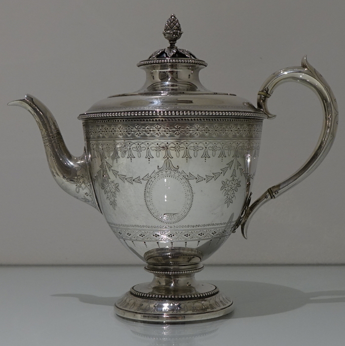 An extremely rare and incredibly beautiful Victorian tea and coffee set decorated with bead borders and intricate hand engraving. Â The lids on the tea and coffee pots are hinged and are crowned with stylish silver acorn finials.