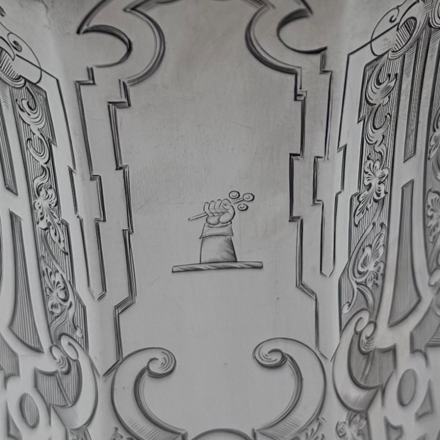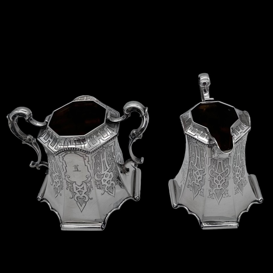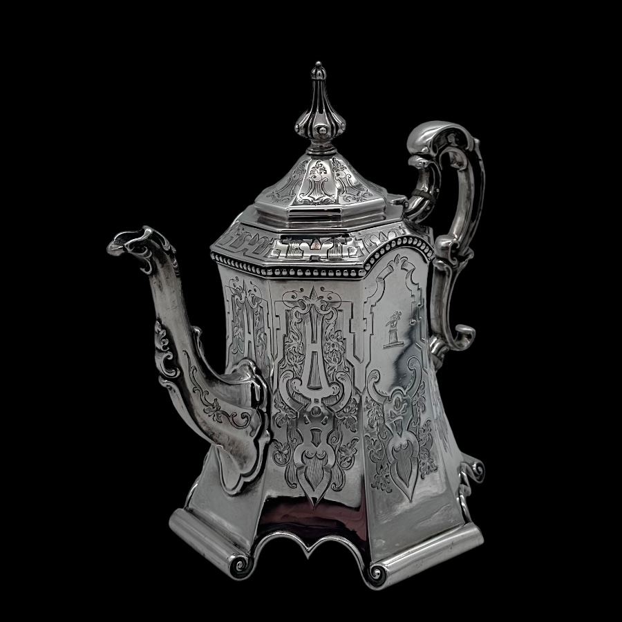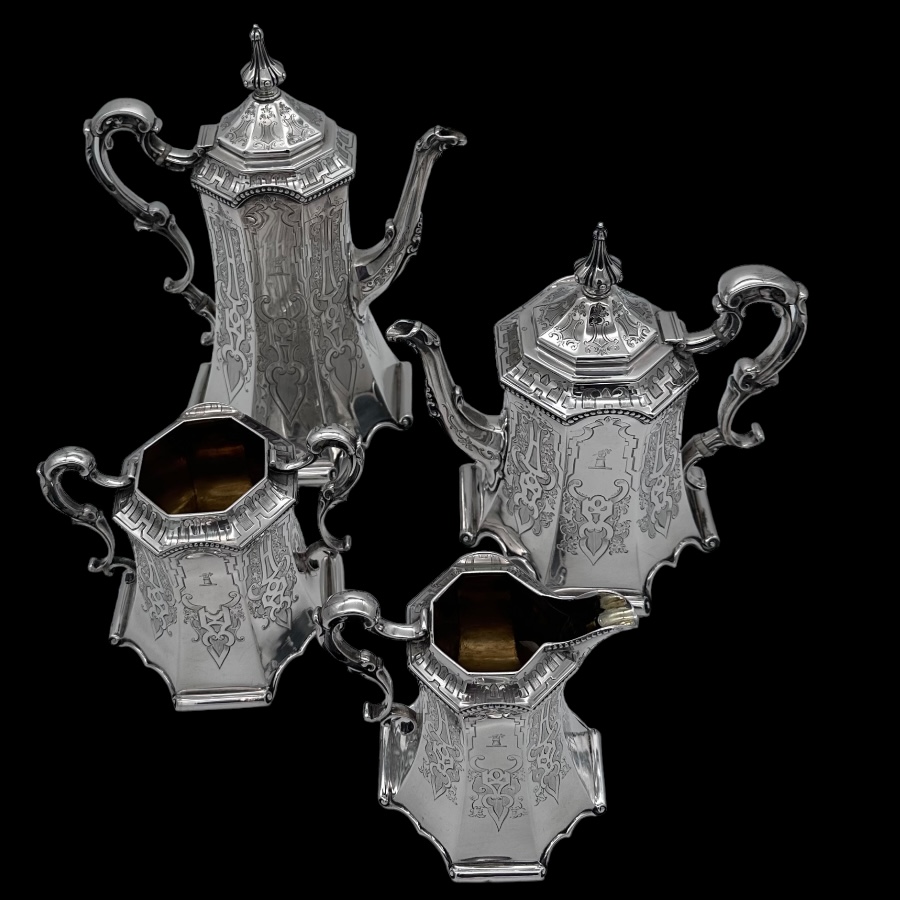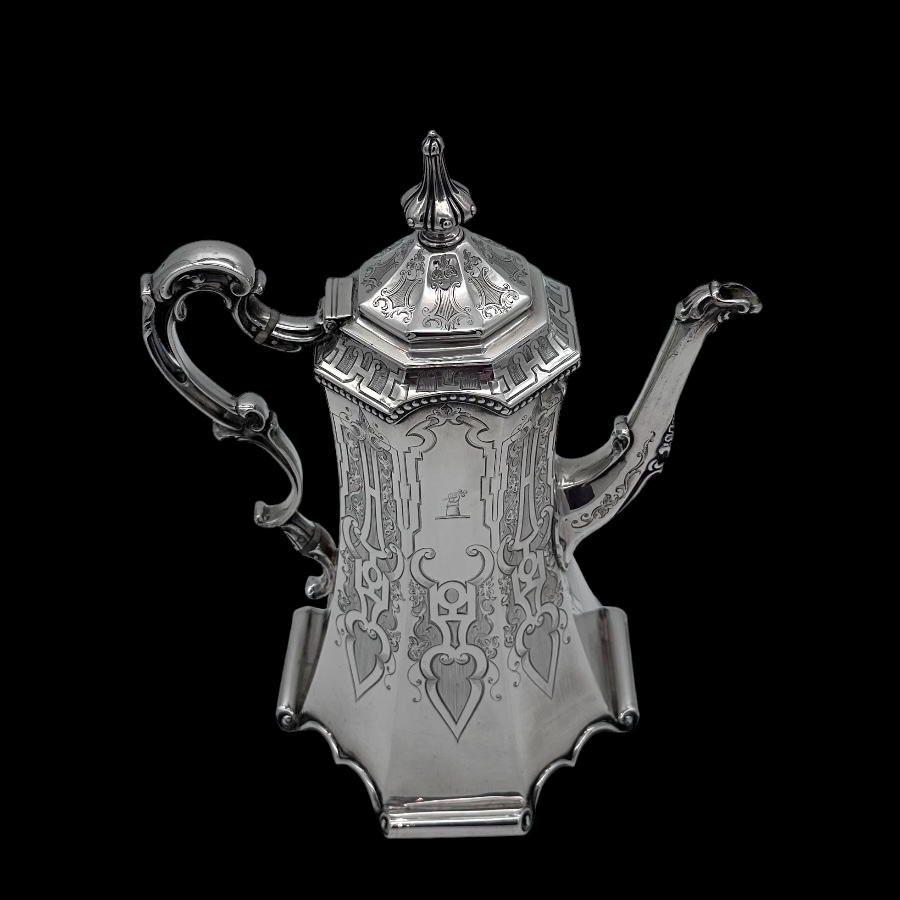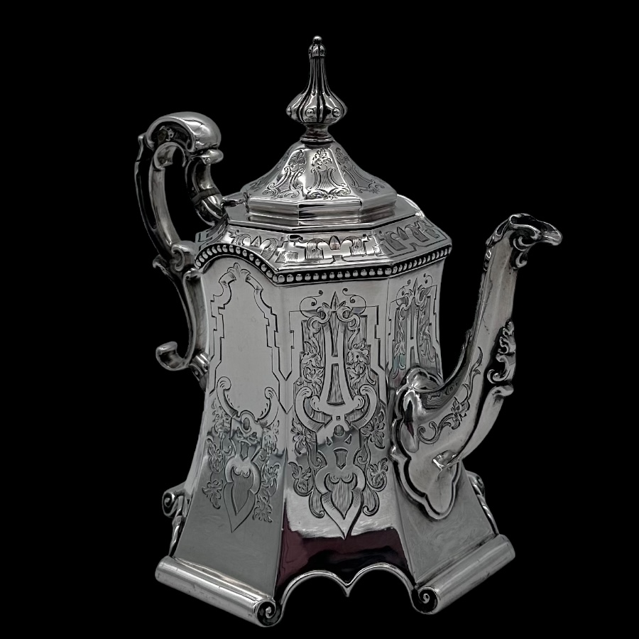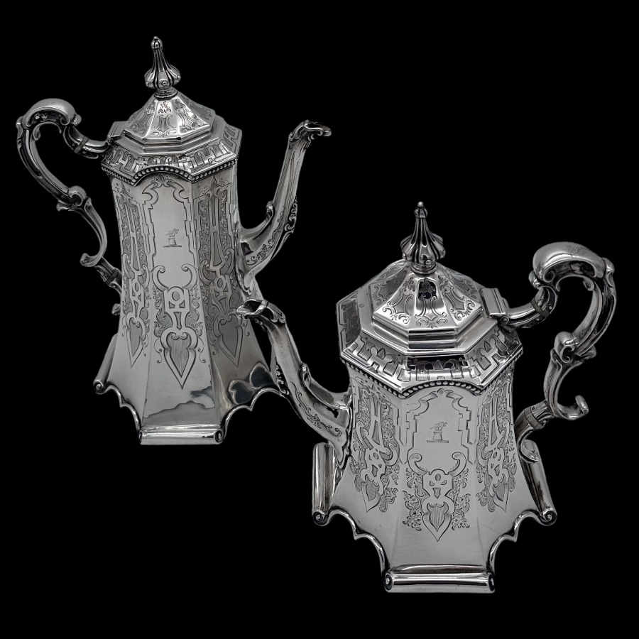 Truly fabulous cathedral style sterling silver tea and coffee service hand engraved with beautiful gothic etching and bearing stylish orginal crests for importance.