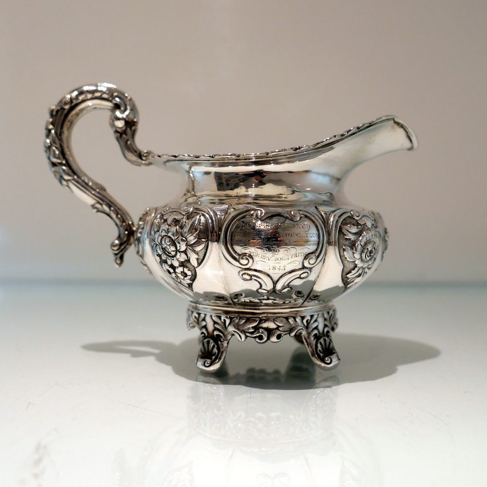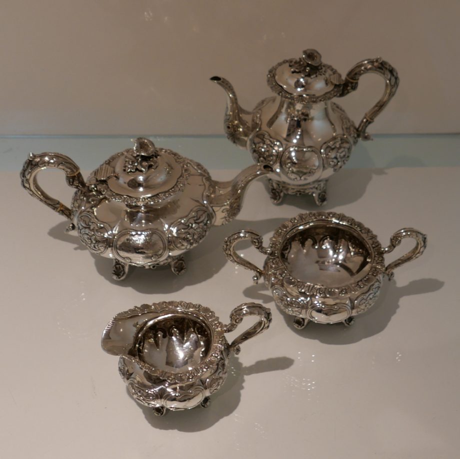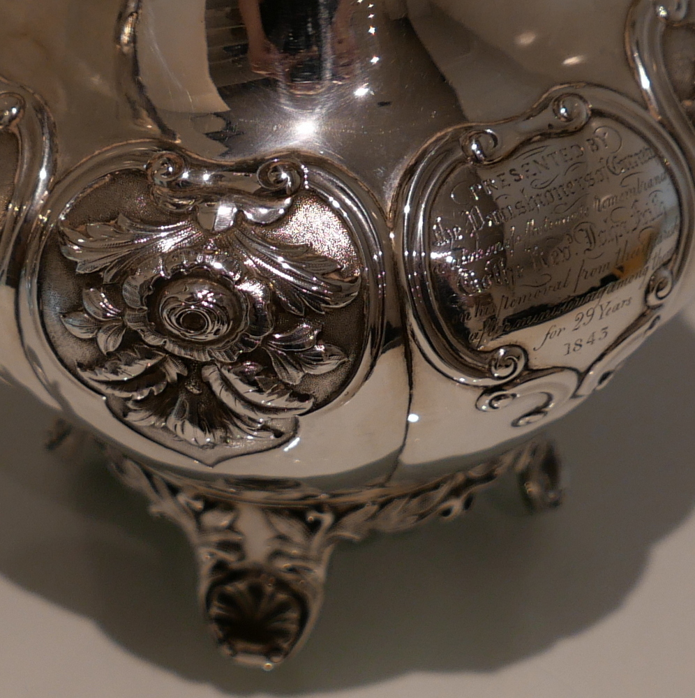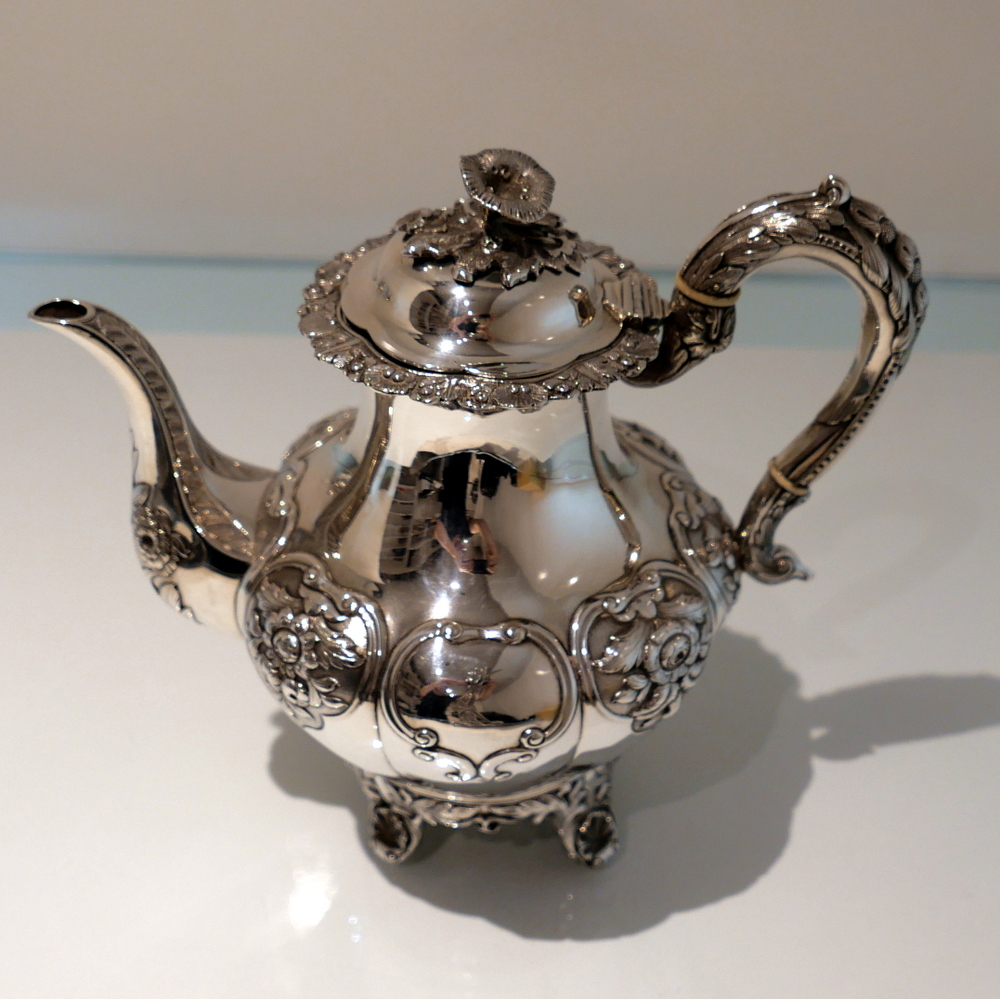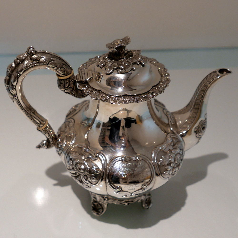 A beautiful “melon” shaped early Victorian Dublin made four piece tea and coffee set decorated with elegant framed floral cartouches. Â The handle and spout have additional elegant floral decoration and stylish contemporary inscriptions and crests for importance.
